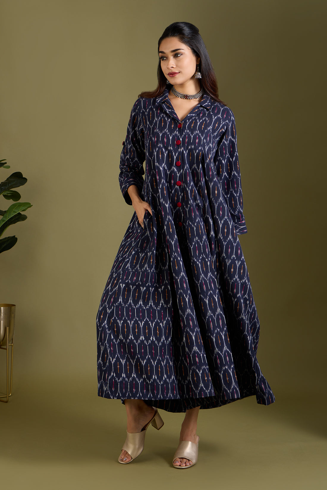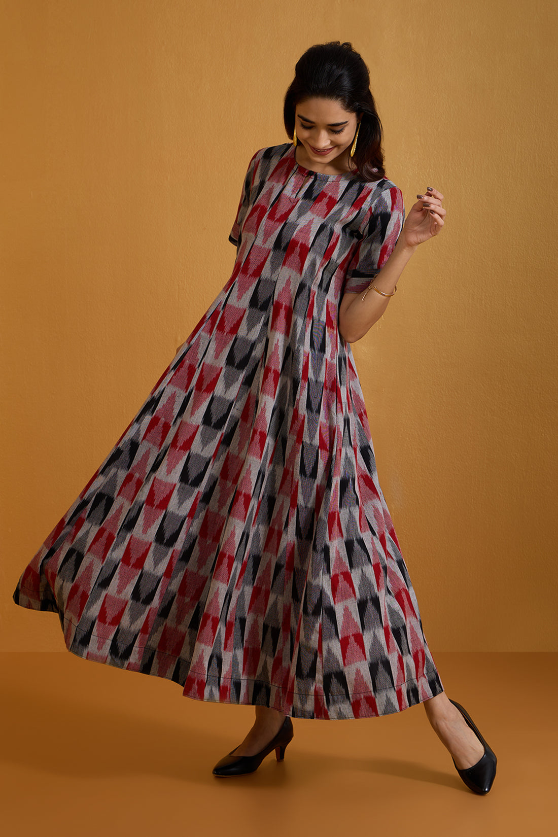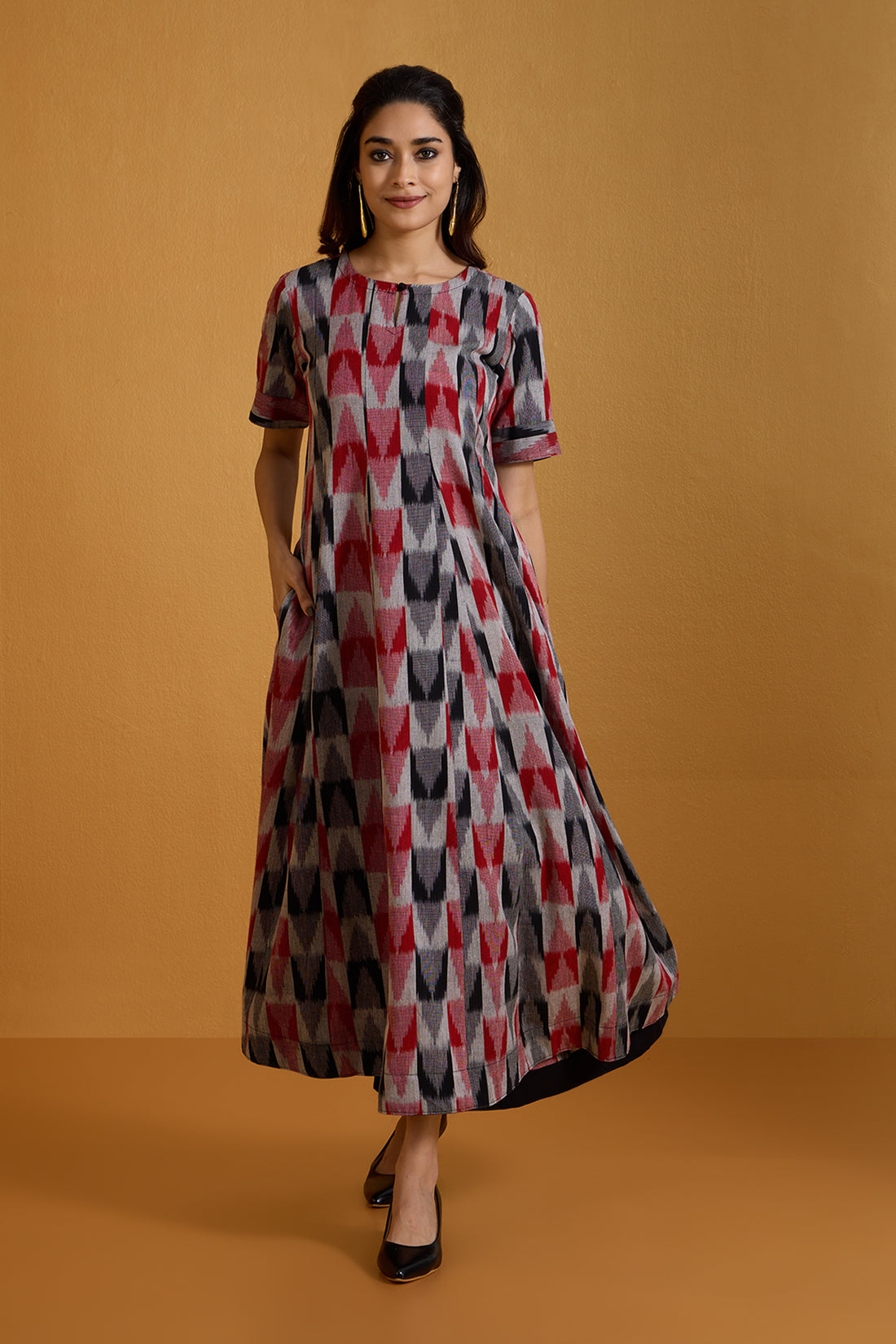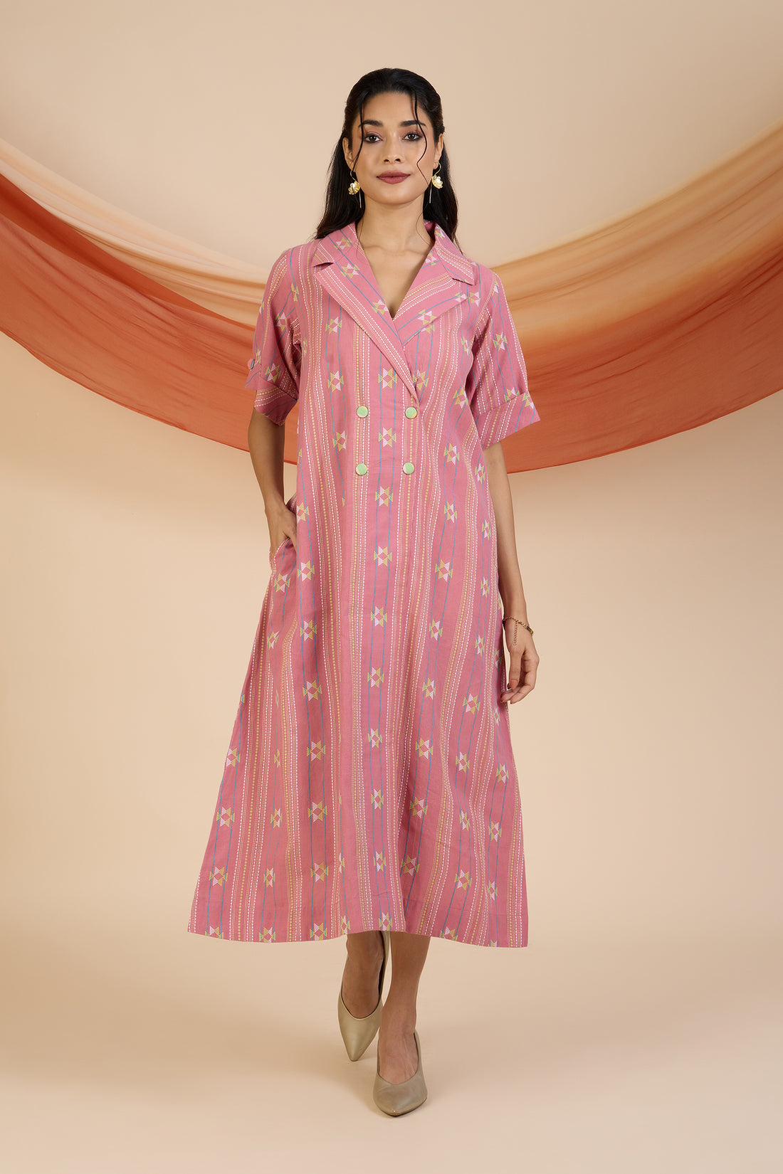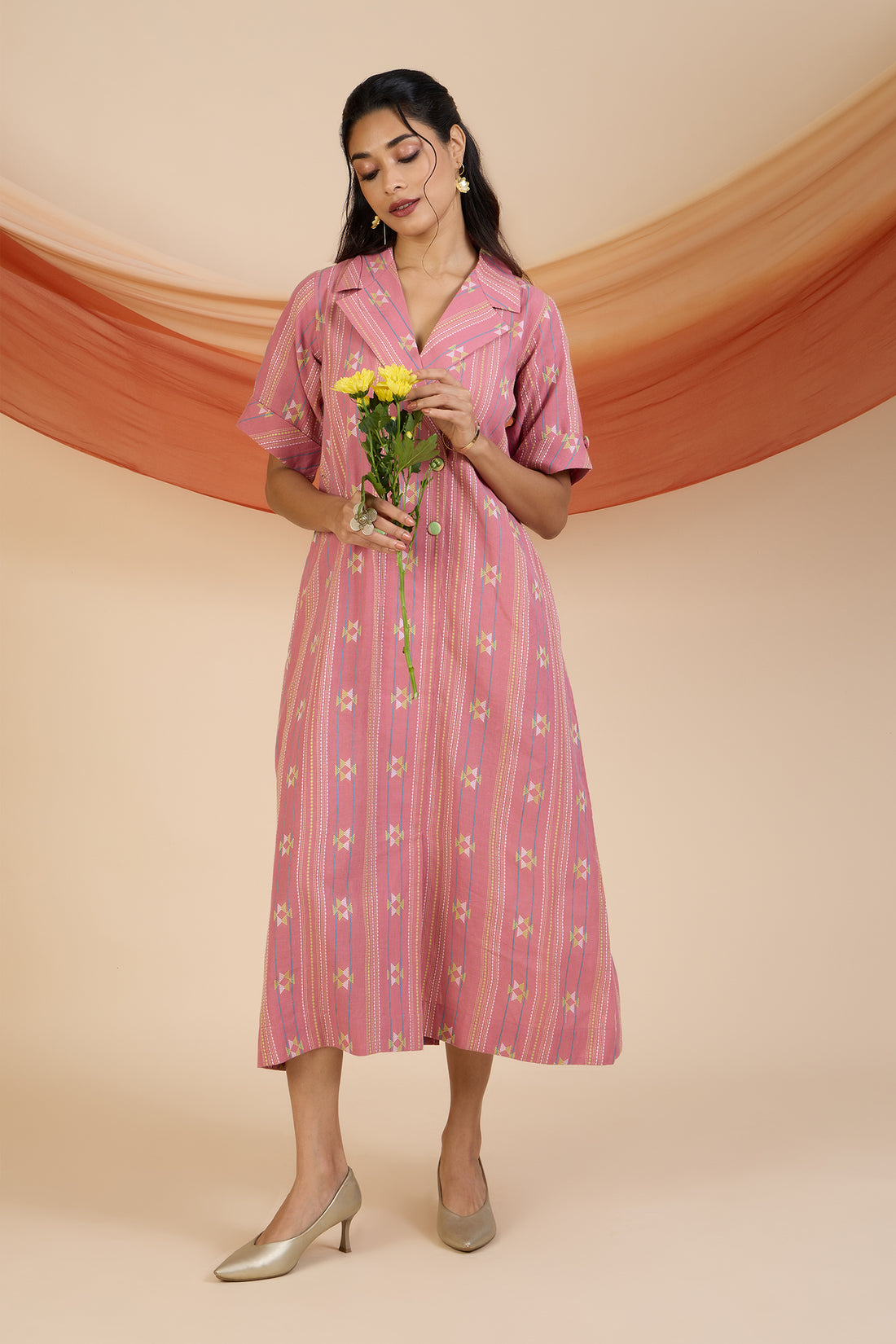 Ash Rose Cotton Ikat Box Pleat Button Down Shirt Dress