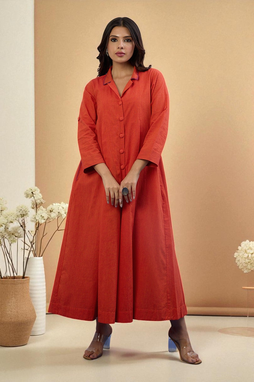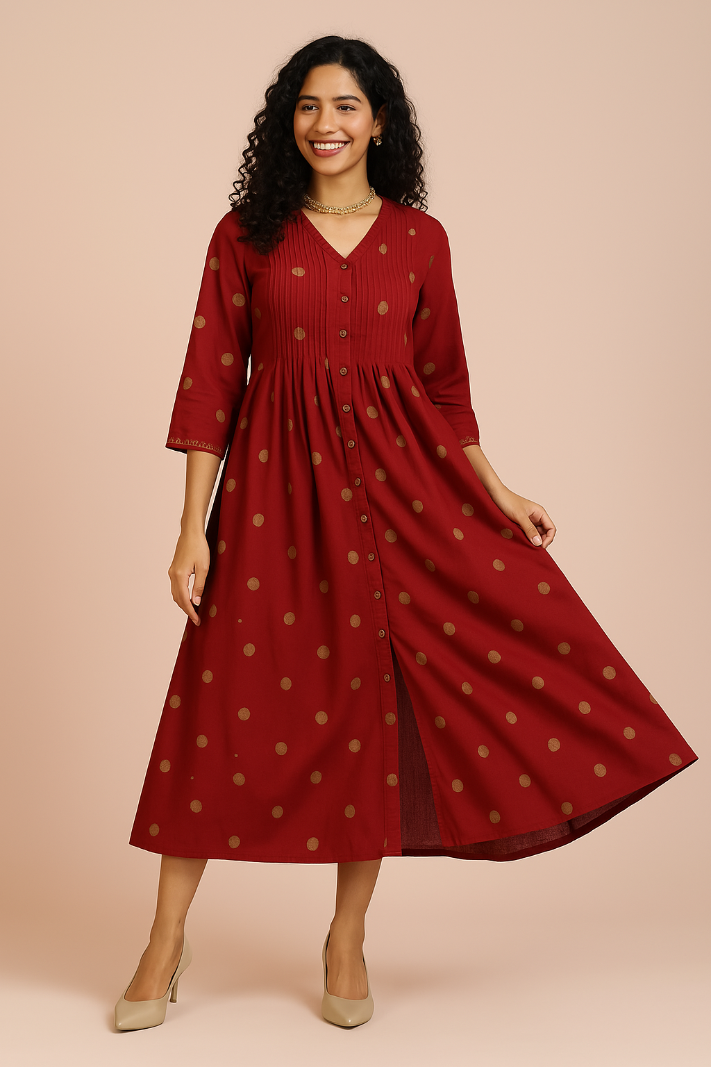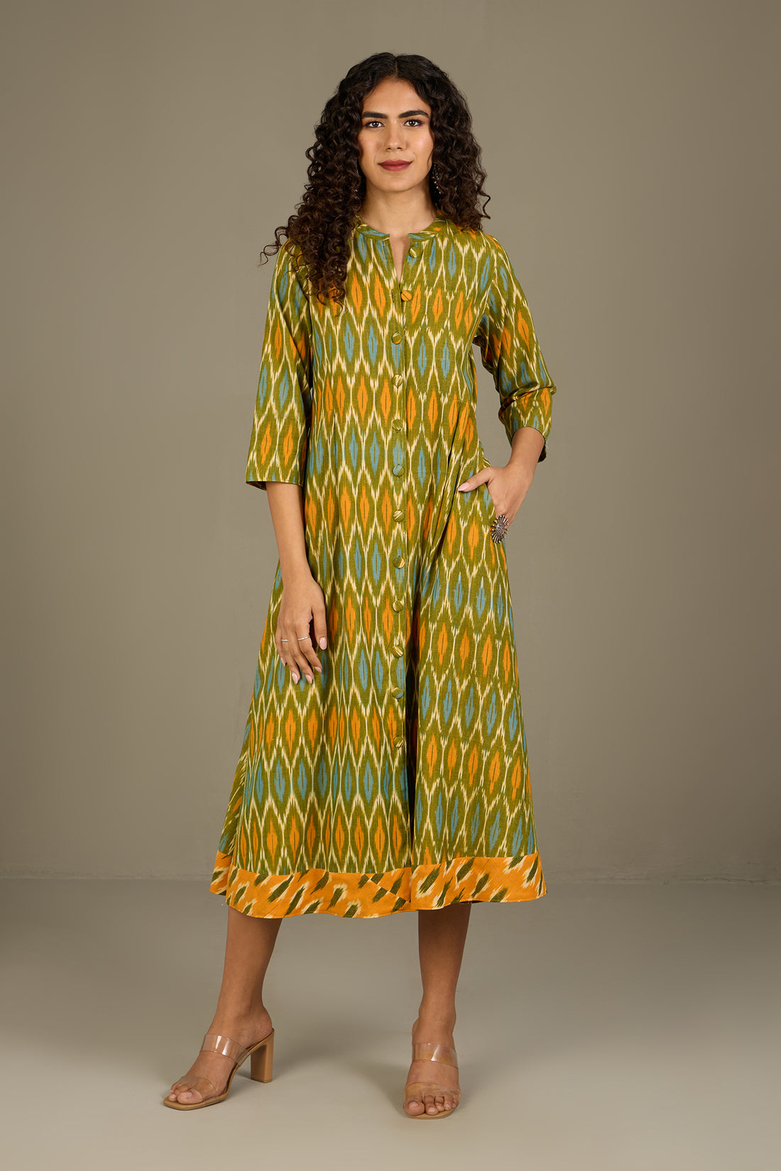 Olive Merlot Front Button Cotton Dress With Ruffle Border