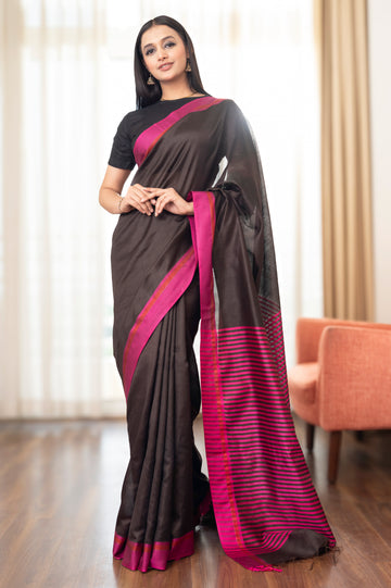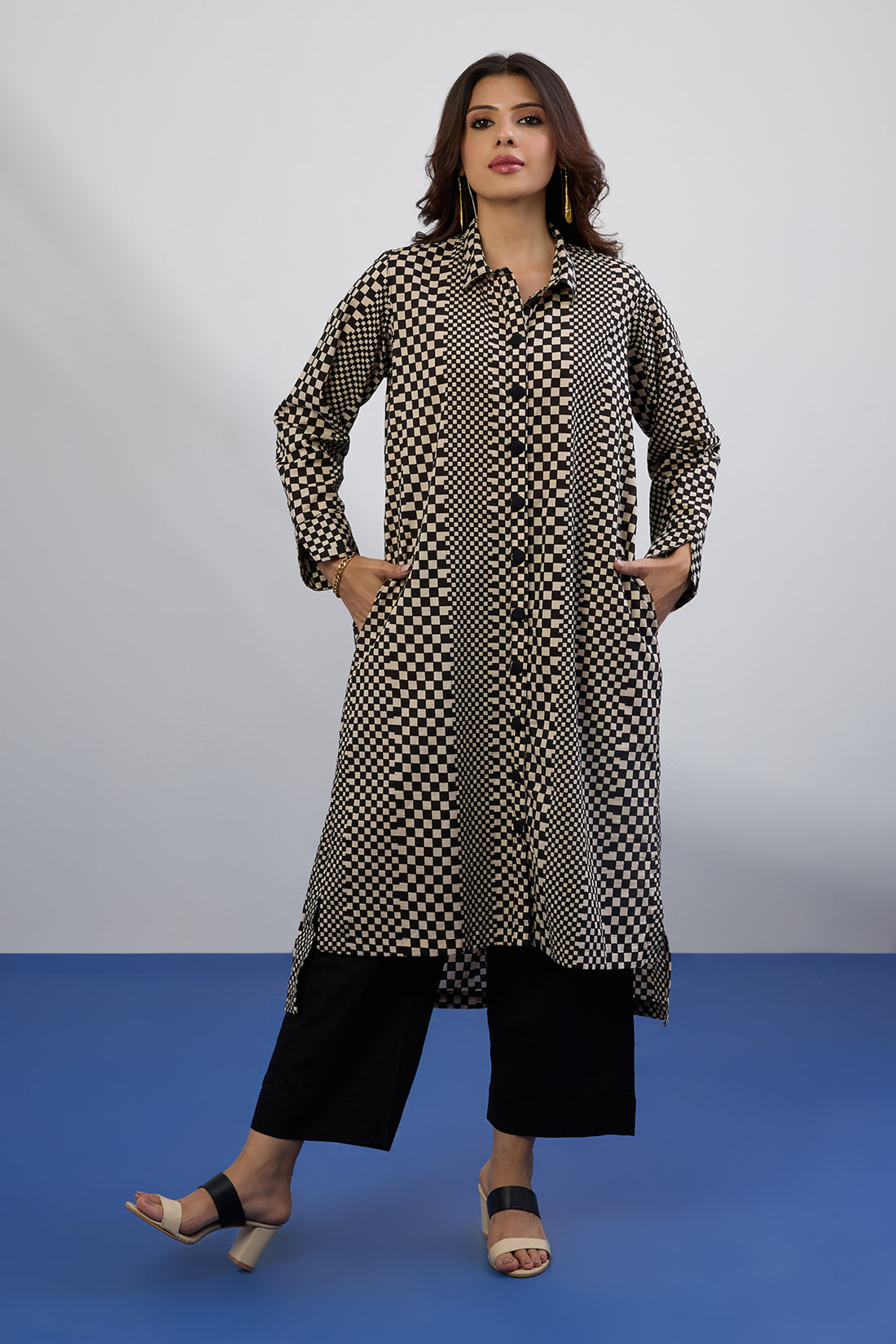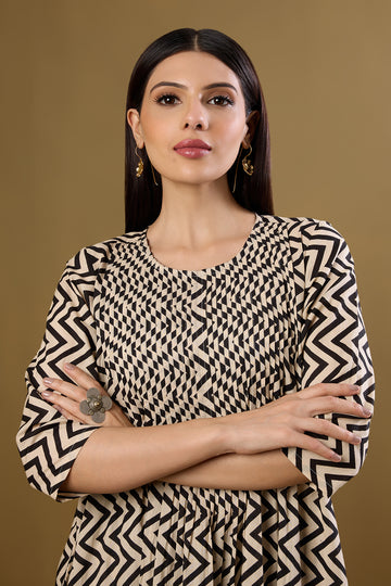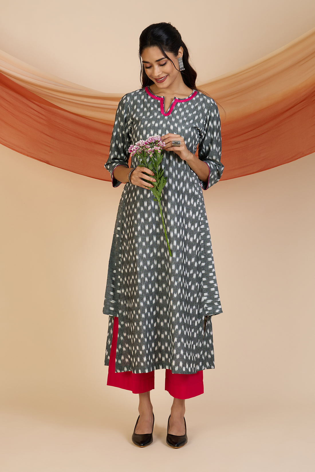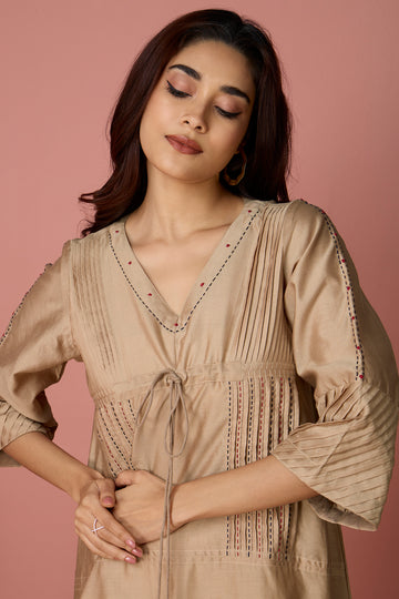 Mocha Dusk & Silver Scatter Cotton Kurta with Smocked Cuff & Tassels