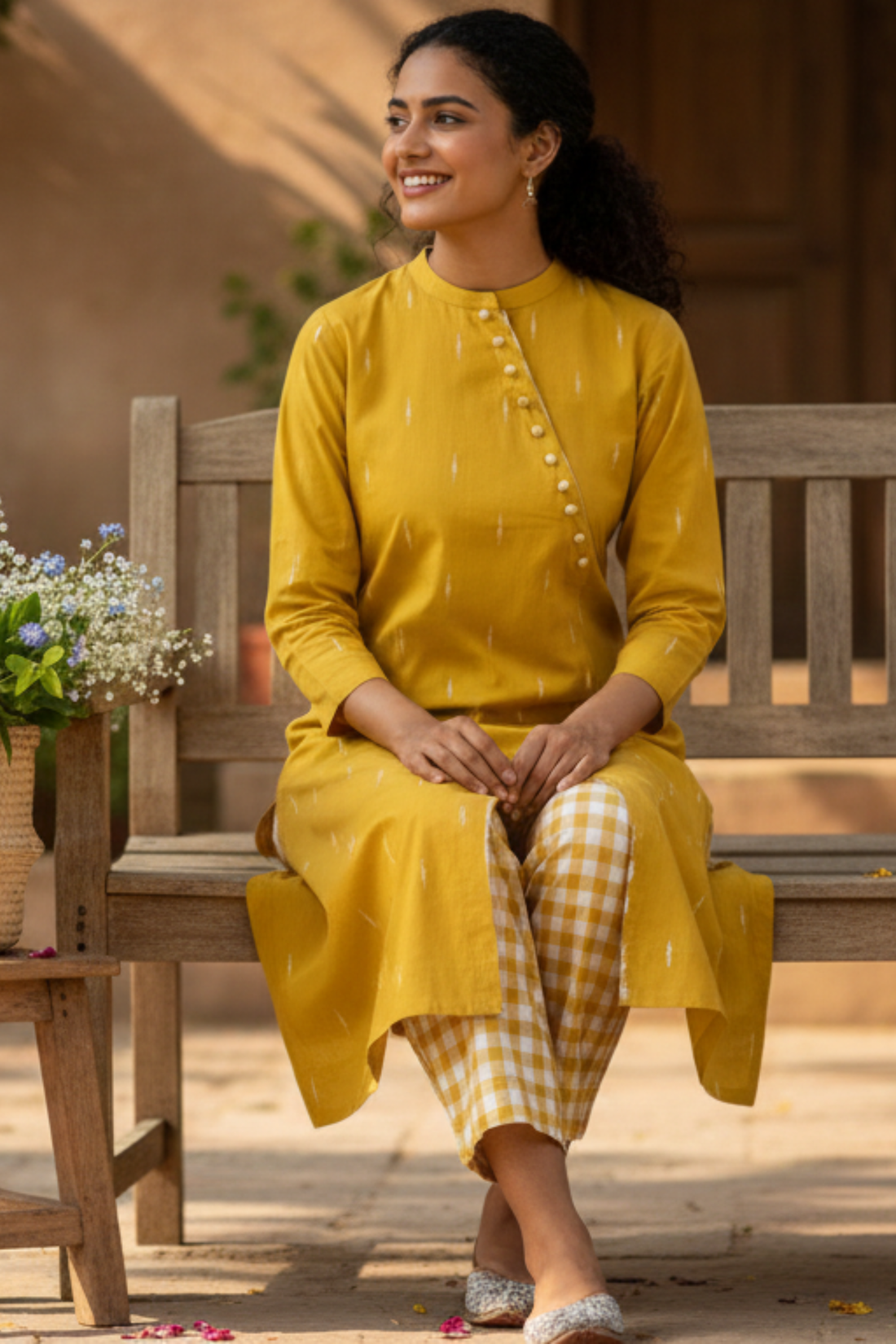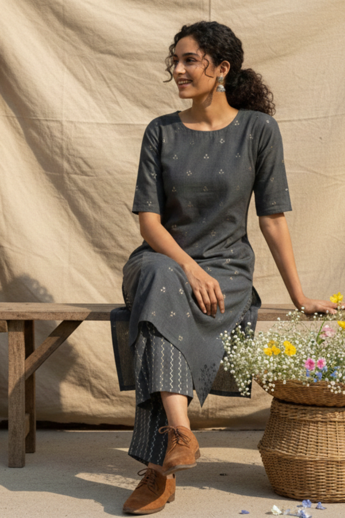 Co-ord Set Slate Triangle Weave Cotton Side Button Adjustable Slit Kurta & Pants