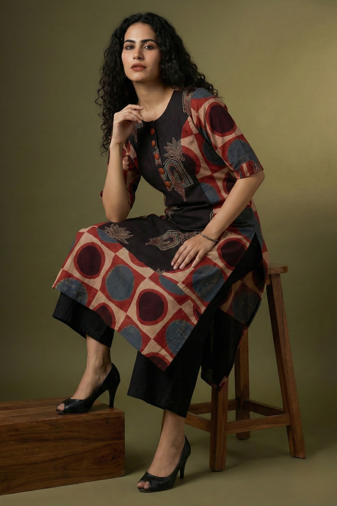 Red Moon Polka Ajrakh Long Panelled Kurta with Slit
