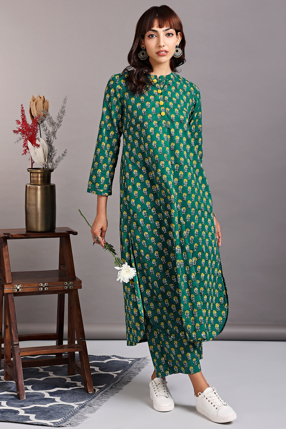 stand collar kurta with round hem - eleanor emerald & yellow coneflowers