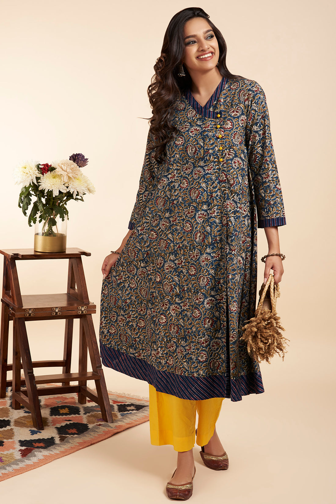 Ā Made in rich hues of indigo kalamkari in an intricate floral print all over,...