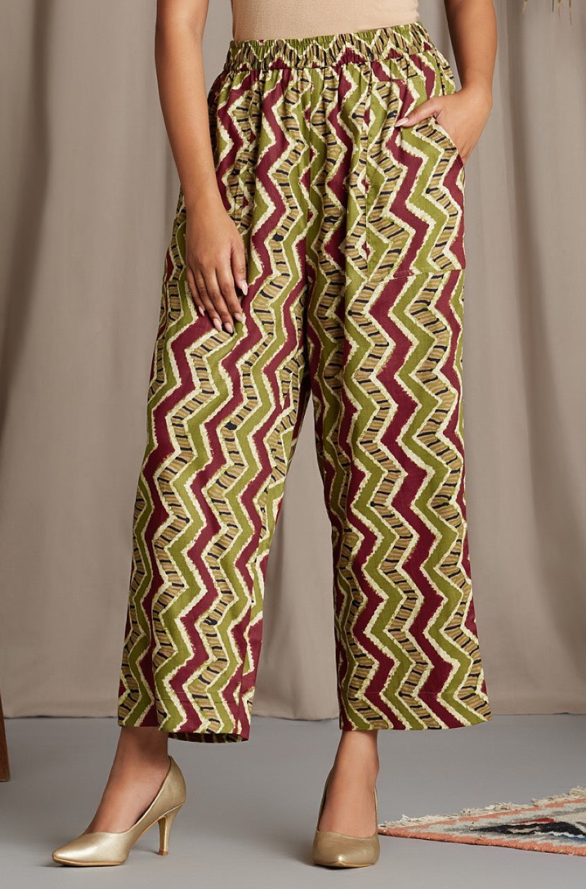 comfort fit cotton printed pants - yellow red ajrakh stripes