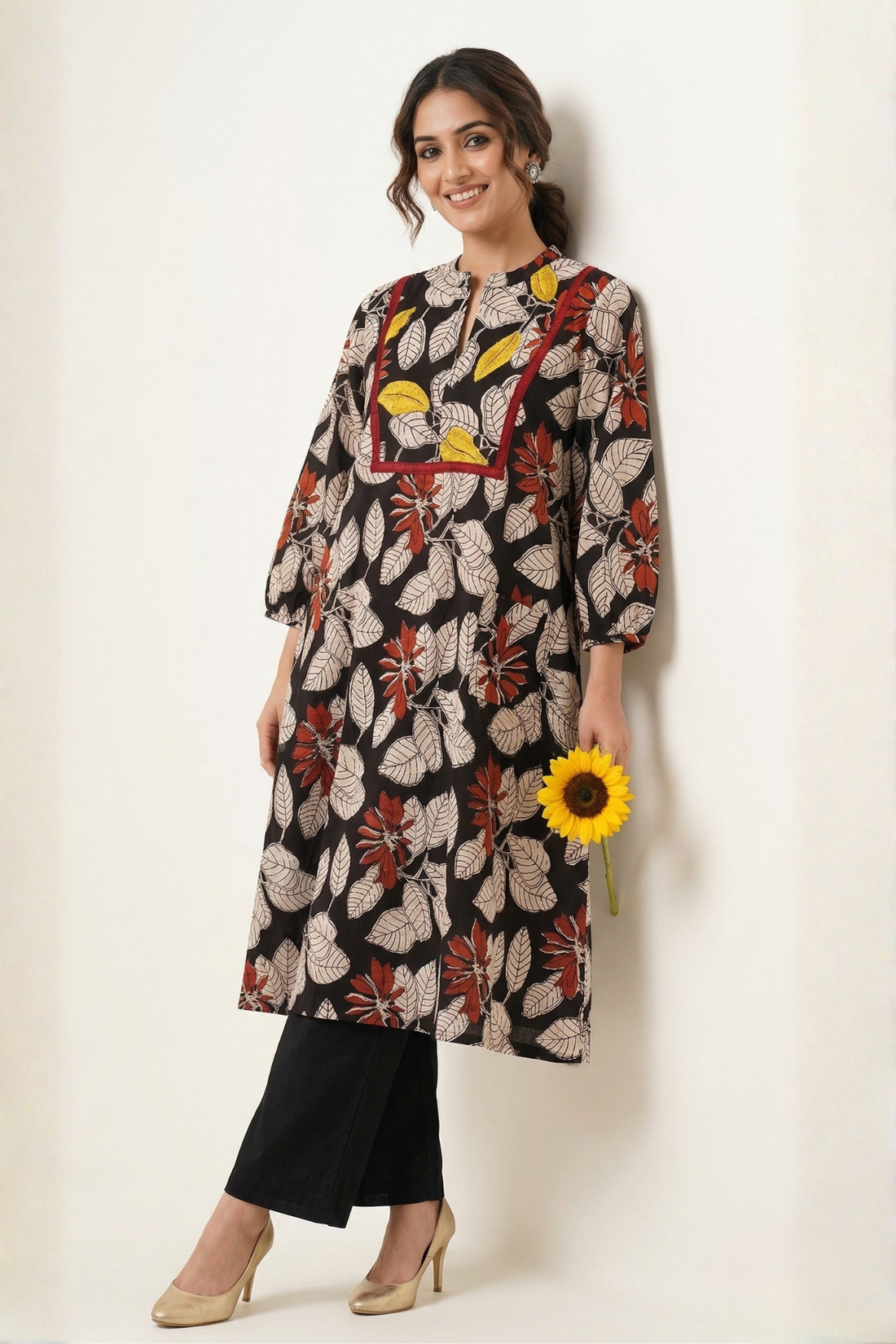 Ivory Leaf Confetti Cotton Pintuck Yoke Kurta with Pockets