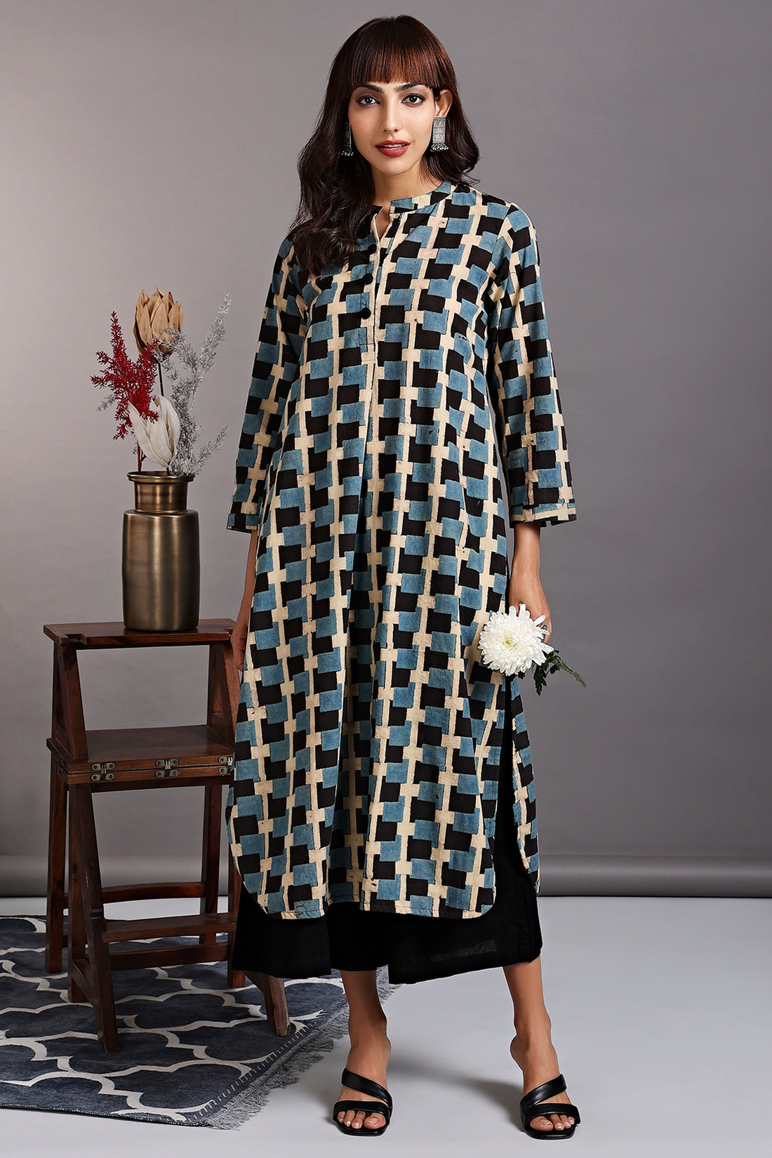 stand collar kurta with round hem - turkish blue & chequered strokes