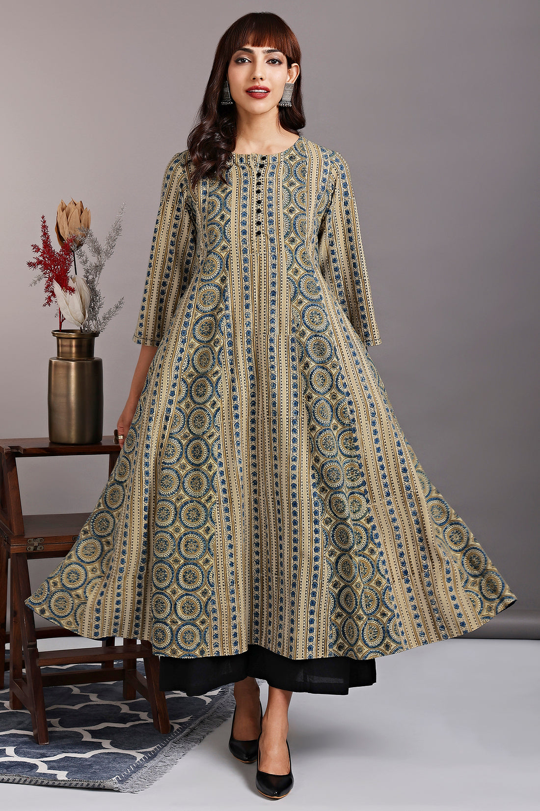 long zen yoke modal silk ajrakh kurta with pockets - madder skies & mughal elegance