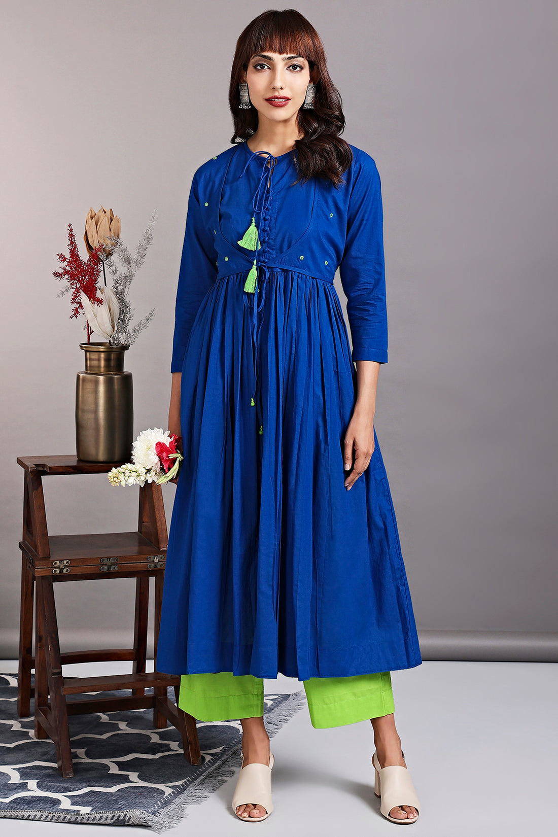 mughal anarkali with tie up jacket and gathers - sapphire blue & shimmering green