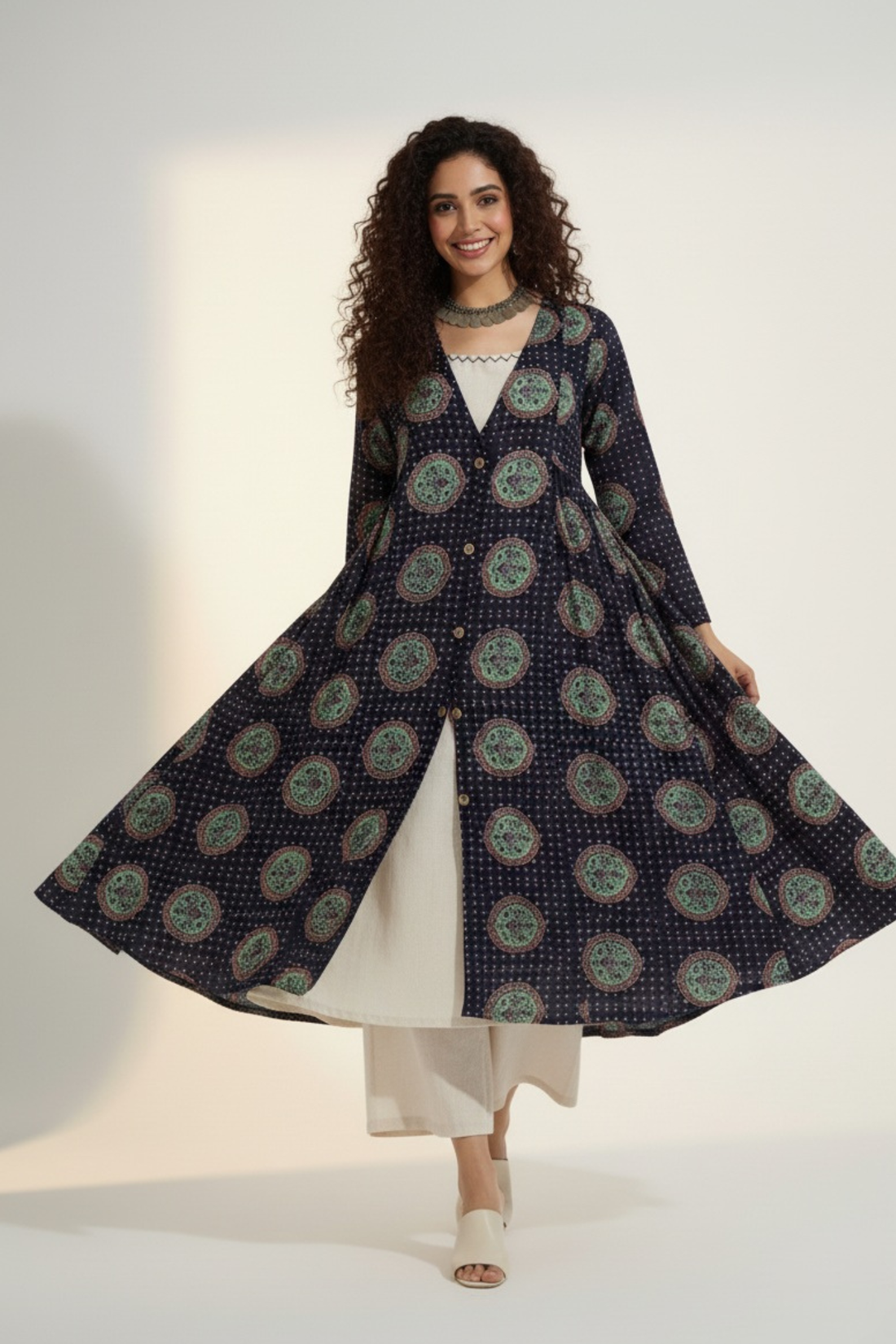 v-neck gather anarkali with chudidar sleeves - whispering winds & indigo dreamscape