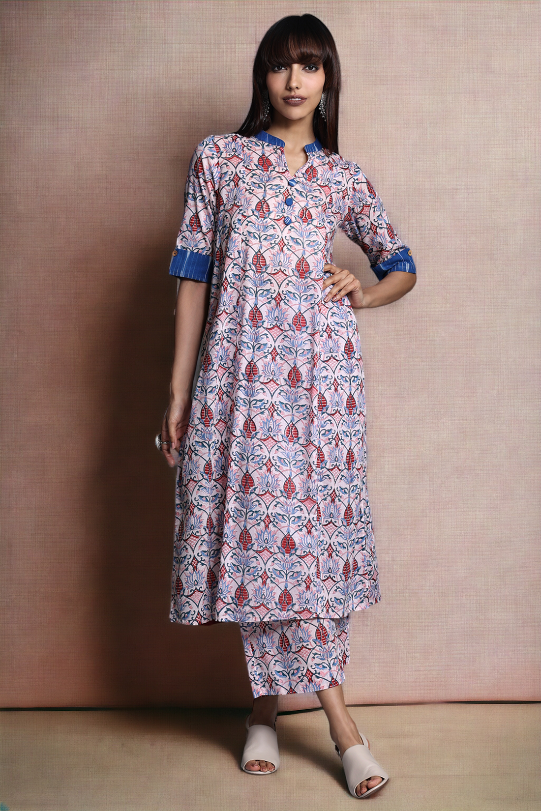 long yoke panel kurta - rose quartz & azure blooms