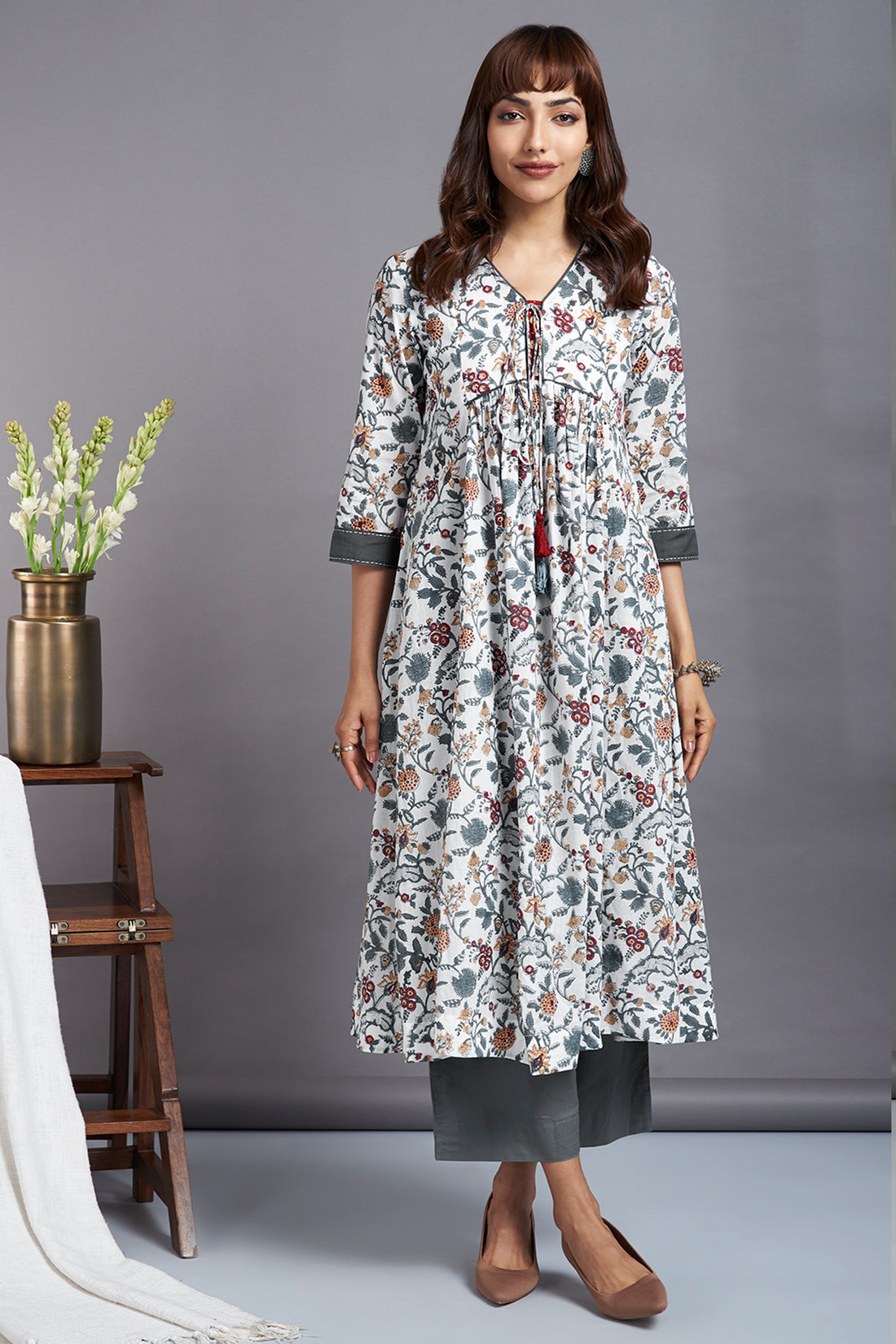 tie-up gather kali kurta - earthy green & charming wildflowers