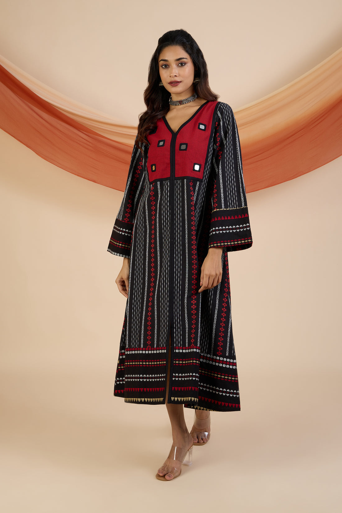 Crimson Reflections Boho Dress with Yoke & Funnel Sleeves
