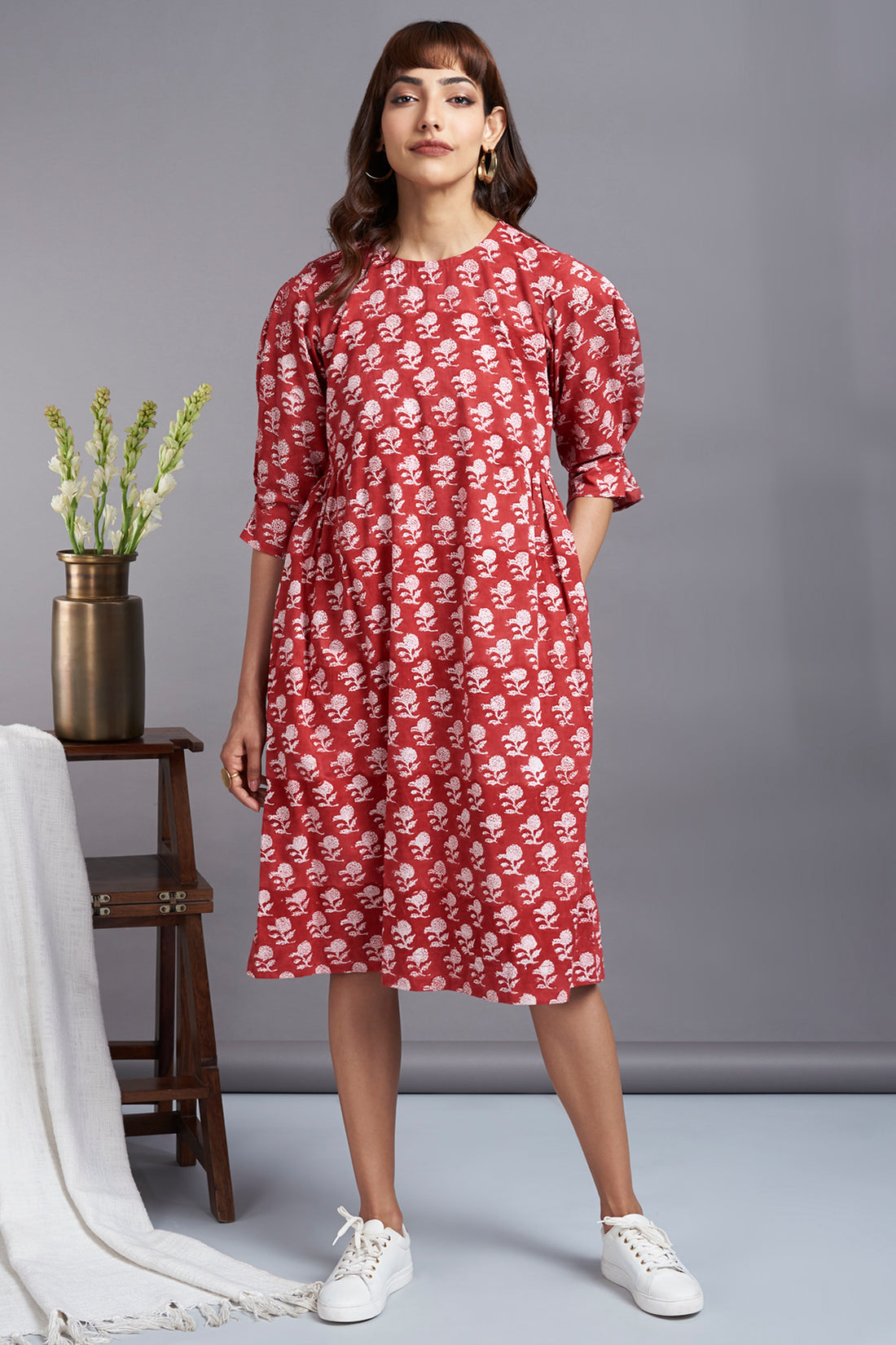 poppy red - side gather box pleat sleeve handblock printed  shift dress