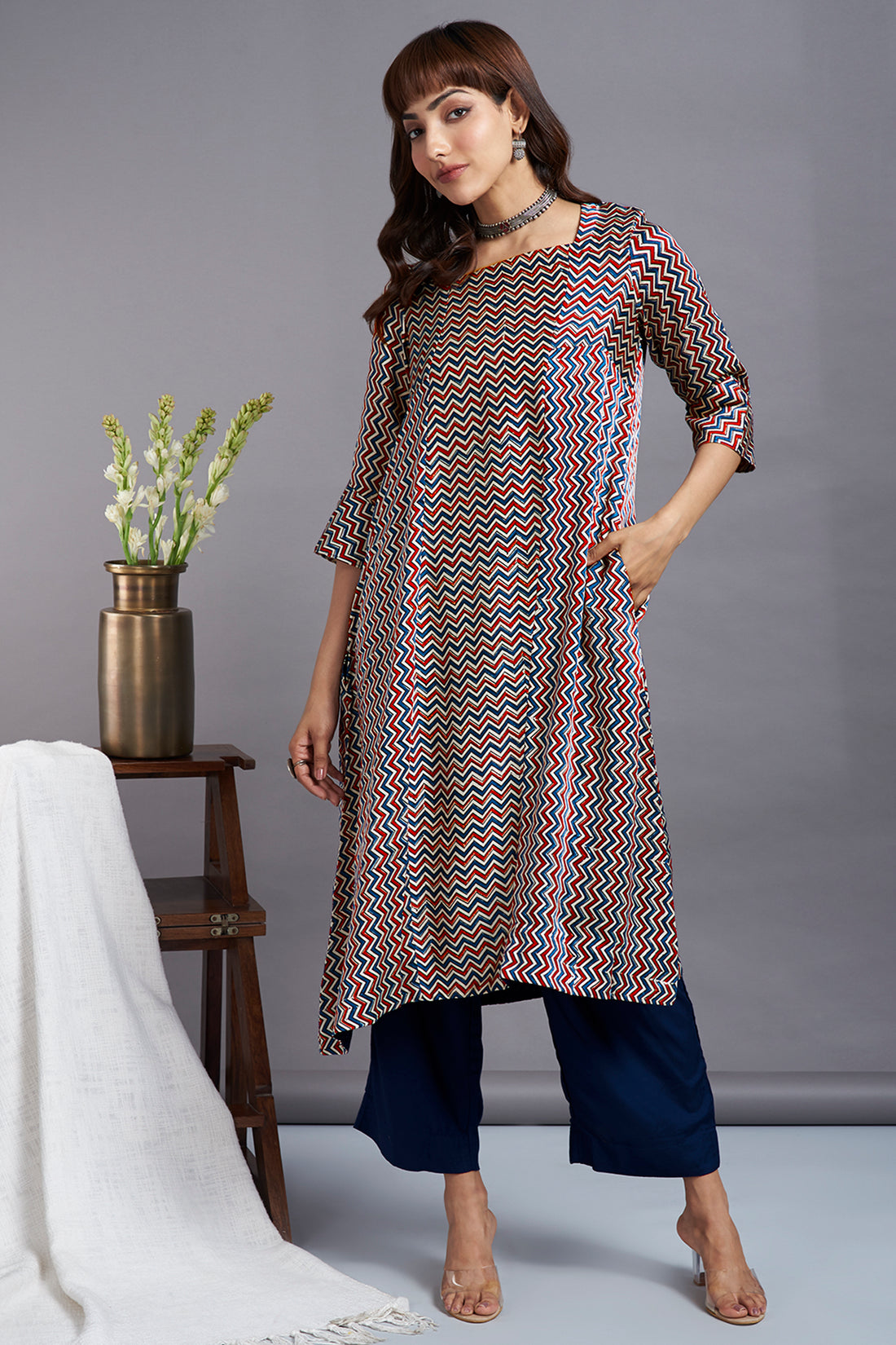 ethereal chevron ivory - luxe silk ajrakh square panel kurta