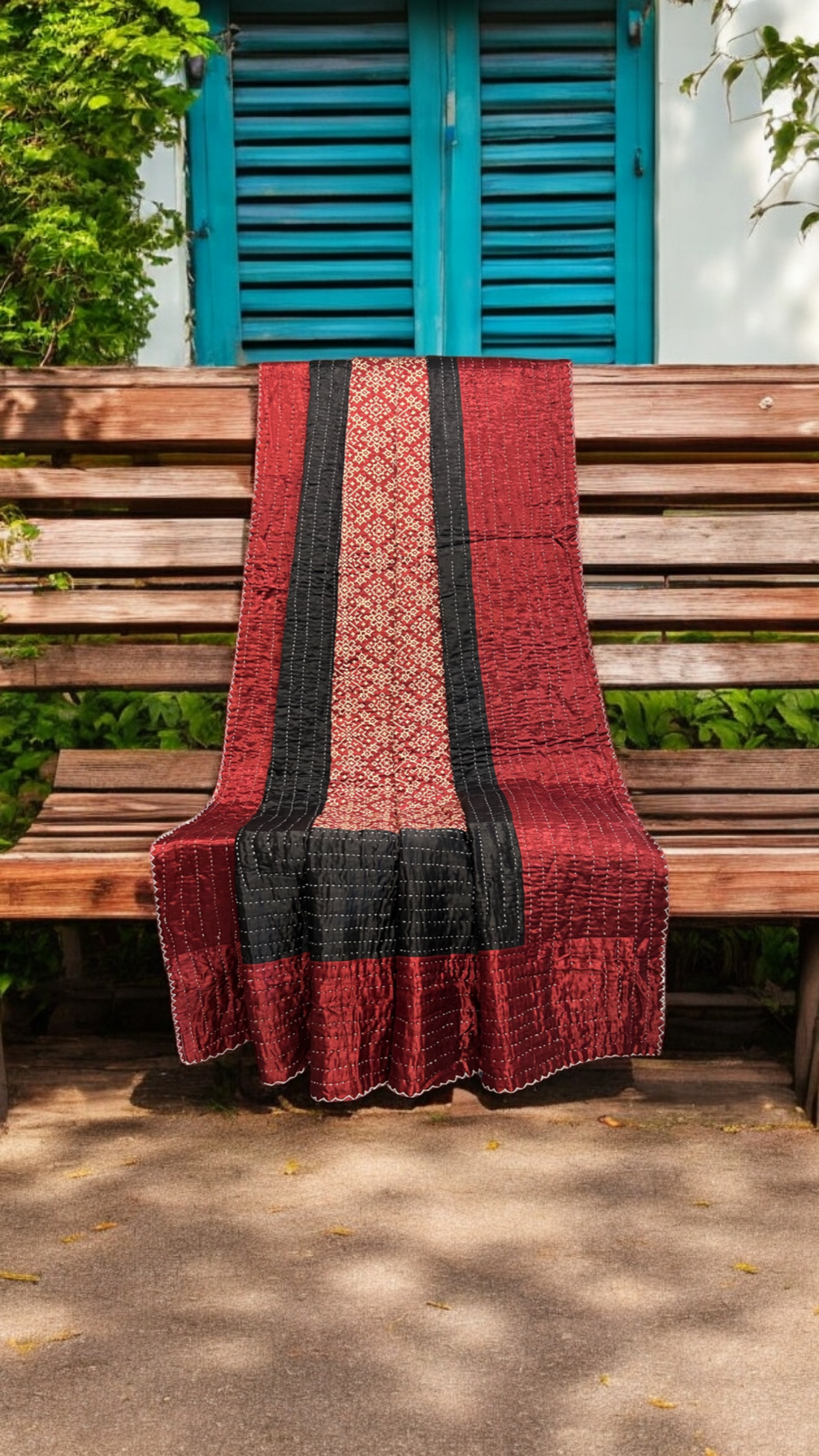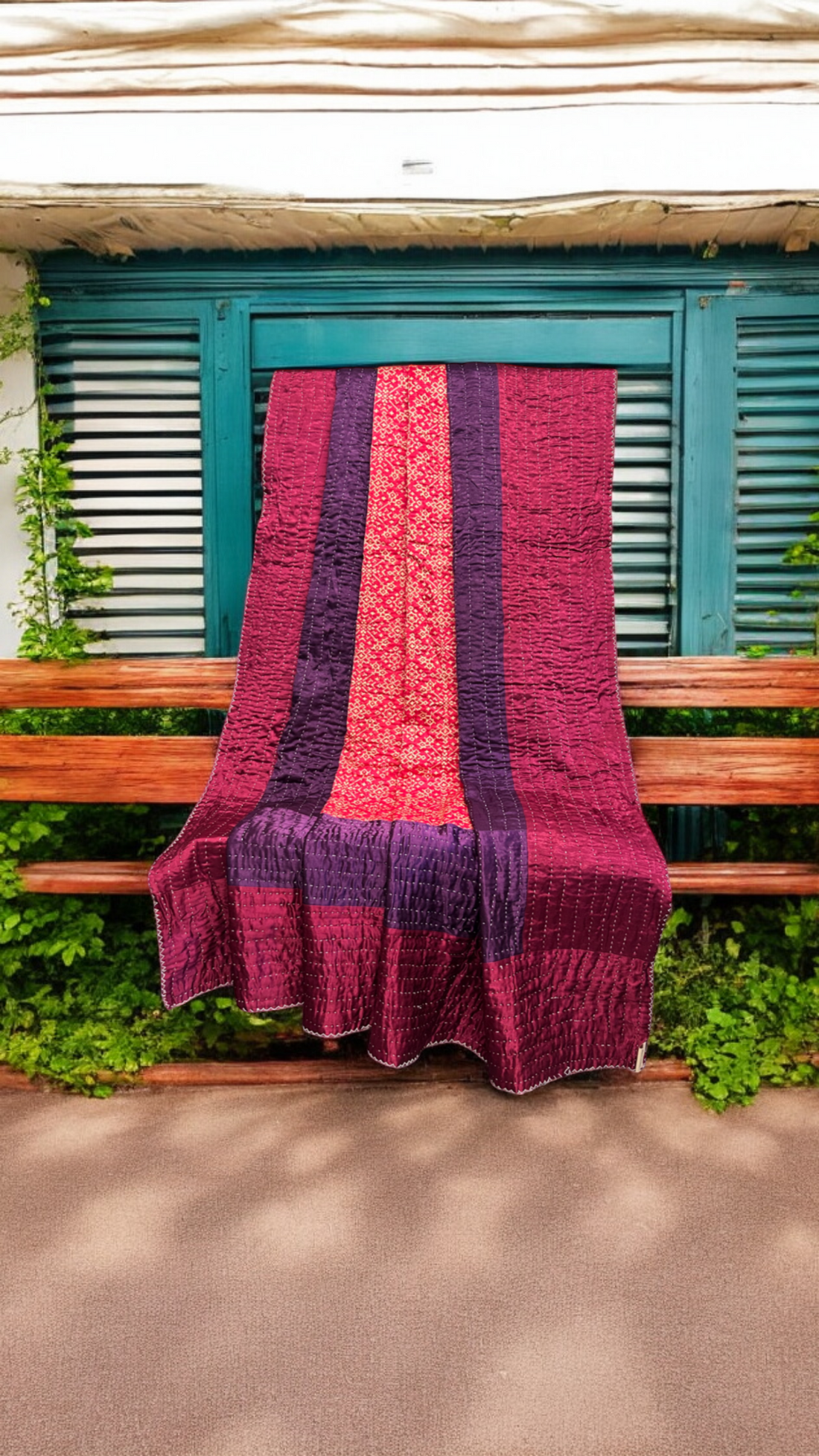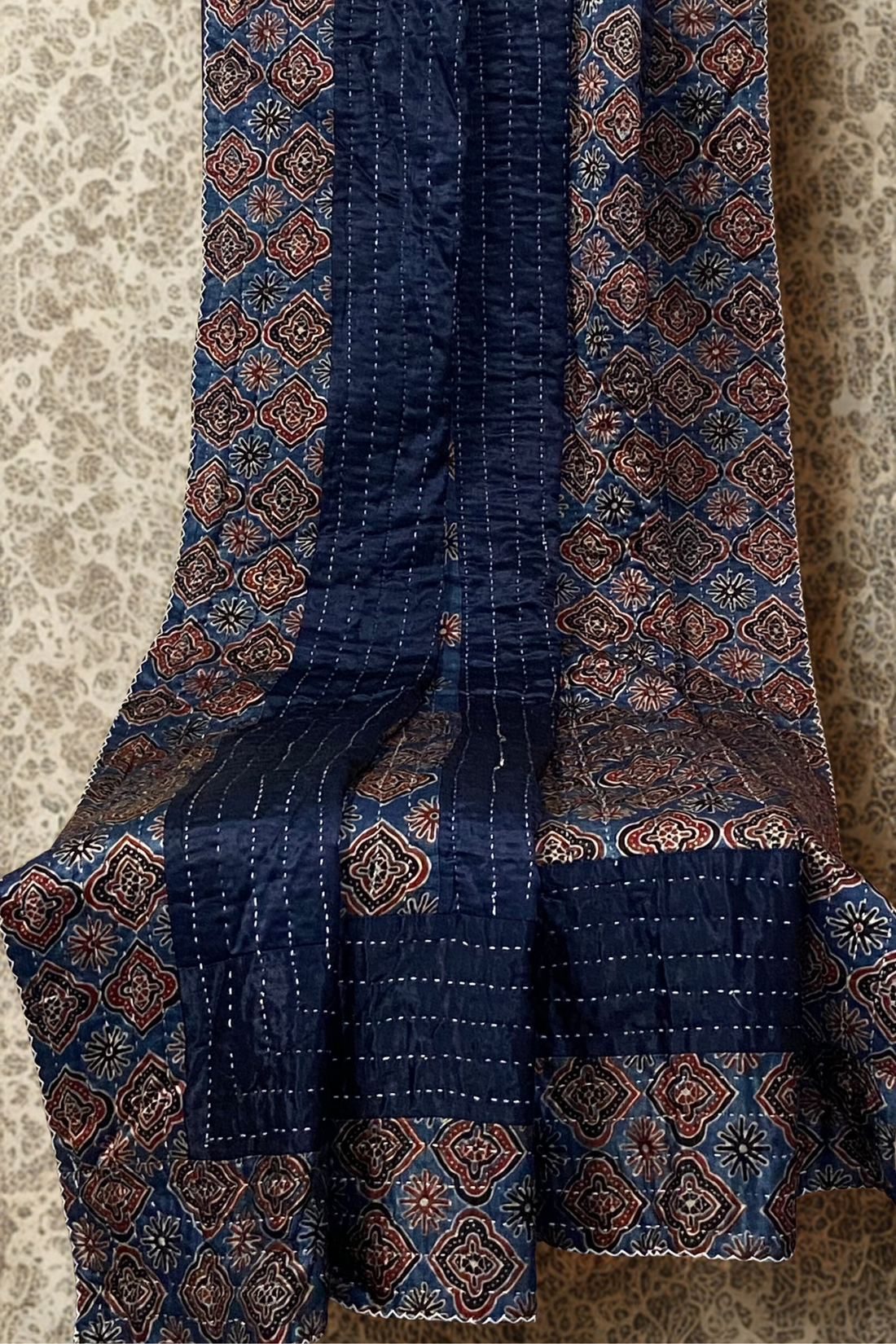 'Godri' or ‘Gudri’ is handmade, hand-stitched quilt which is sewn by women from nearby villages of Kachchh. Two layers of multi-colored patchwork fabric are sewn together with a thick cotton thread. The quilting pattern consists of running stitches through the length & width of the godri.