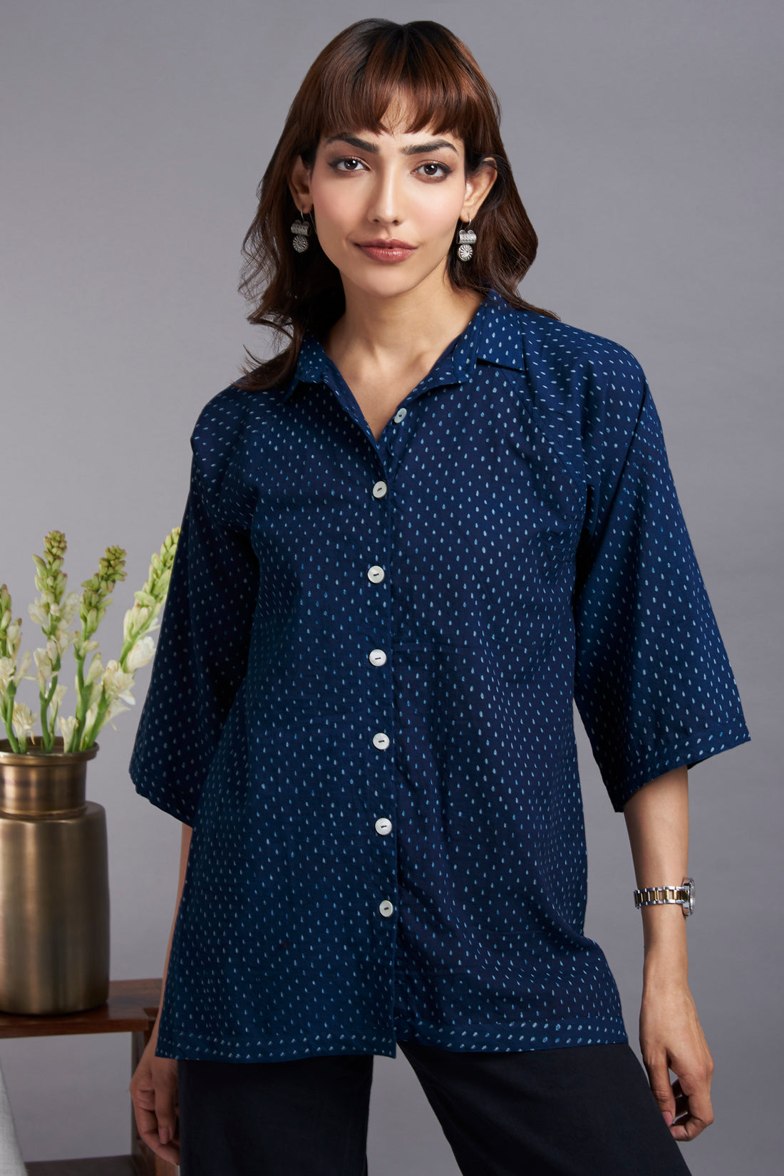 Discover the allure of our handcrafted indigo-hued cotton ikat shirt, a perfect blend of...