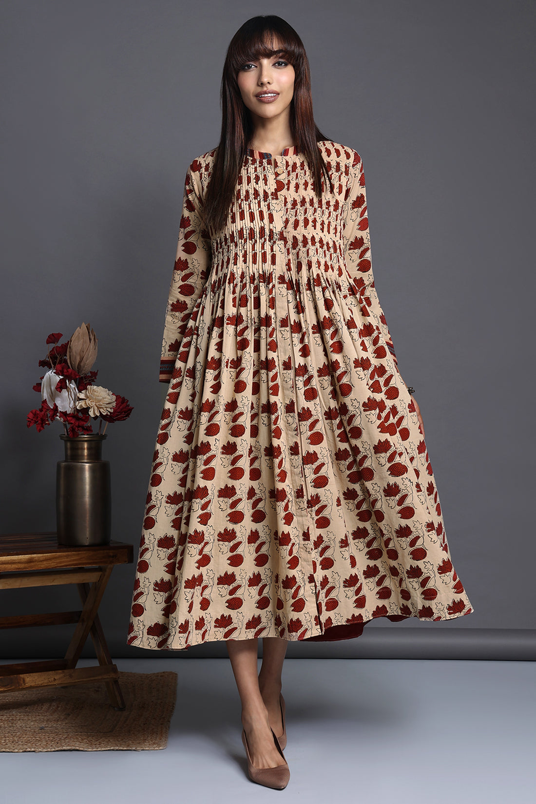 pleated neck silk ajrakh pintuck collar dress - carmine threads & sapphire symphony