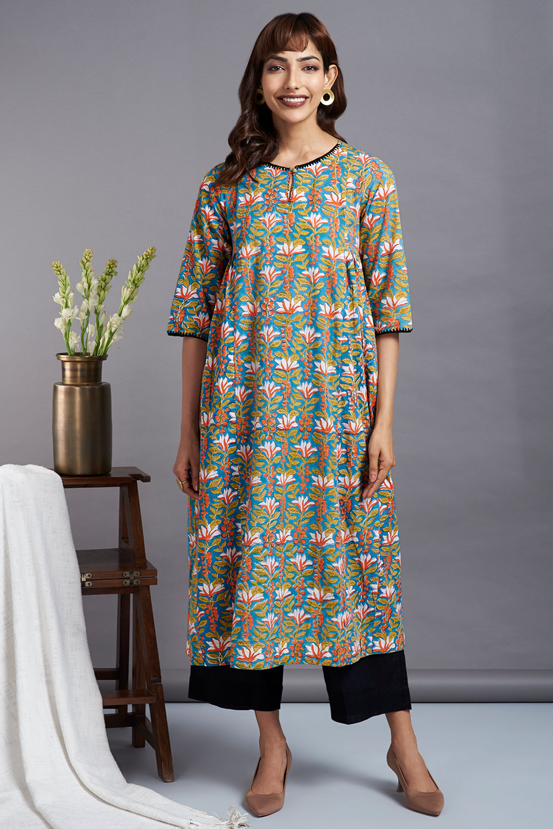 misty flower fields - side gather handblock printed a-line kurta with crochet details