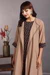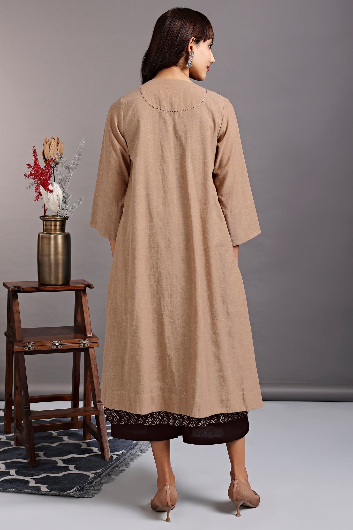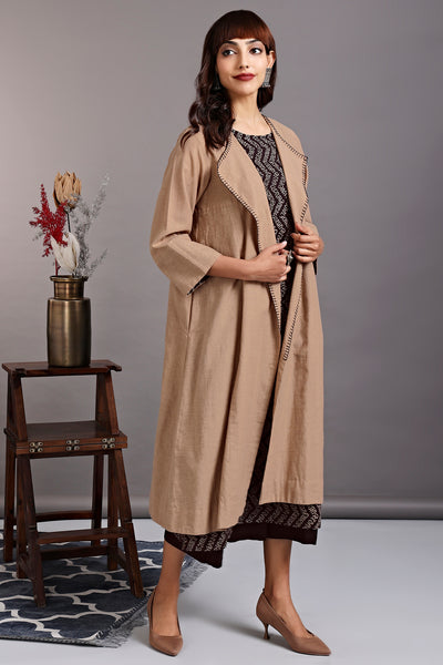 The delicate lapel creates a dramatic pattern, enhancing the overall elegance and uniqueness of the overlay. This versatile piece can be mixed and matched with your favorite dresses, denims, or kurtas, allowing for endless styling possibilities. For a coordinated look, you can pair it with our black hand printed dres, in similar contrasting hues, along with pants to create a sophisticated workwear ensemble. The jacket is meticulously hand-finished with bucket stitch details on the lapel, sleeves, and neckline, showcasing the craftsmanship and attention to detail.