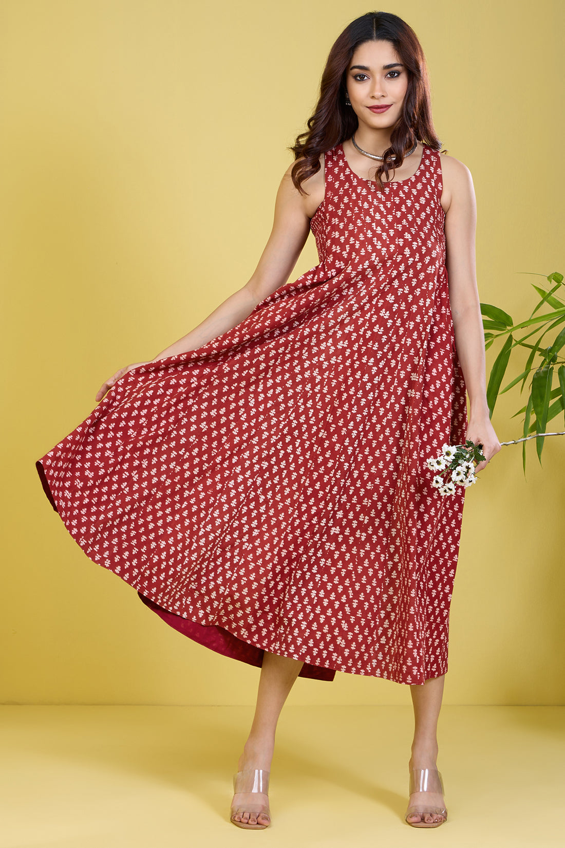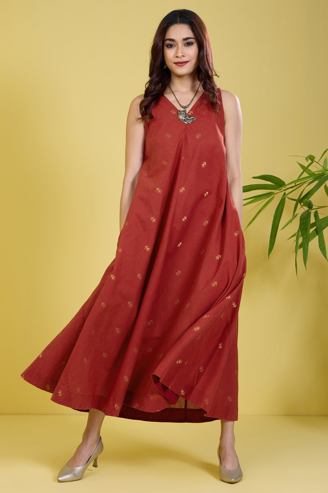 sleeveless strap rust flared dress gold buttis