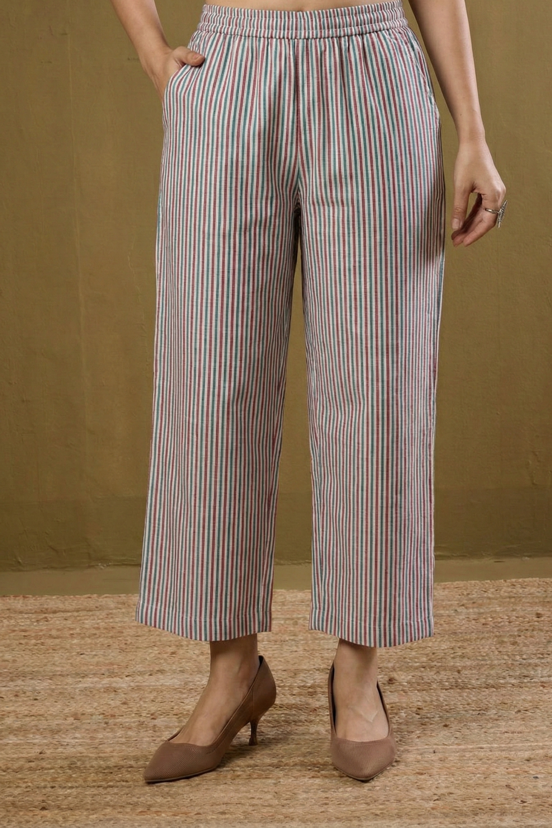 Comfort fit pants - White Green Stripes Cotton