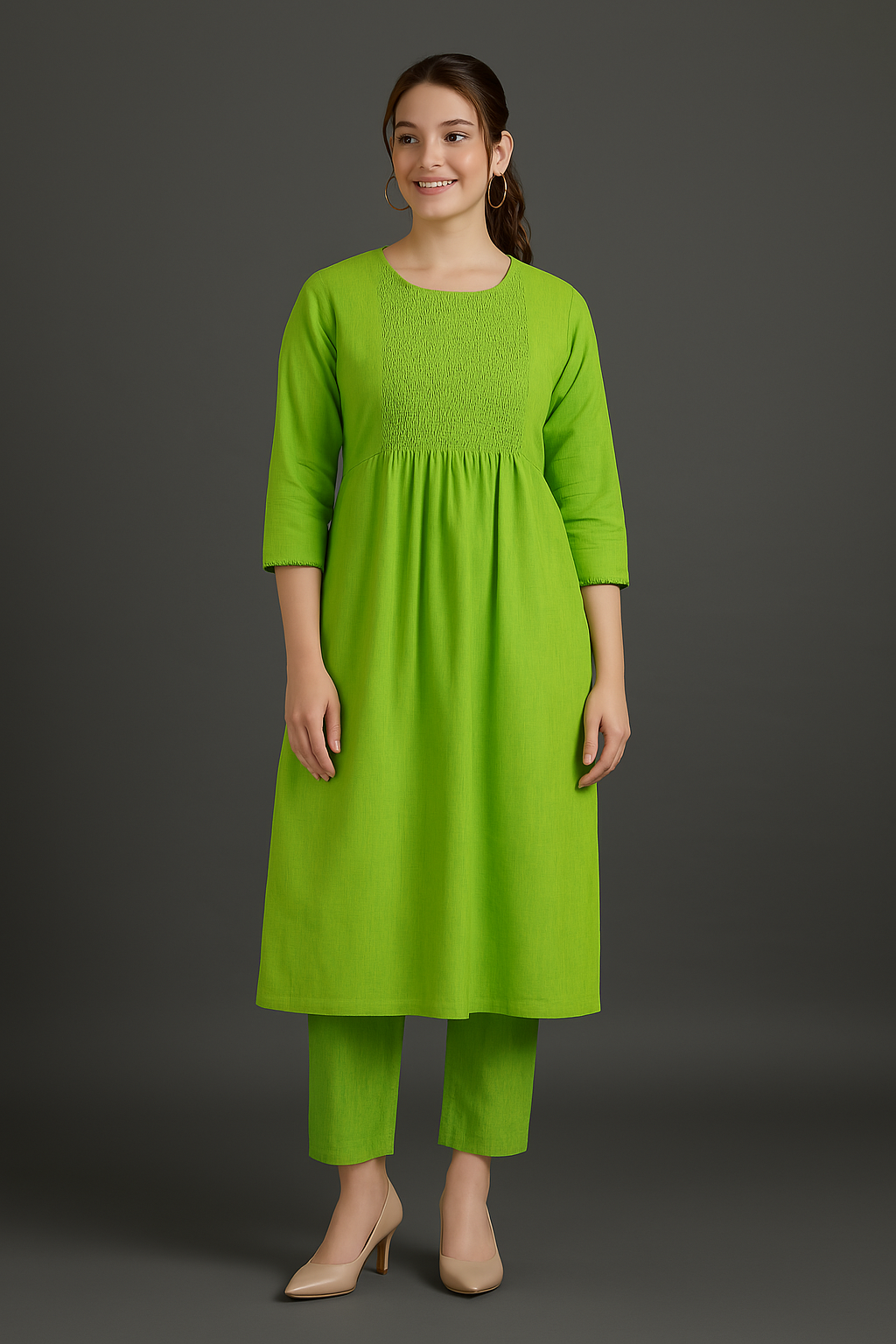 Coord Set With Smocked Yoke Kurta And Pants Lime Green Cotton With Pockets by Maati Crafts
