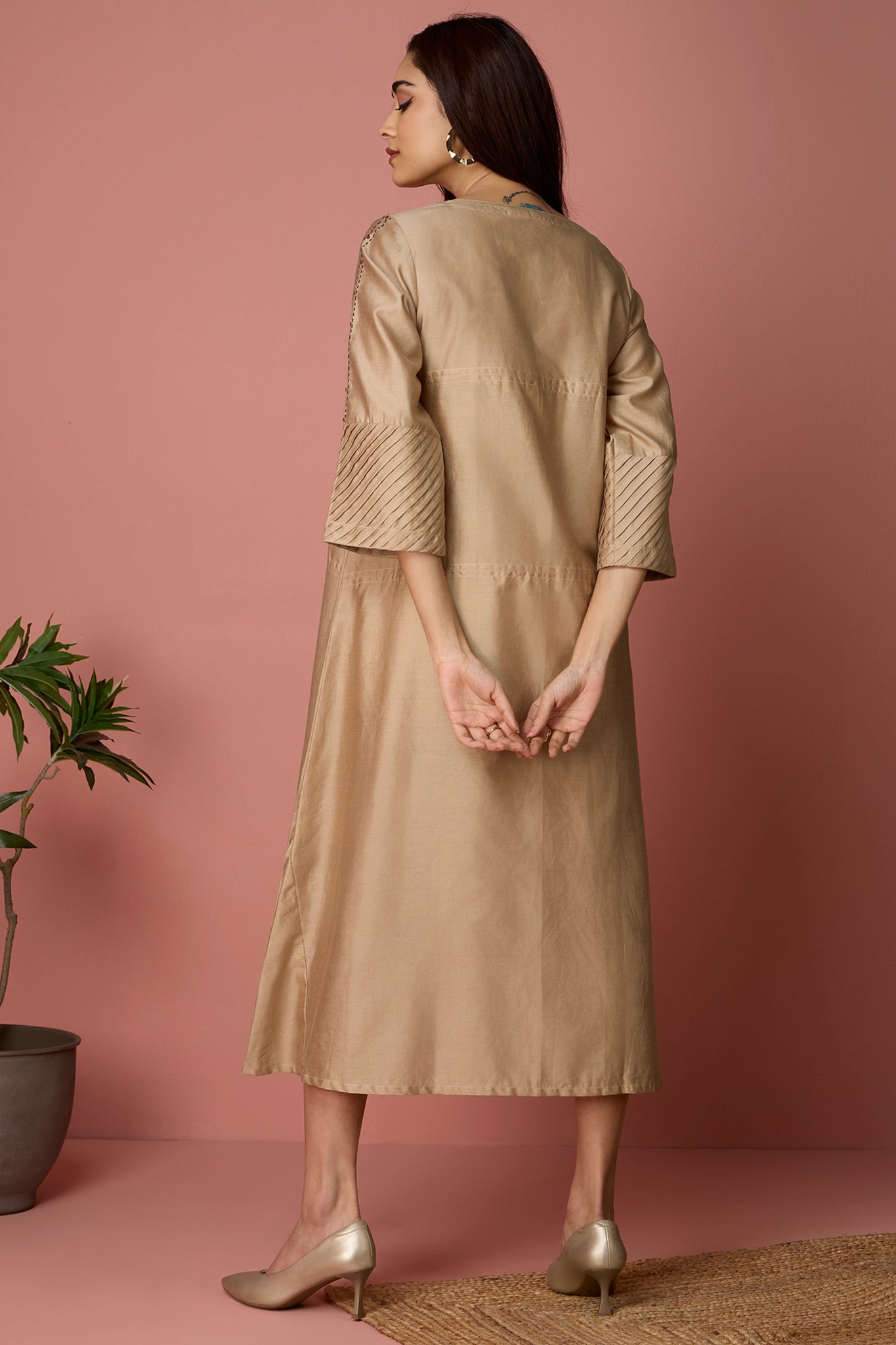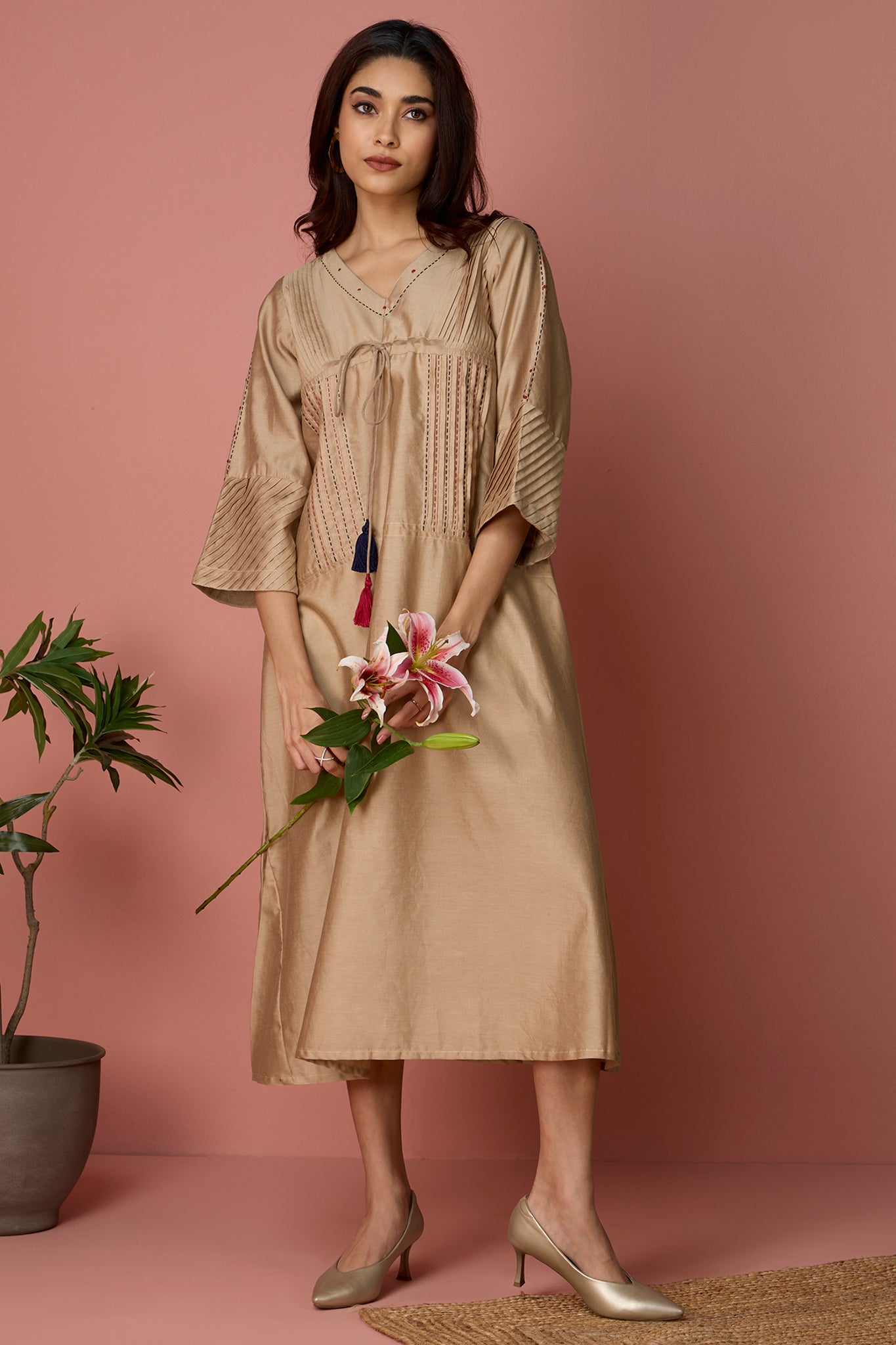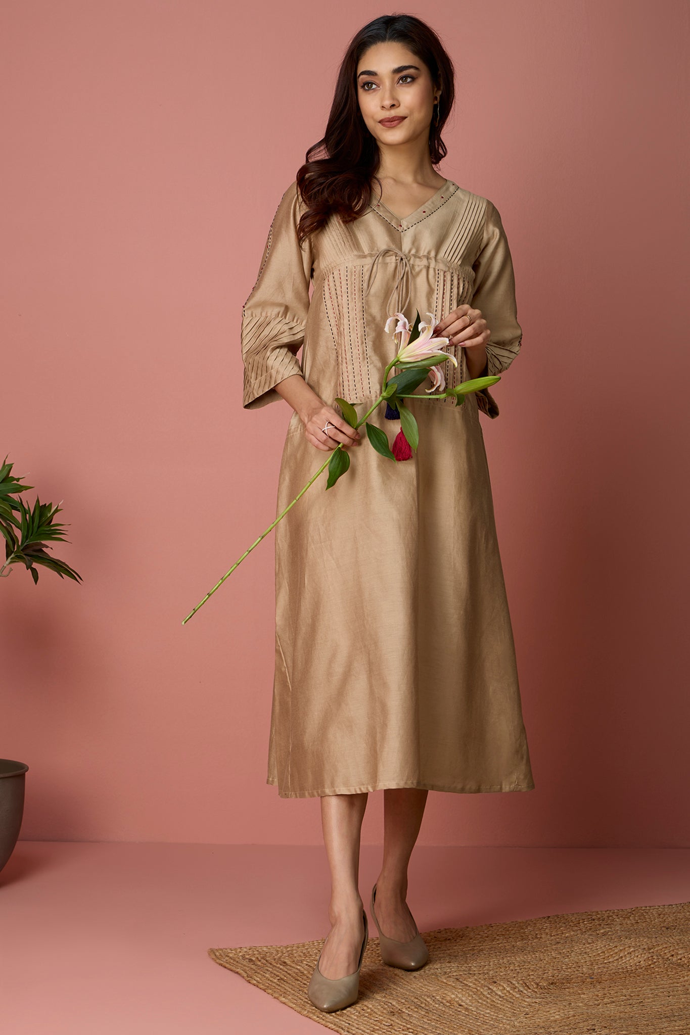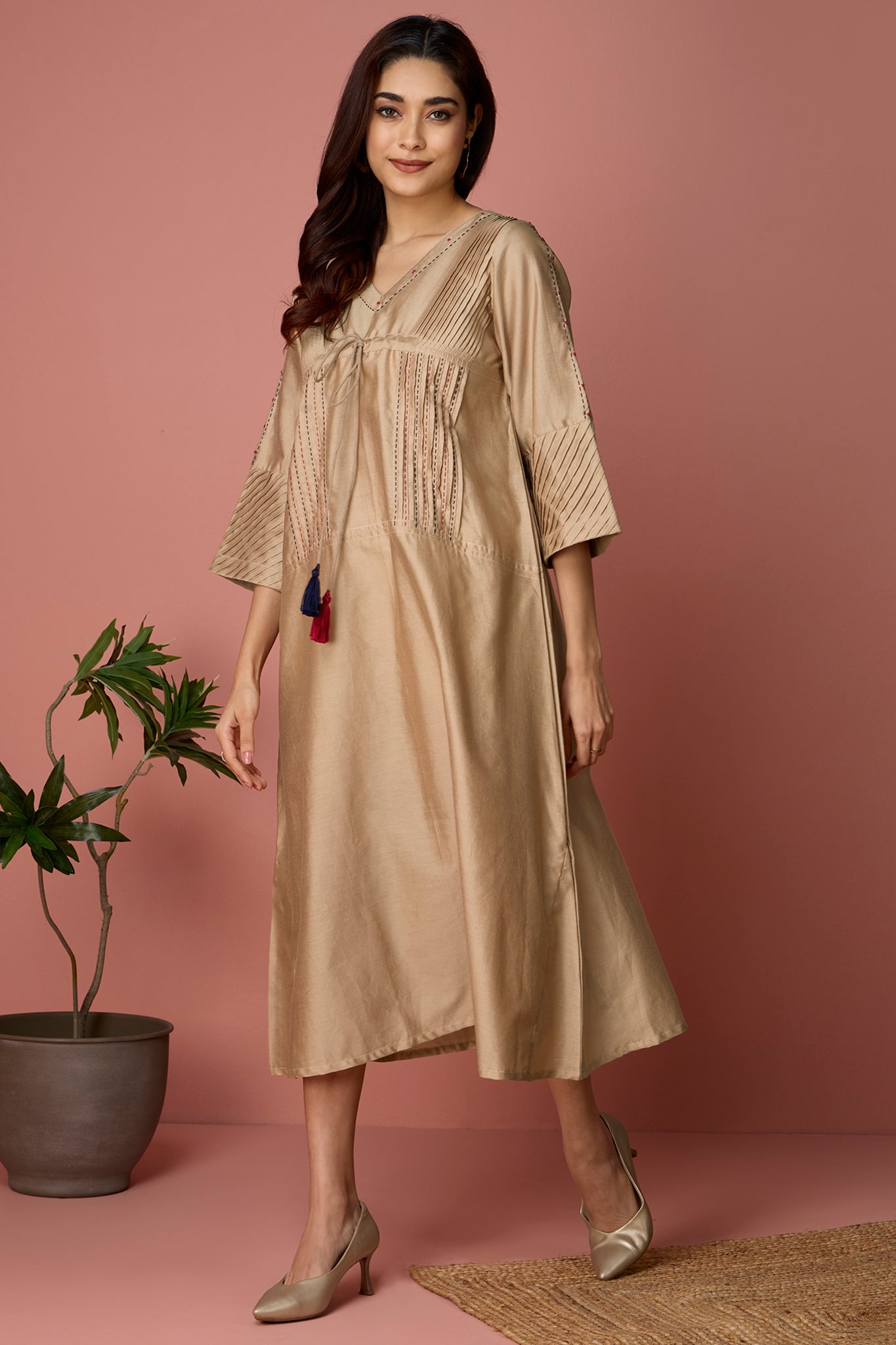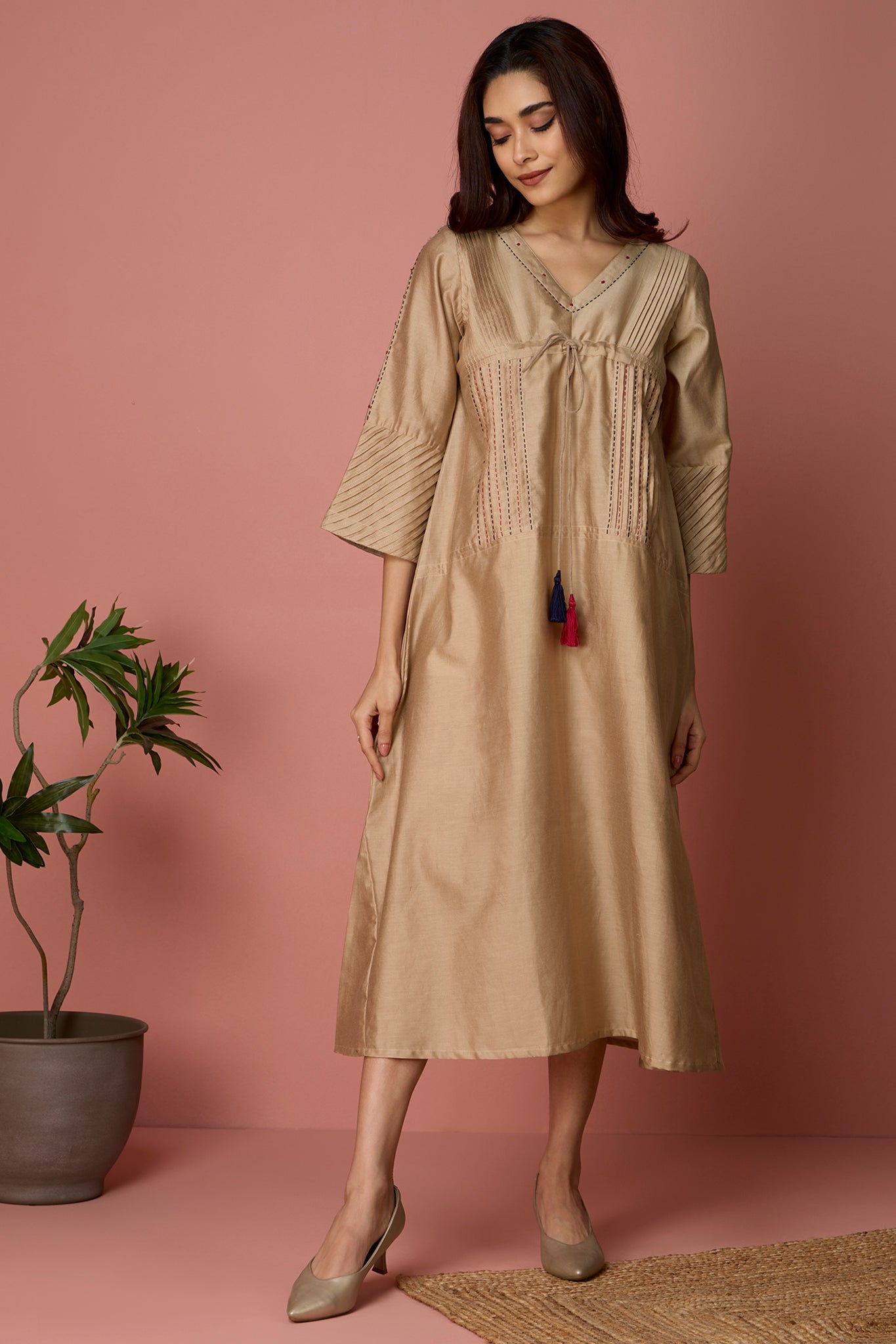 - Craftsmanship: Exuding festive vibes, this dress is a testament to meticulous craftsmanship. Handcrafted by our skilled karigars, it features a vibrant rich golden hue dress in and bold statement sleeves. The front hand-embroidered placket with a v-neck adds an artisan finish, showcasing the dedication of Maati's artisans. Delicate handmade tassels, intricate embroidery, and a front tie-up enhance its bespoke charm.