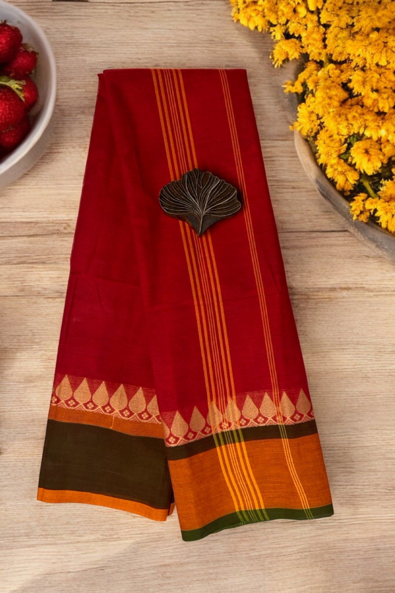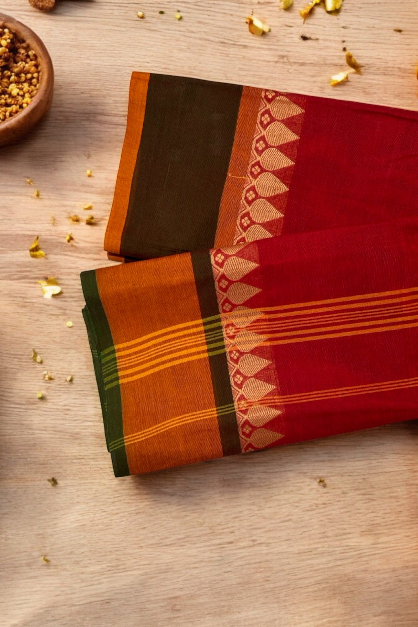 chettinad cotton saree - Celebratory Red & Leaf Gold Border