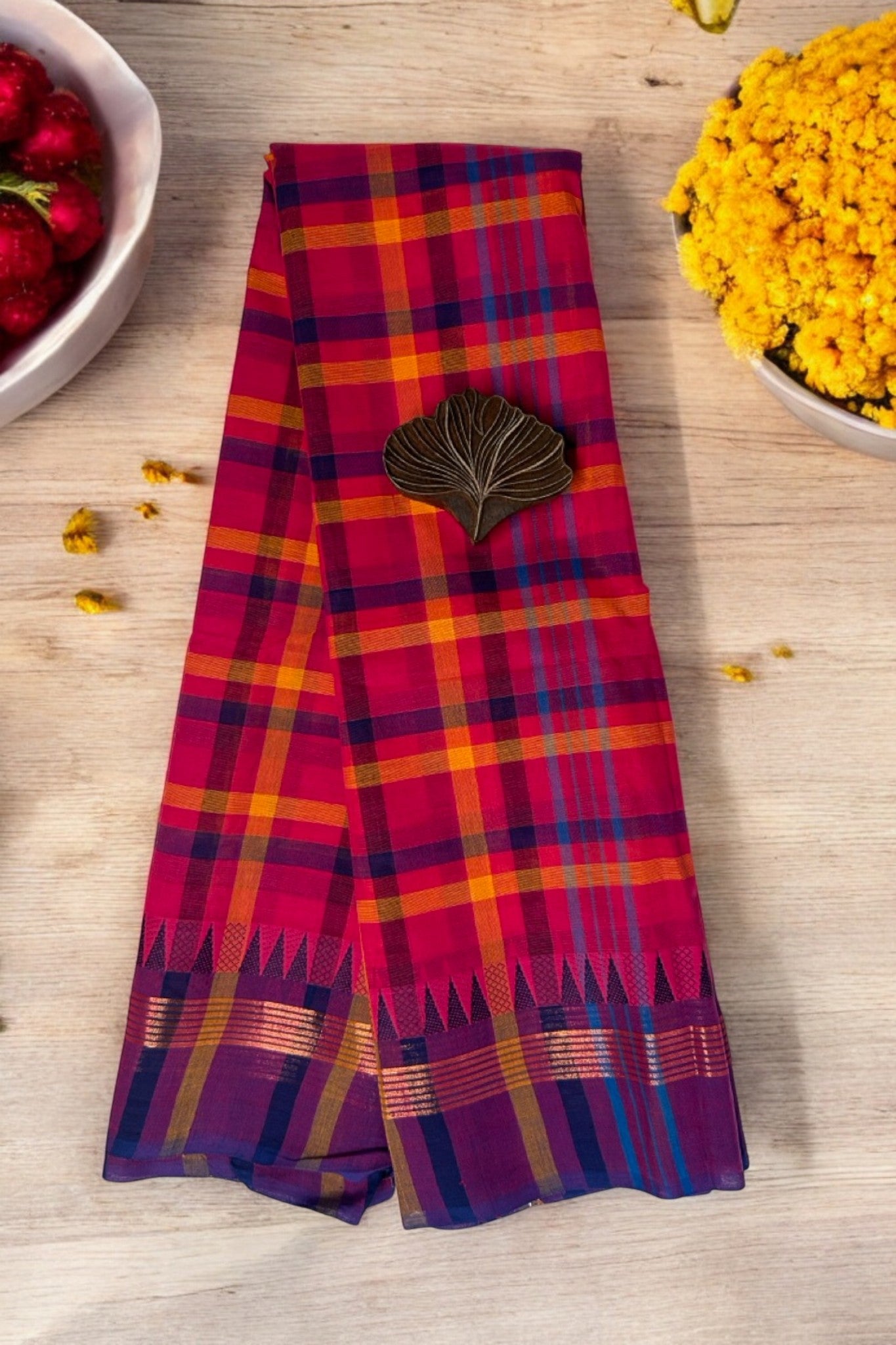 chettinad cotton saree - Multi Purple Checks & Paisley Gold