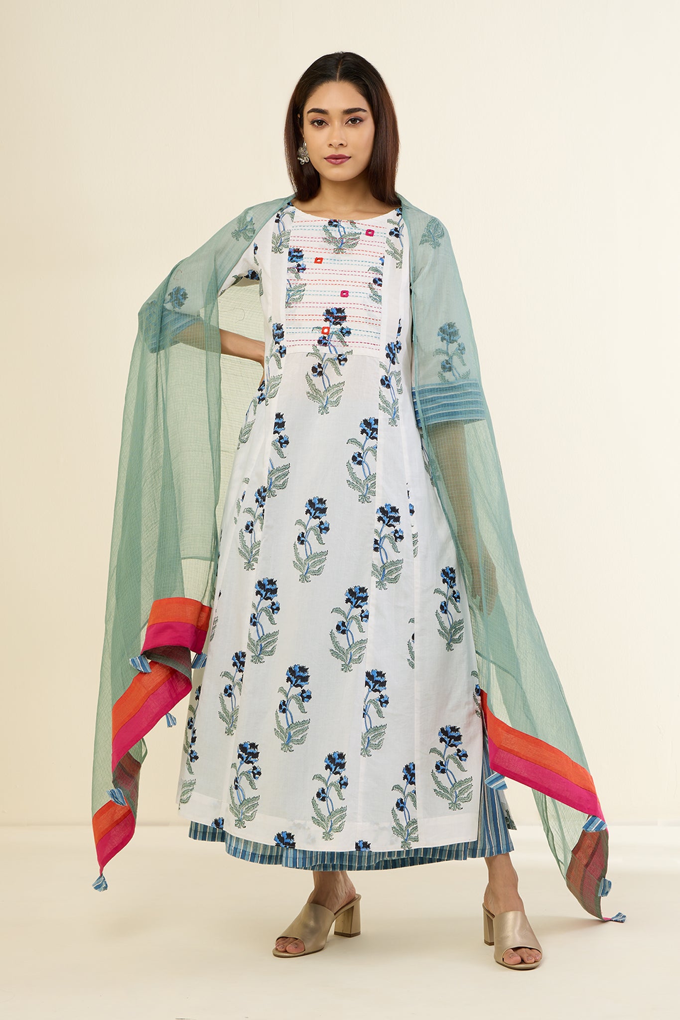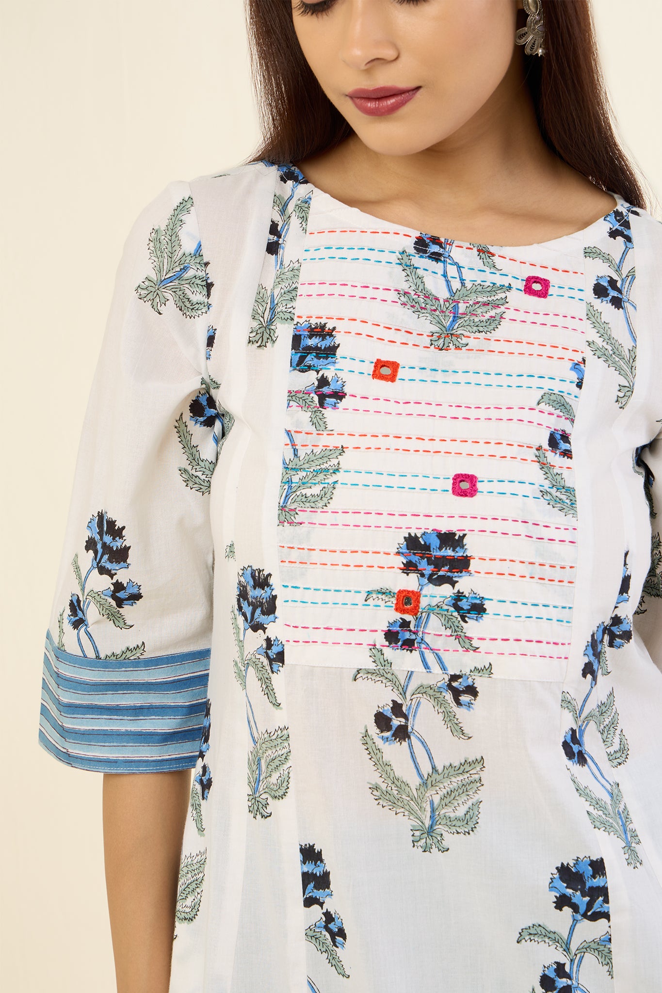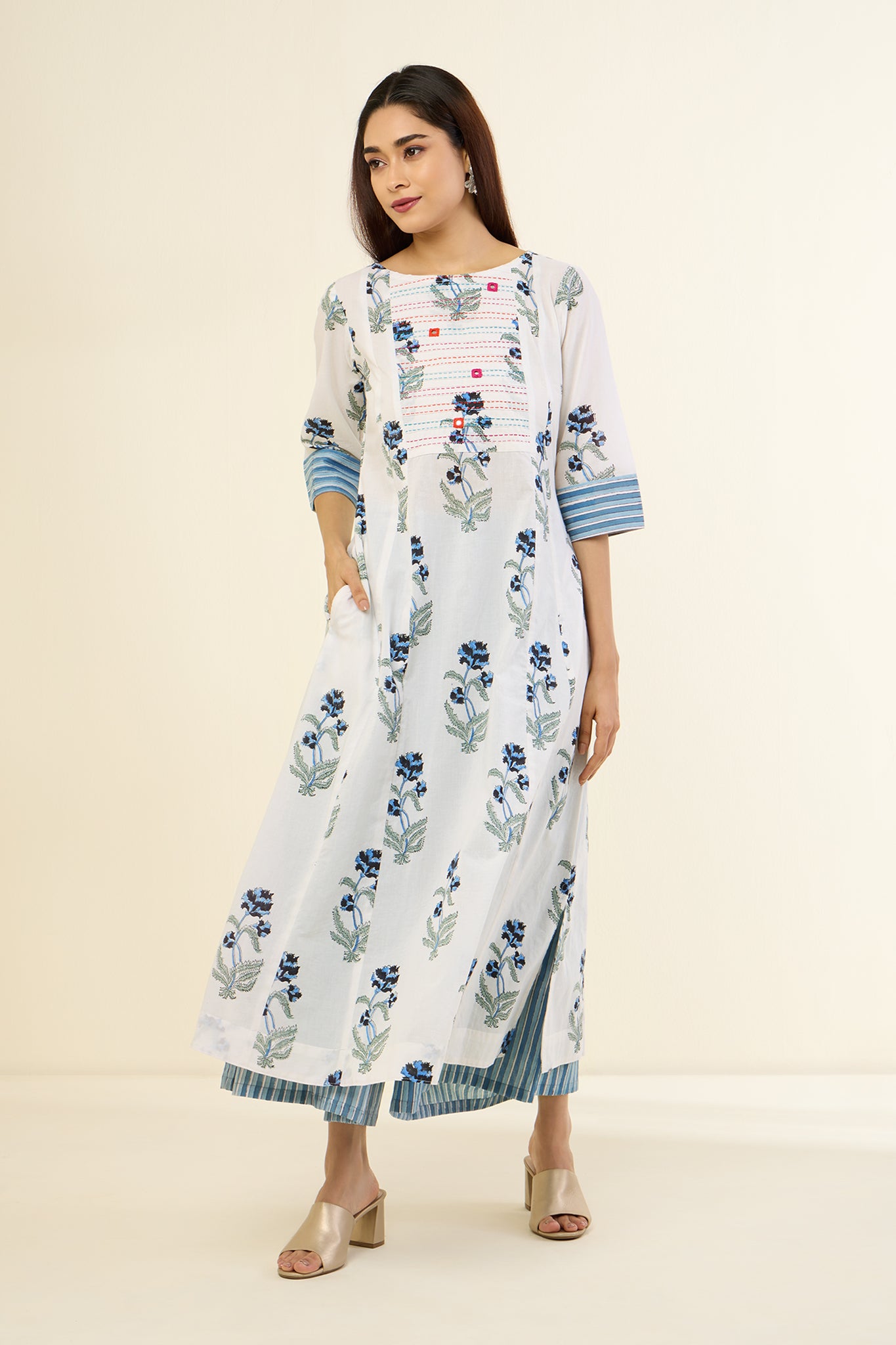Step into timeless elegance with our Cotton Long Kurta, a masterpiece of minimalist design and everyday comfort. Crafted from 100% cotton, this kurta features a round neckline with a yoke adorned with hand-embroidered mirror work in vibrant shades of orange and pink, adding a touch of artisanal flair. The 3/4th sleeves are detailed with contrasting stripes cuffs for a modern twist. Inspired by Mughal blooms, the kurta boasts hues of indigo with delicate white floral buttis, creating a sophisticated and versatile piece suitable for any occasion. Tailored to perfection, it offers a flattering silhouette with a slit for added comfort and movement. A Maati essential, this kurta pairs beautifully with pants or striped culottes (sold separately), offering both style and functionality. Styling Tips: Image-Inspired: Pair the kurta with a Kota dupatta featuring pastel hues and details of orange and pink borders with tassels. The striped culottes echo the trim details, creating a coordinated and effortlessly chic ensemble. Casual Day Out: Style with white linen pants and leather sandals for a relaxed yet sophisticated look perfect for a casual day out or lunch with friends. Evening Glam: Layer over slim-fit trousers or leggings and accessorize with silver jhumkas and embellished mojari flats for a refined evening ensemble suitable for dinners or cultural events. This kurta embodies elegance and modern charm, ensuring you feel poised and stylish with its exquisite craftsmanship and versatile design.