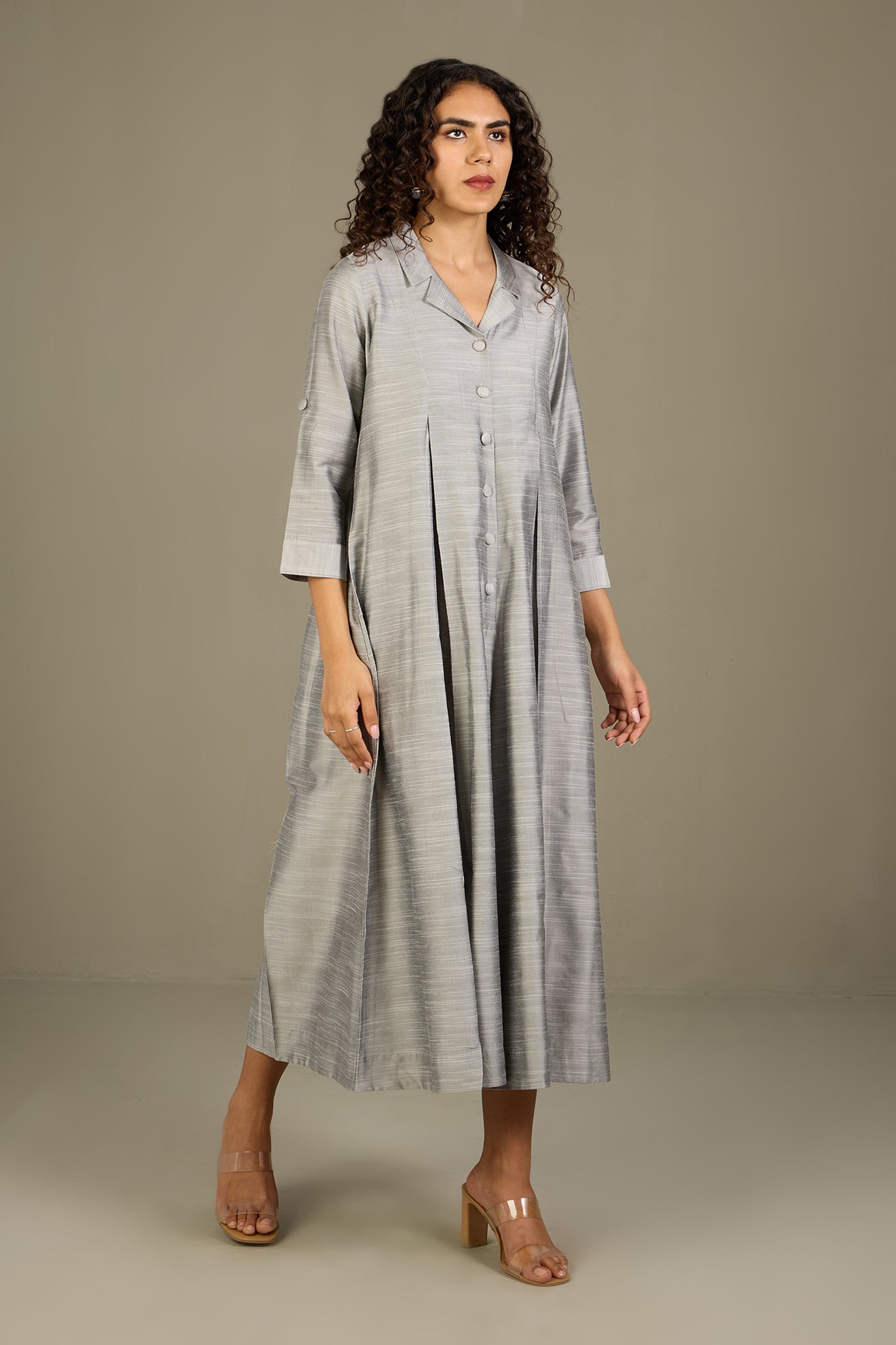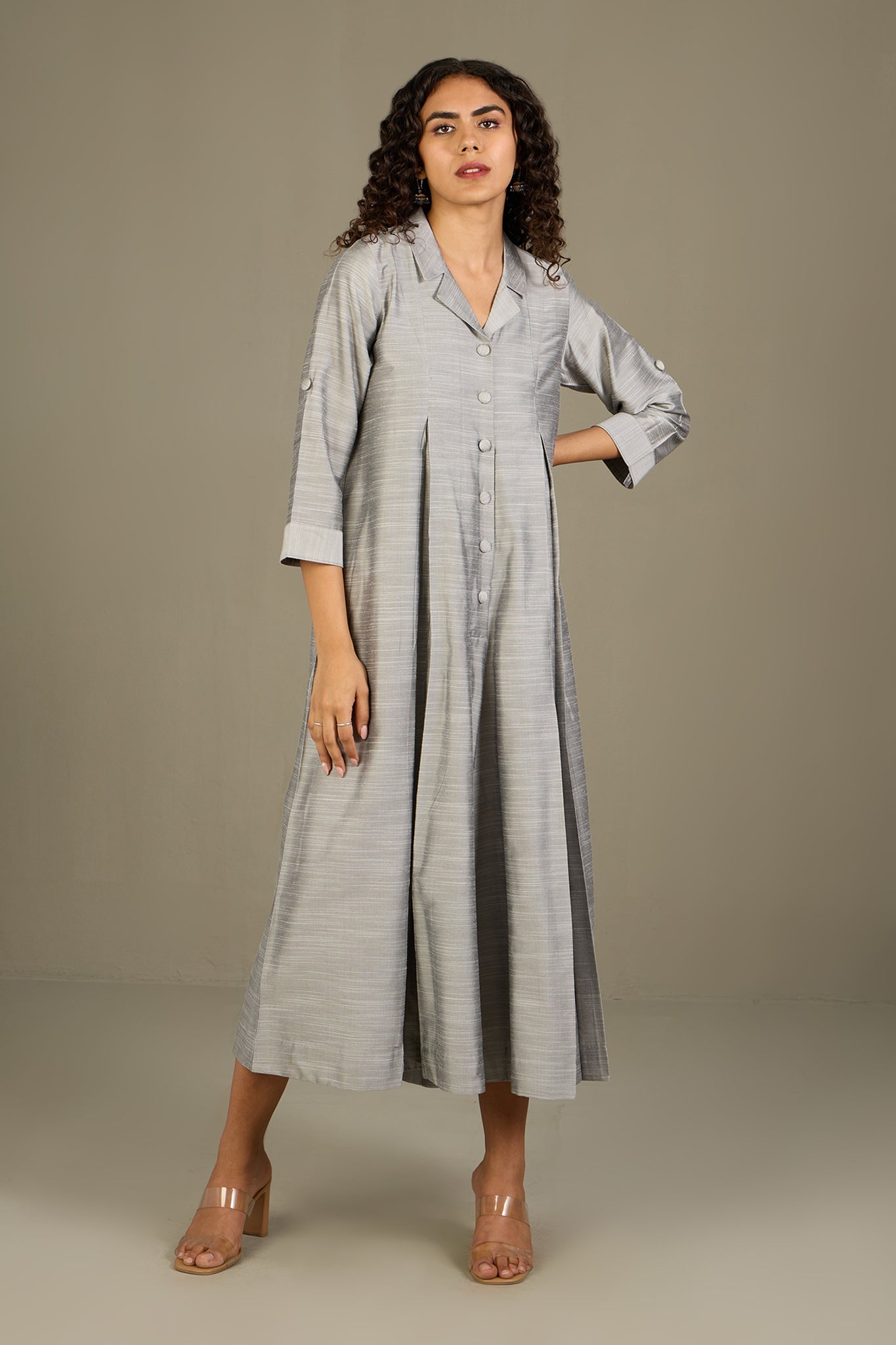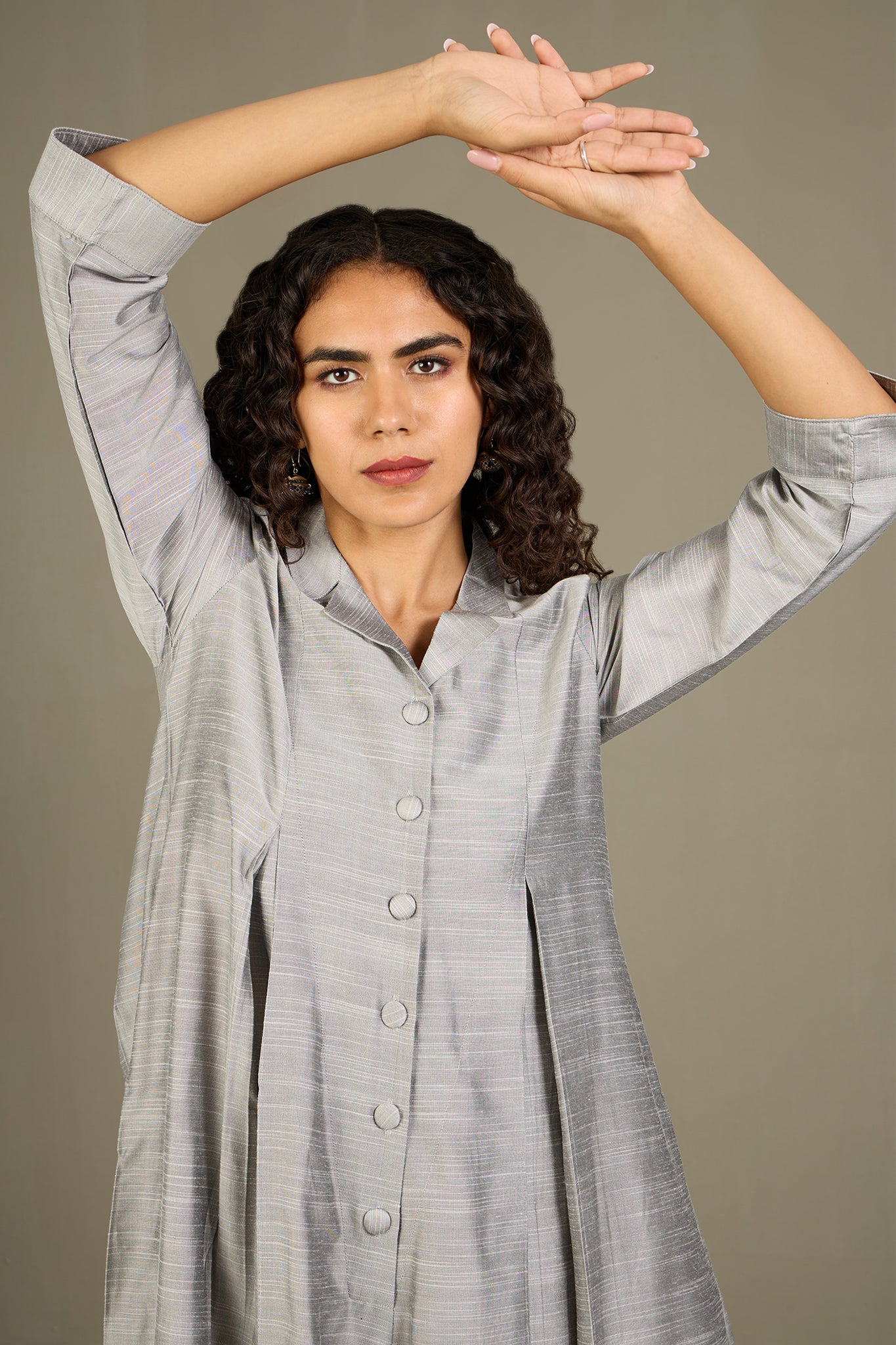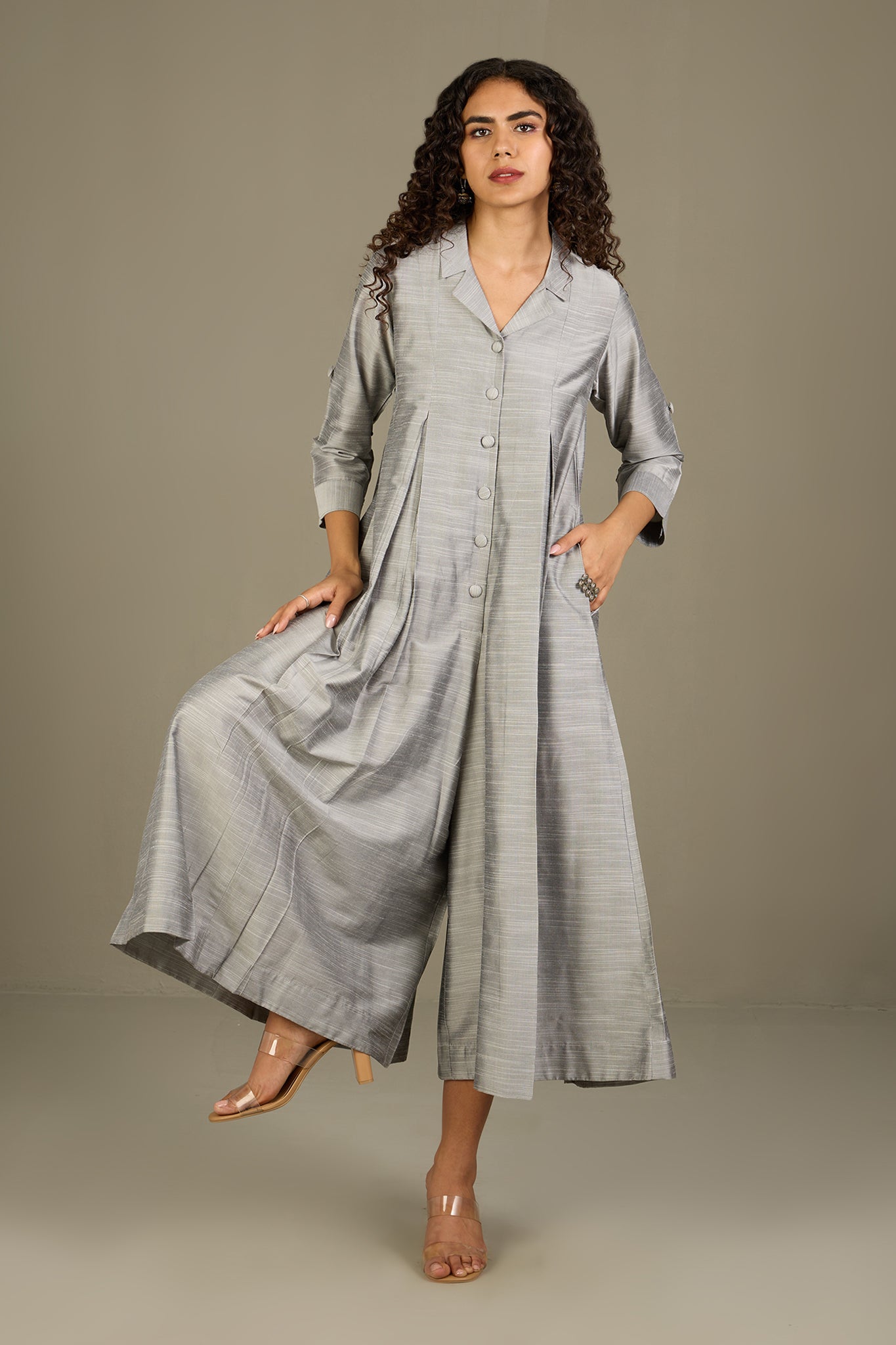 Gleaming Silver Silk Slub Jumpsuit with Pockets & Collar