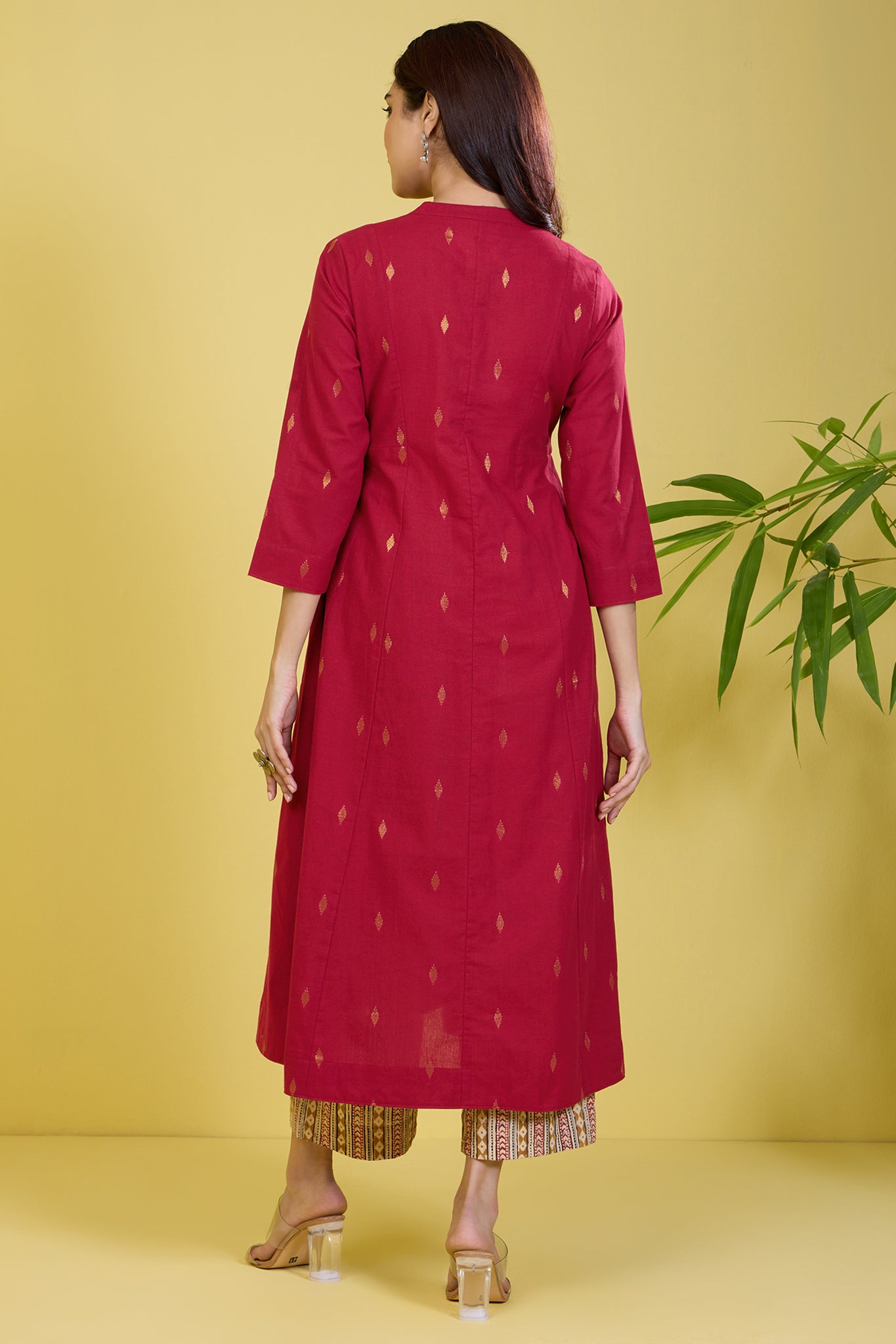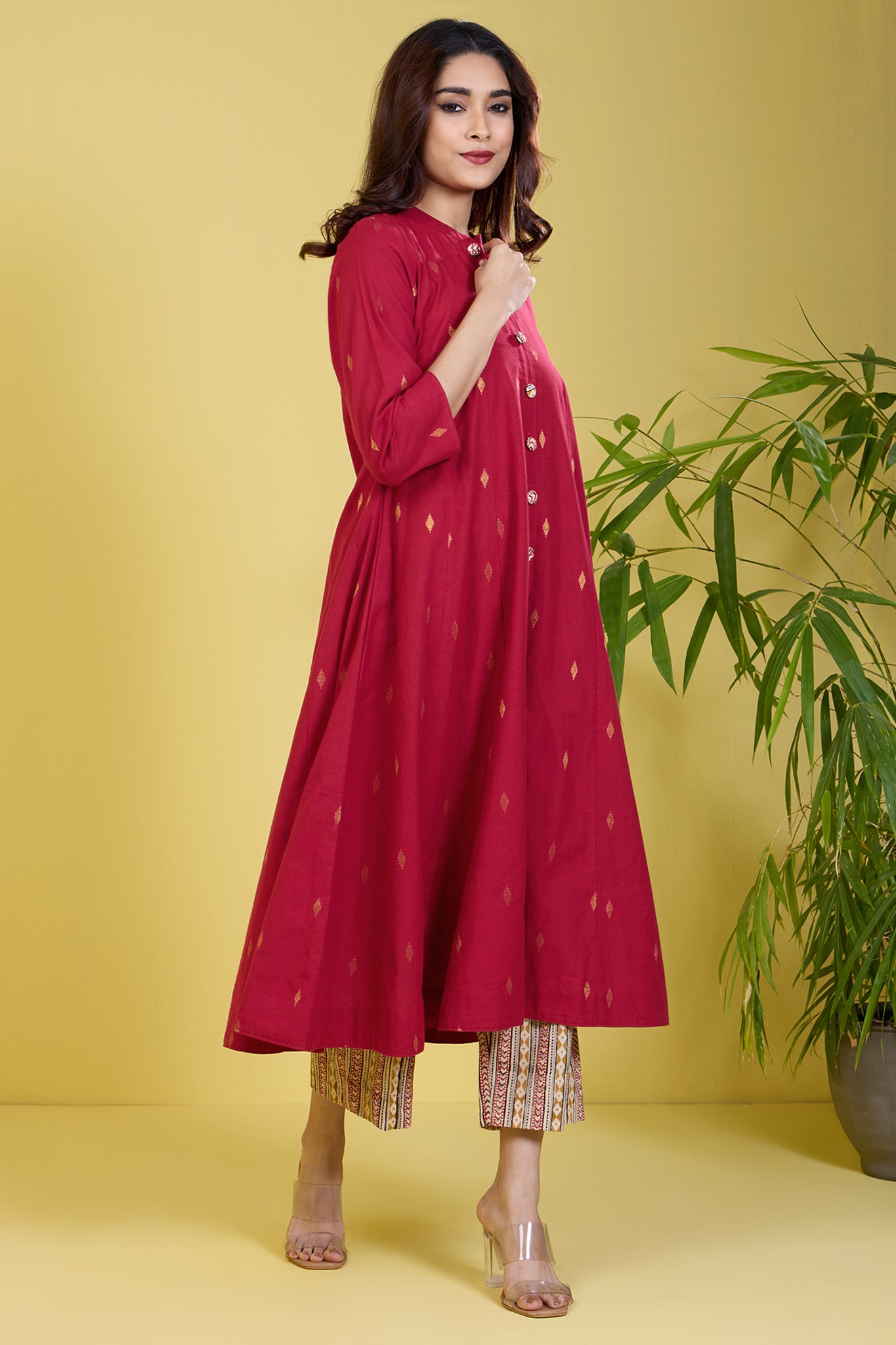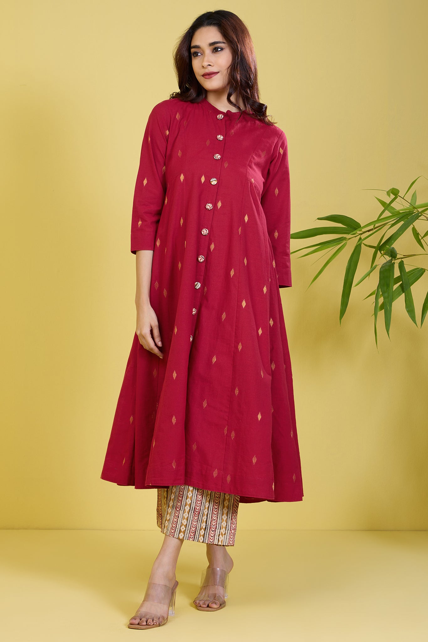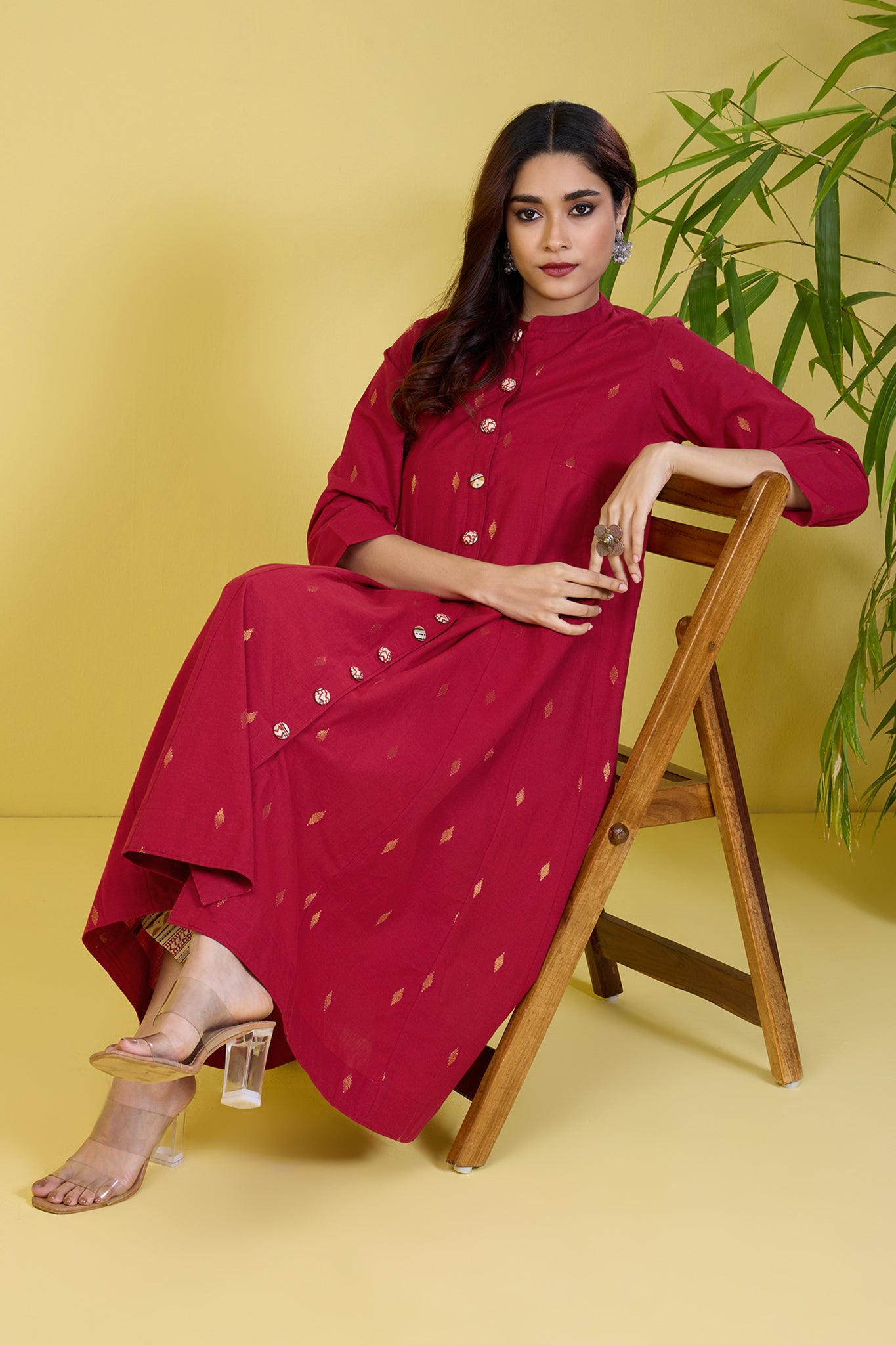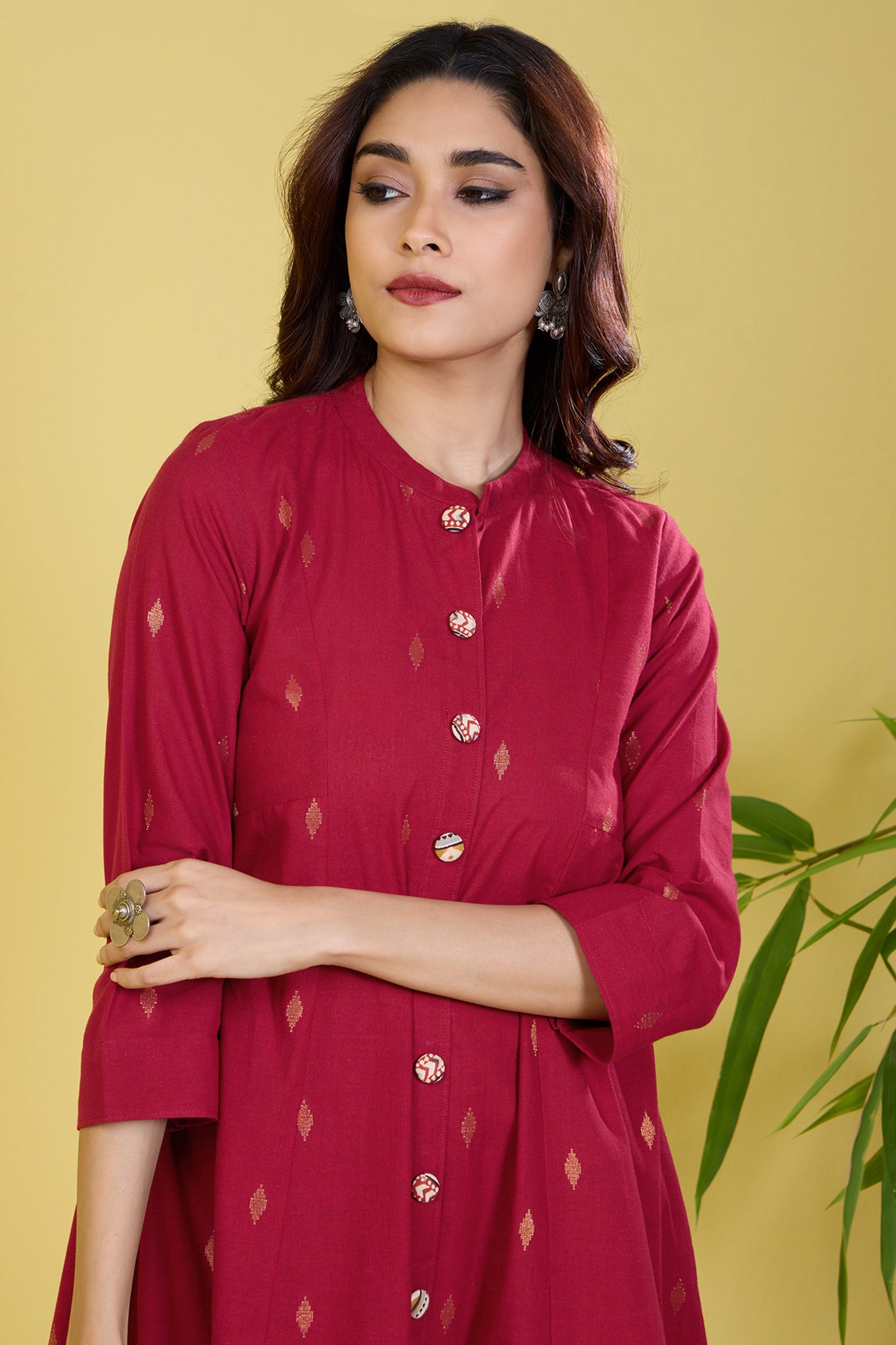 Indulge in the timeless elegance of Maati's Long Button Down Anarkali Dress, a masterpiece in festive pink & golden buttis all over. This exquisite dress boasts a delicate geometric pattern, intricately woven together with the signature Maati touch of combinations, creating a visual symphony that's truly captivating. Adorned with handmade buttons all over the front, this dress unveils a delightful surprise of combinations. The collared neckline adds a touch of sophistication, making it perfect for pre-festive gatherings or any occasion where you want to make a statement. Crafted from soft and breathable cotton, this dress ensures year-round comfort and is an ideal choice for all seasons. For a daytime look, slip into your favorite sandals and accessorize with a kalamkari trouser as shown in the image. As evening falls, swap to heels and add a touch of sparkle with elegant jewelry for a refined and enchanting appearance.