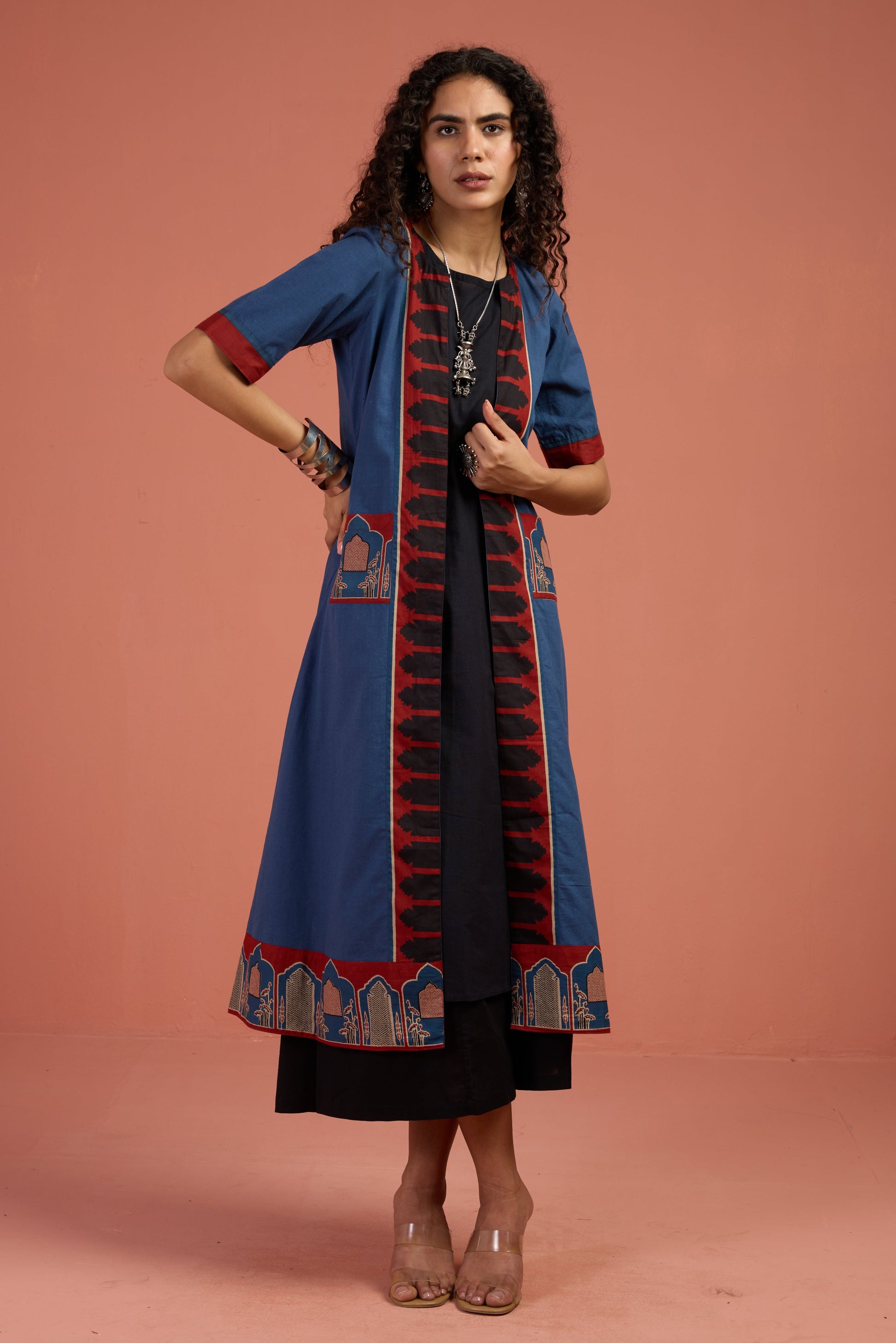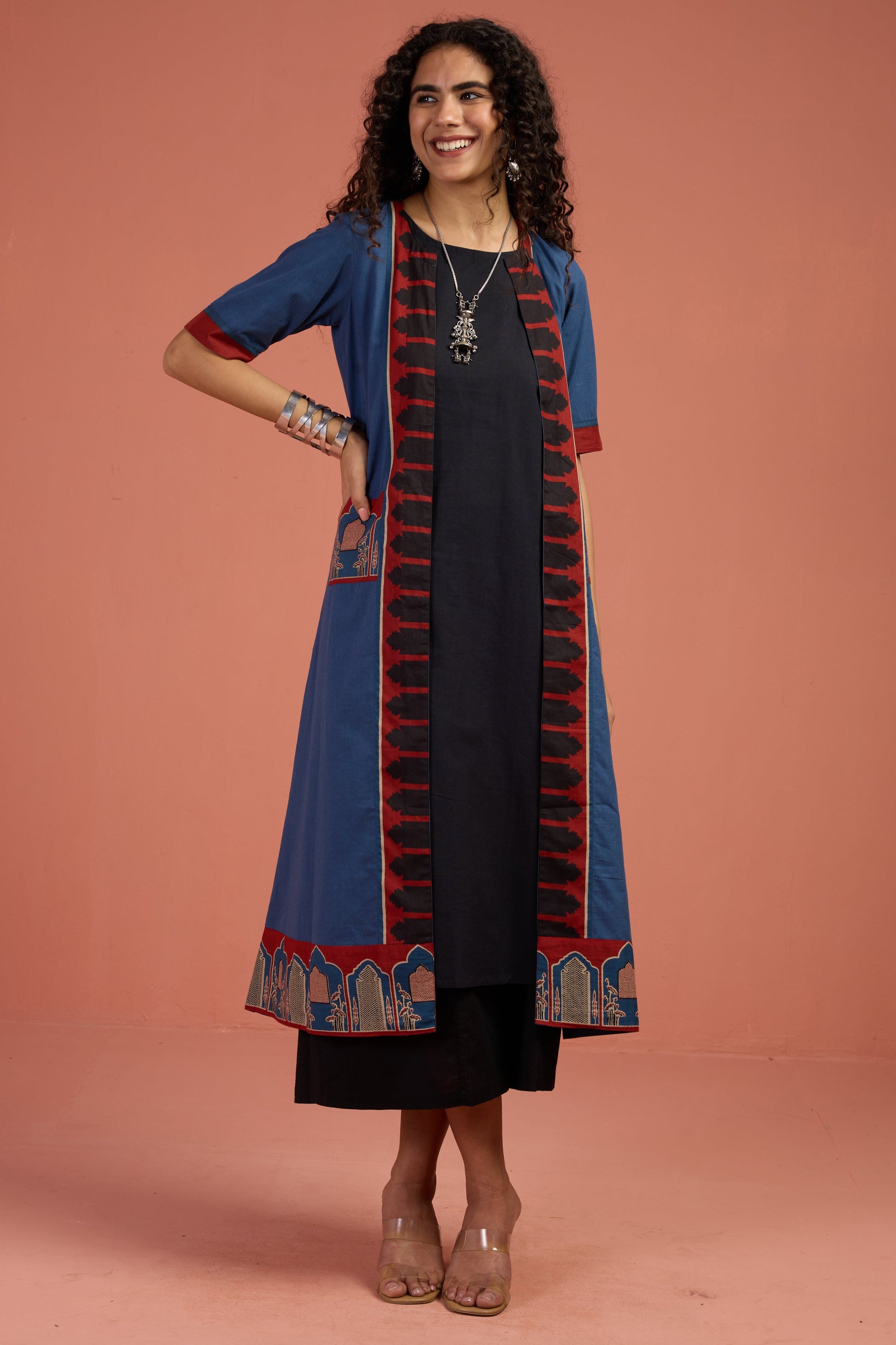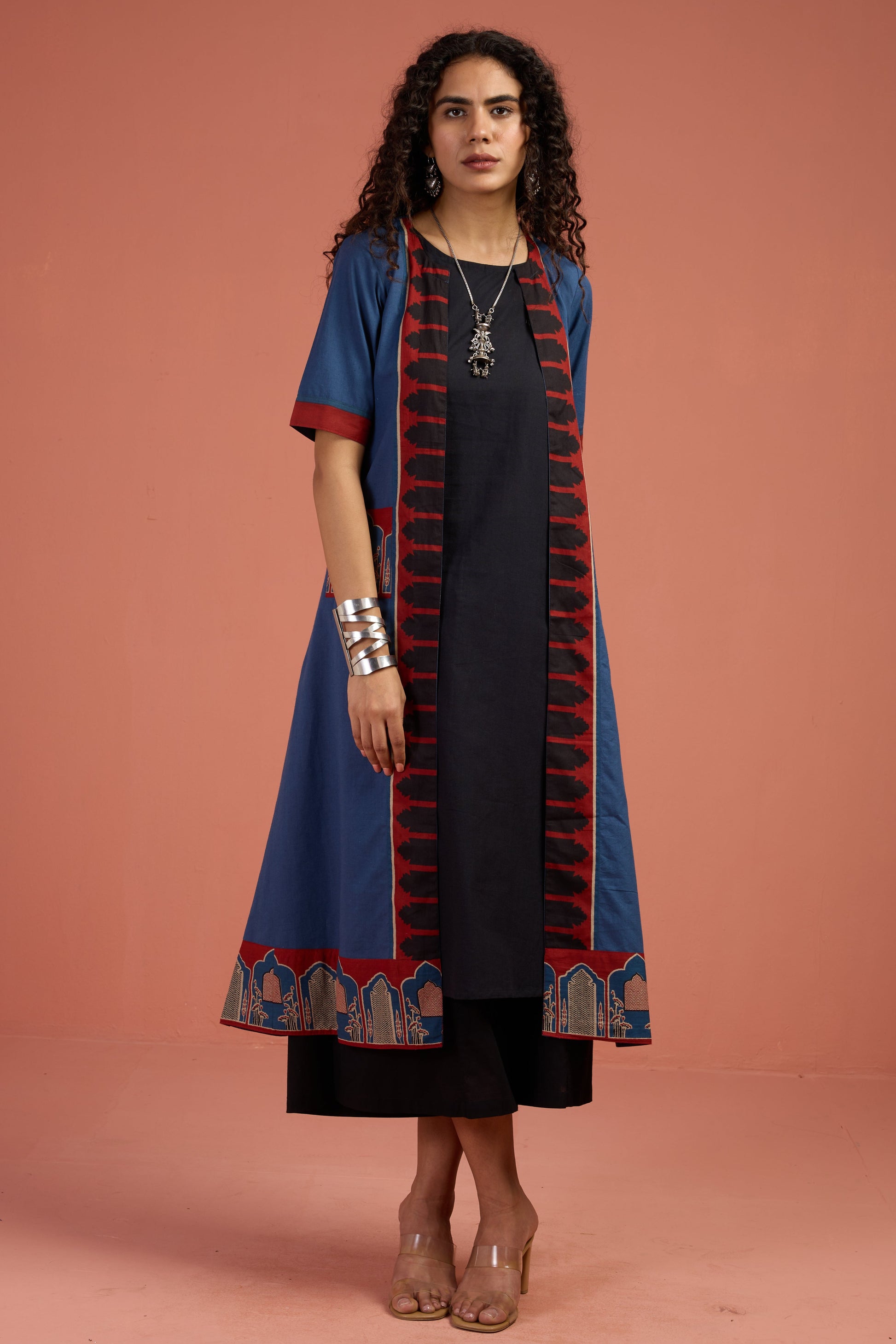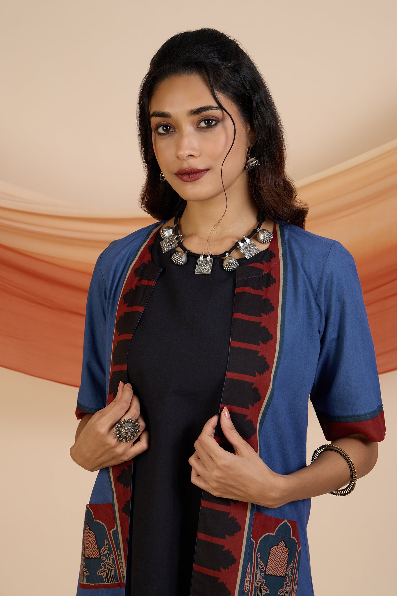 Coord Set Jacket Blue Cotton With Ajrakh Border With Pockets And Sleeveless Black Inner Dress by Maati Crafts
