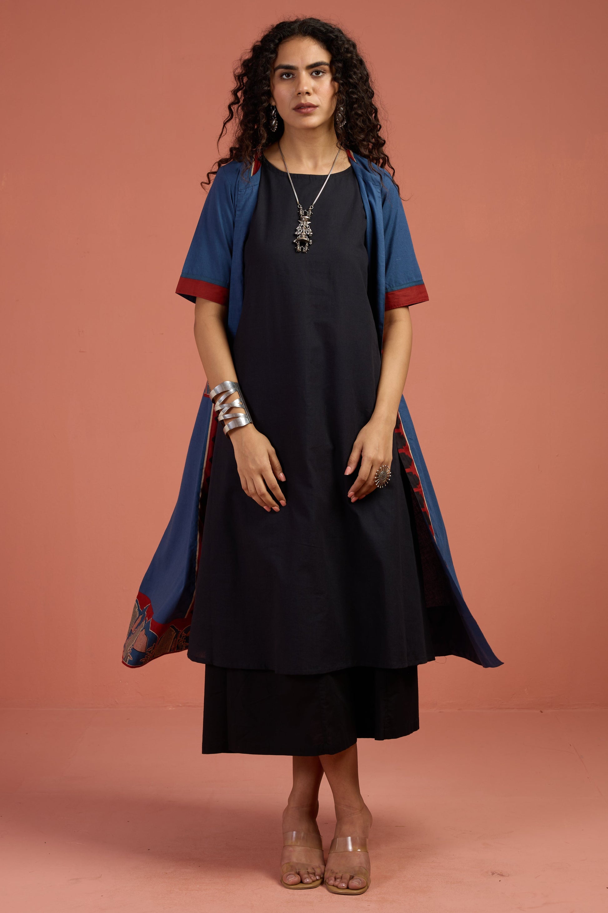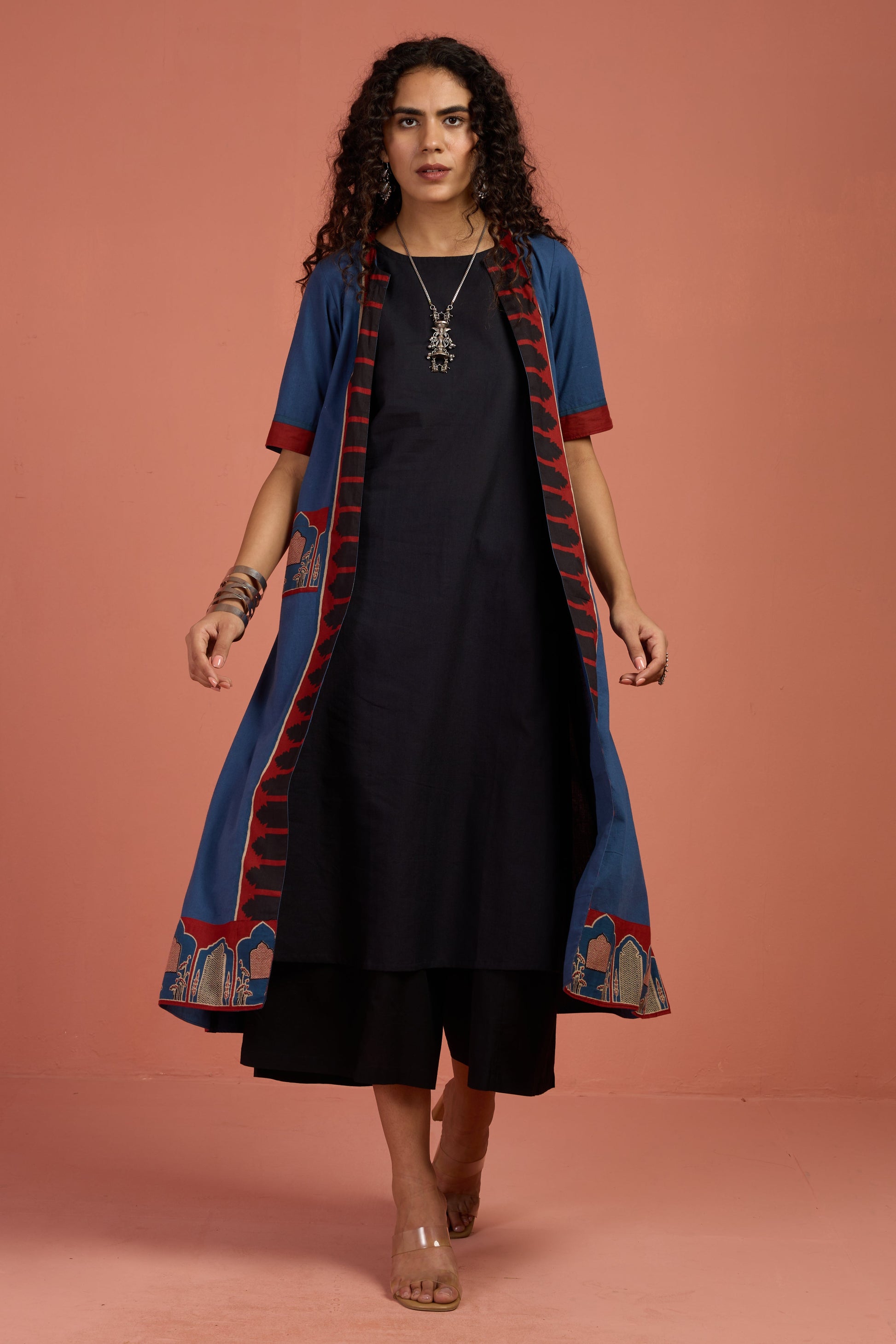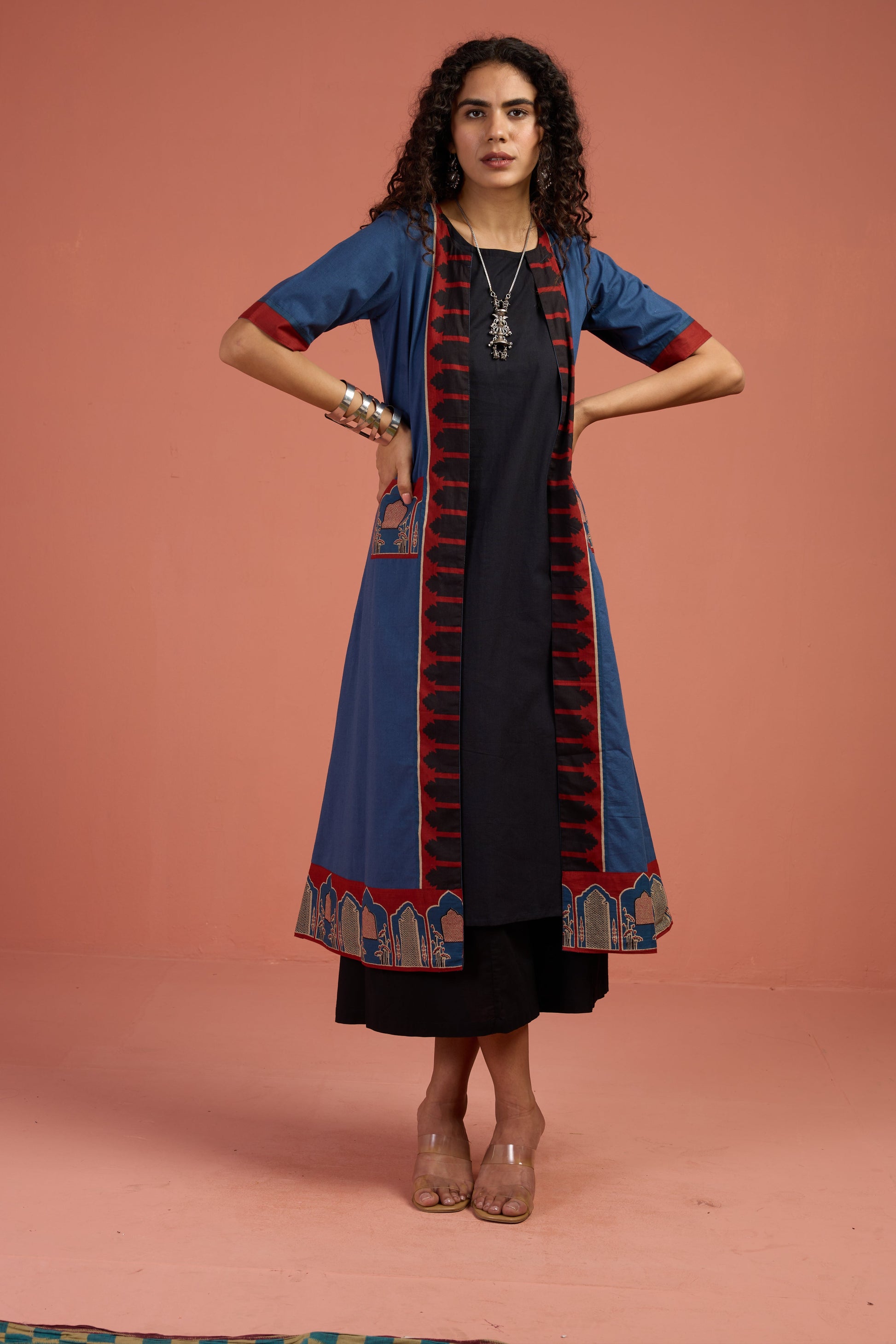 Coord Set Jacket Blue Cotton With Ajrakh Border With Pockets And Sleeveless Black Inner Dress by Maati Crafts