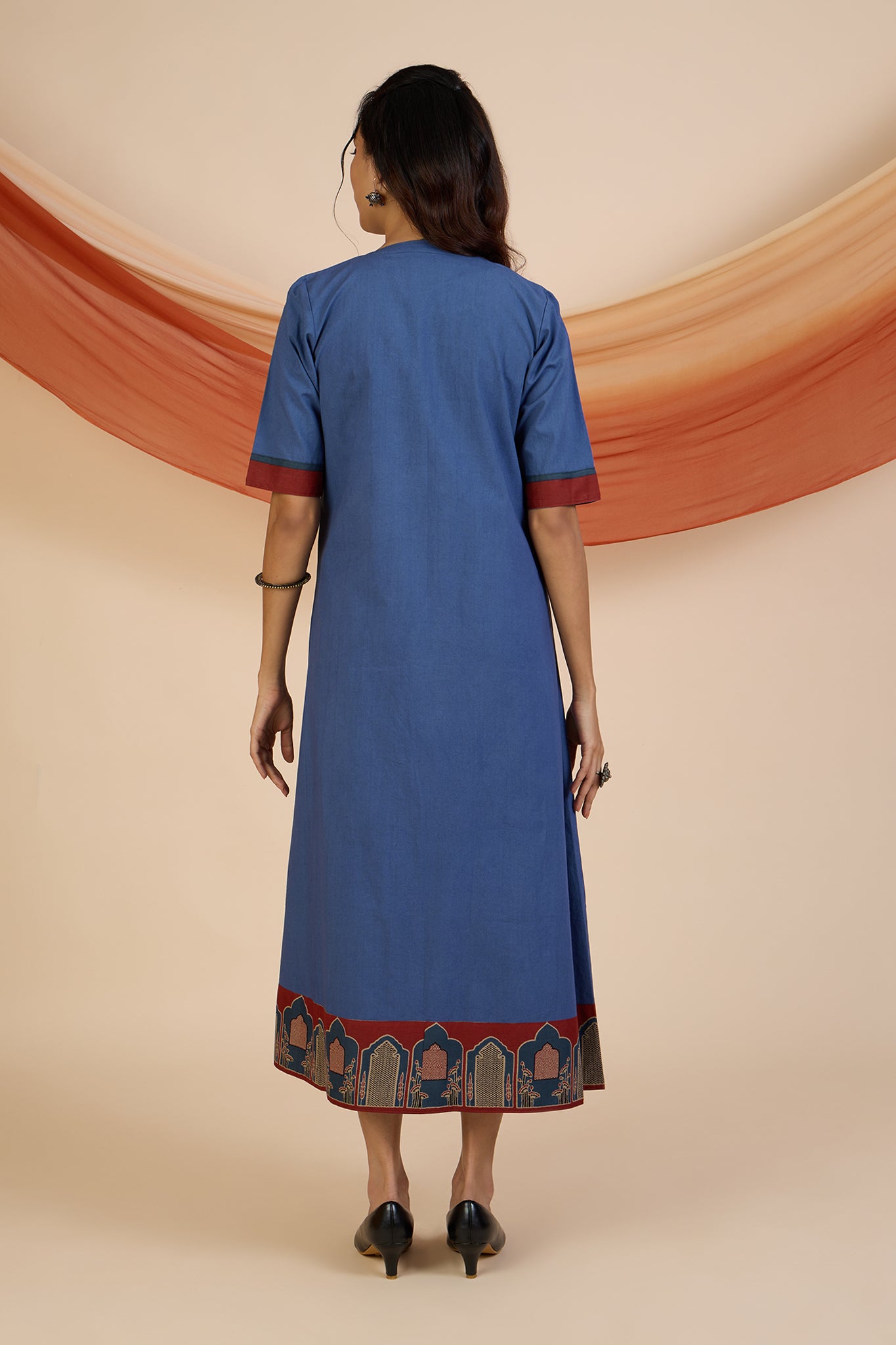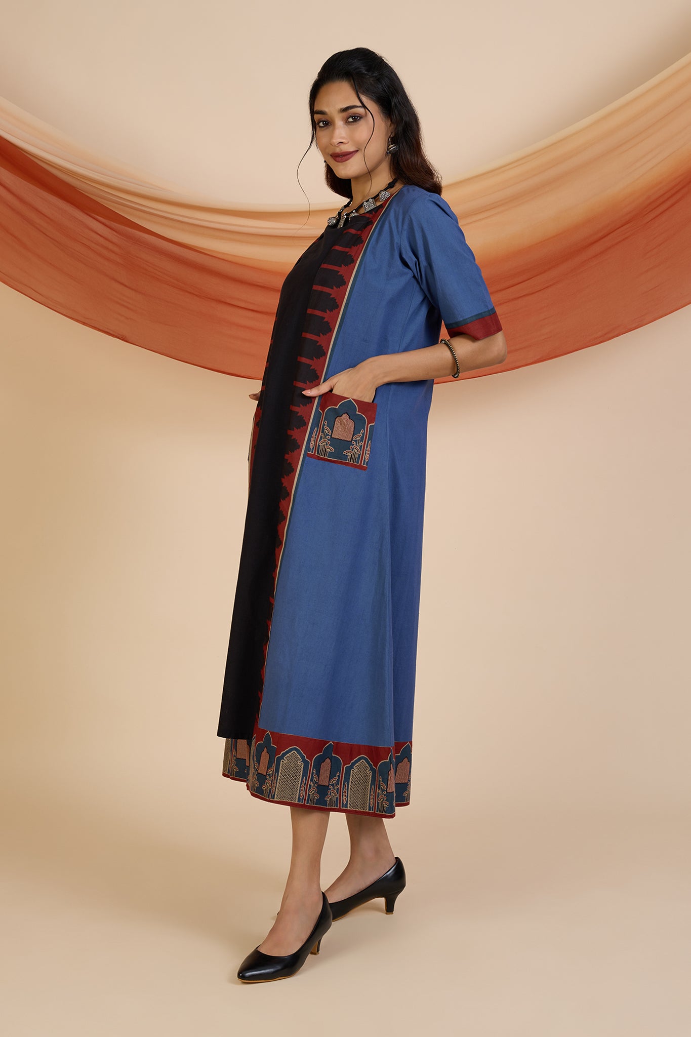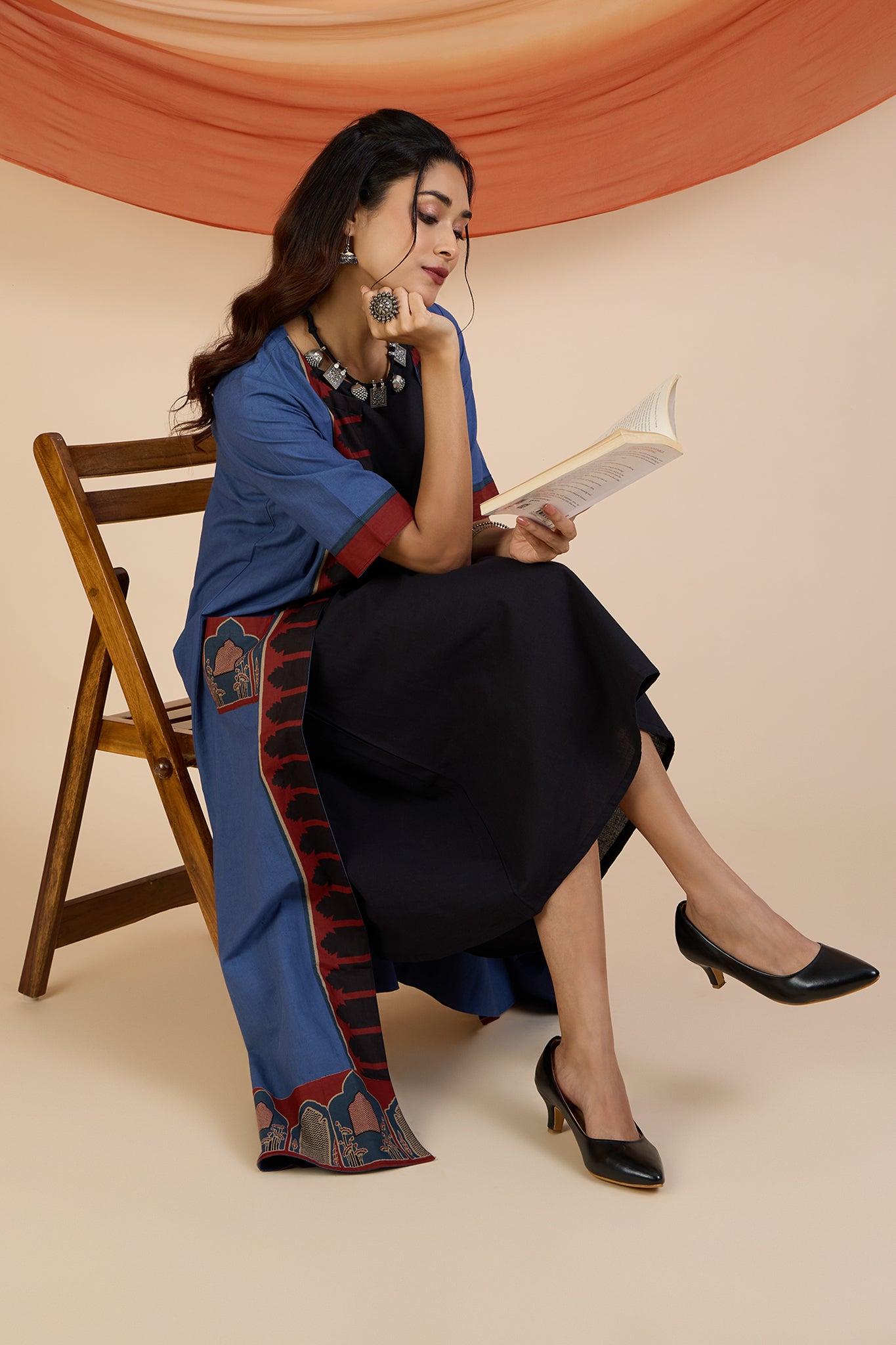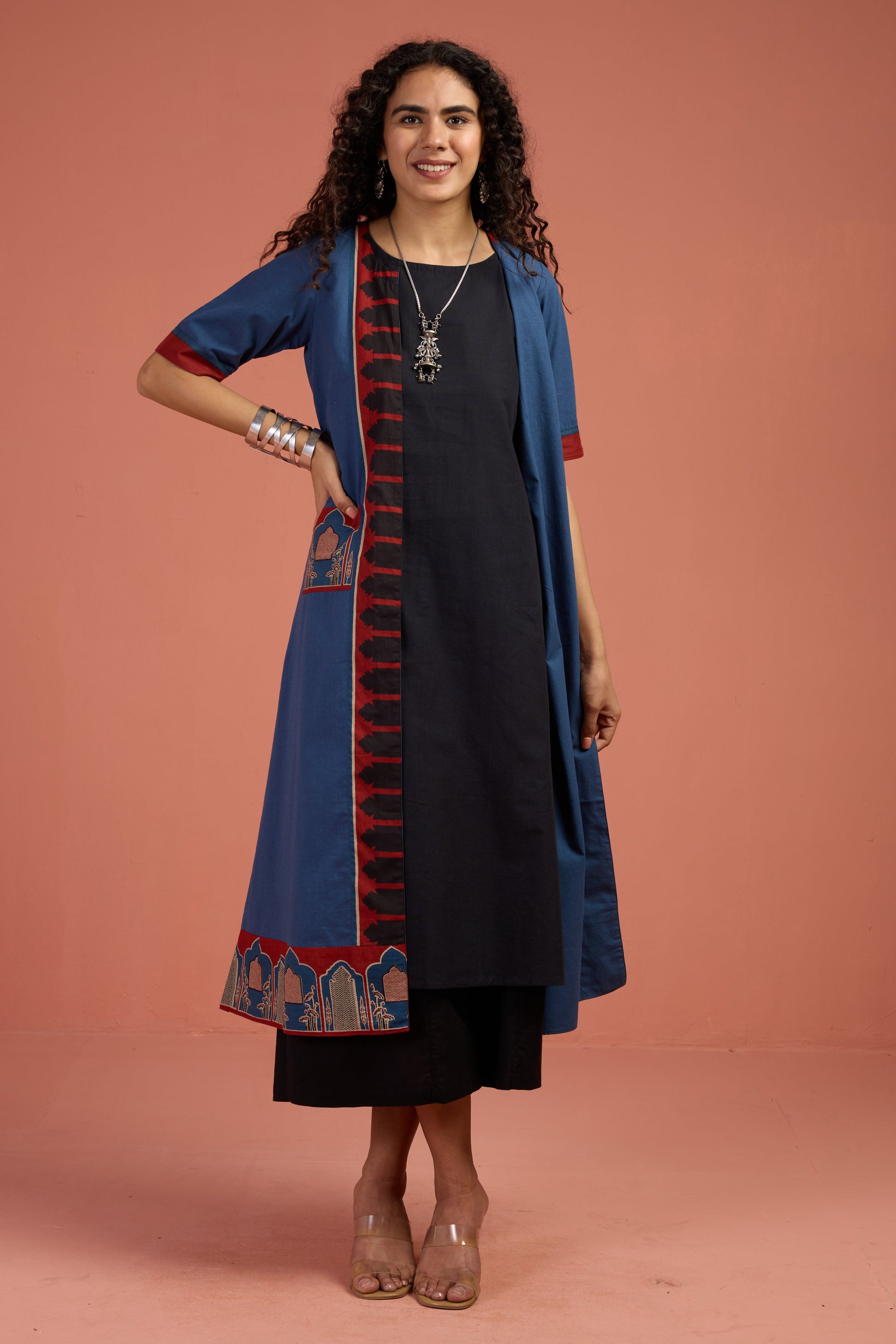 Coord Set Jacket Blue Cotton With Ajrakh Border With Pockets And Sleeveless Black Inner Dress by Maati Crafts