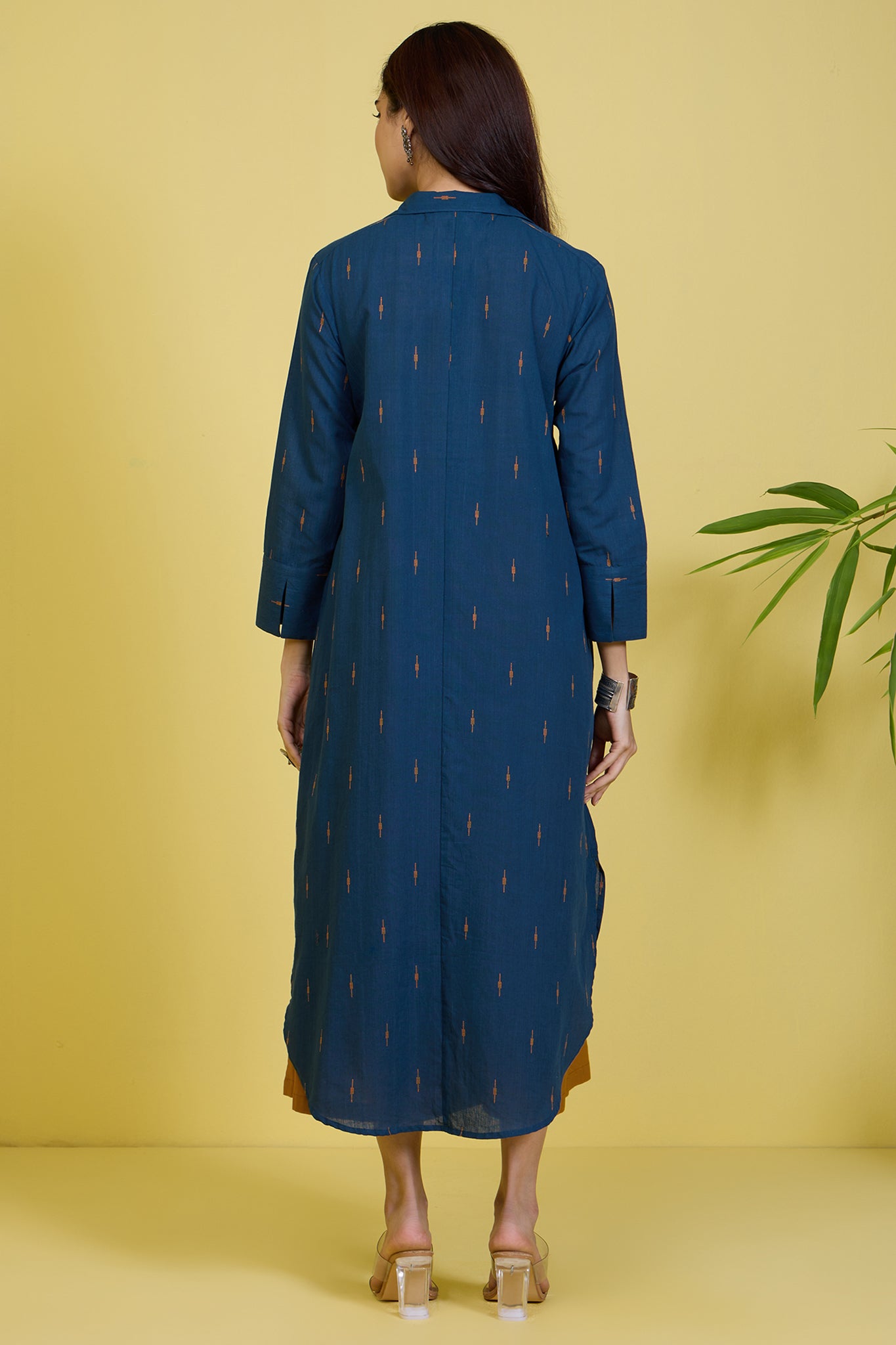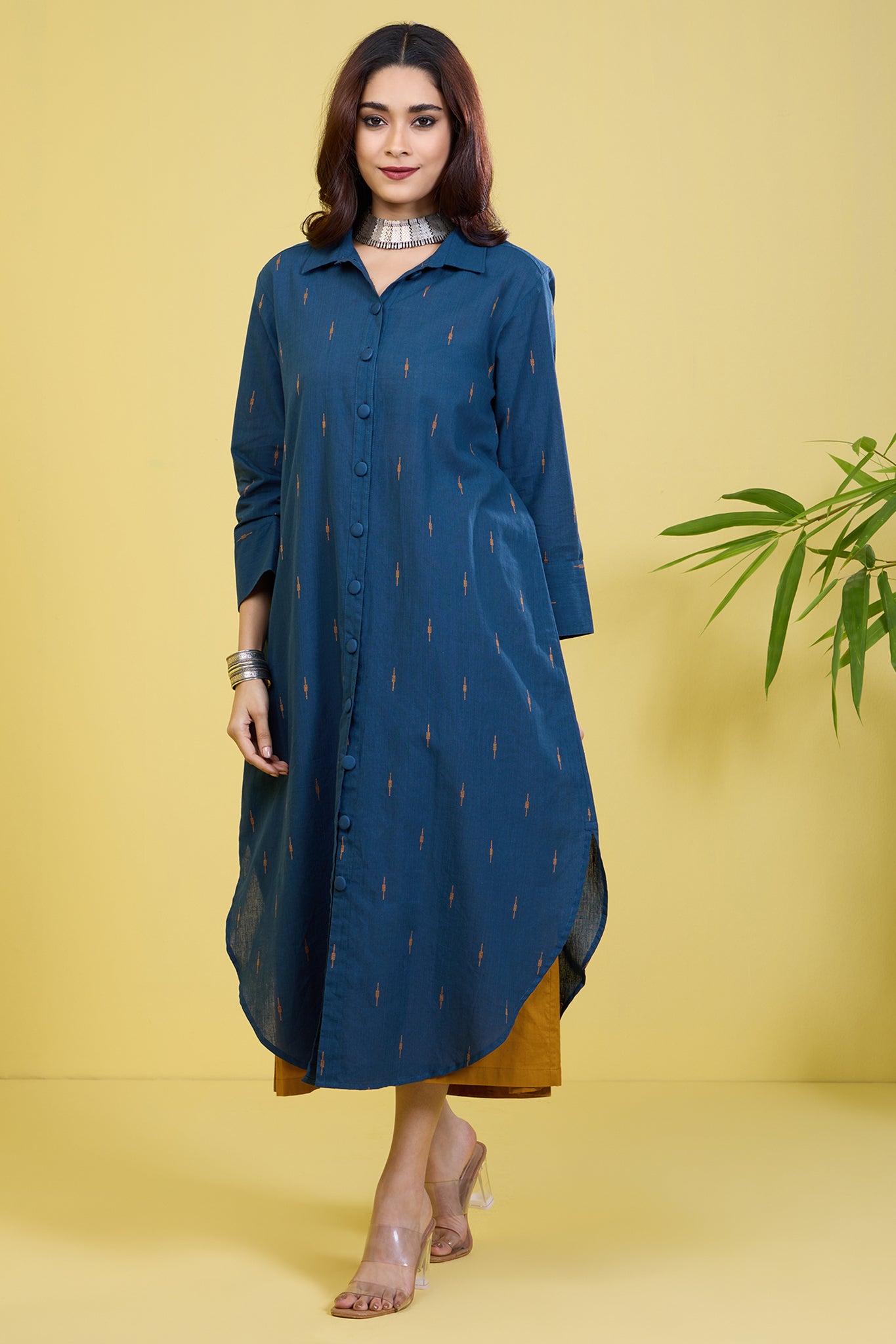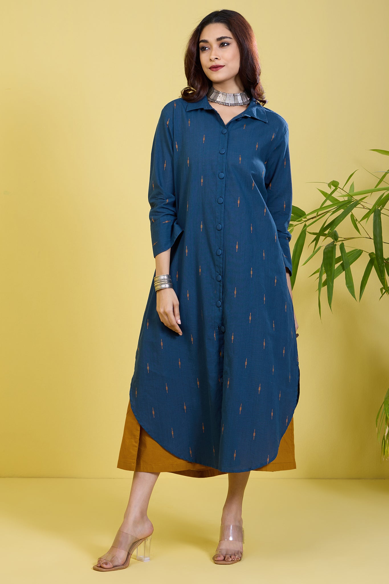 Introducing our contemporary Shirt Dress, a fusion of style and versatility. Crafted from 100% cotton, this button-down dress features a captivating indigo base adorned with delicate ochre yellow motifs throughout, adding an artisanal touch to your ensemble. Handblock printed to perfection, it boasts intricate detailing that speaks to its artisanal craftsmanship. A bestseller loved for its versatility, it effortlessly transitions from work to leisure, ensuring comfort without compromising on style. Wear it as a shirt for a polished look, or layer it over your outfit as a jacket for added flair. Elevate your wardrobe with this fluid essential that exudes modern sophistication, making it a must-have for every contemporary woman.