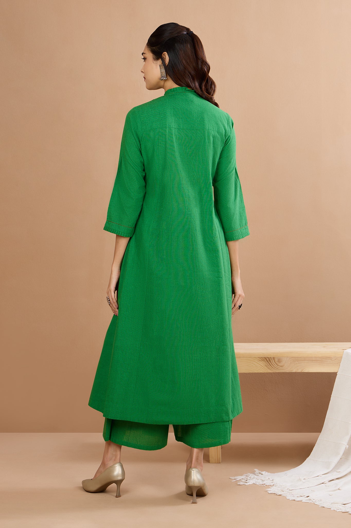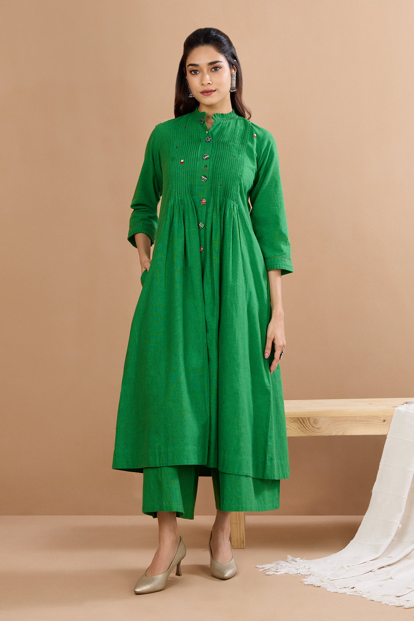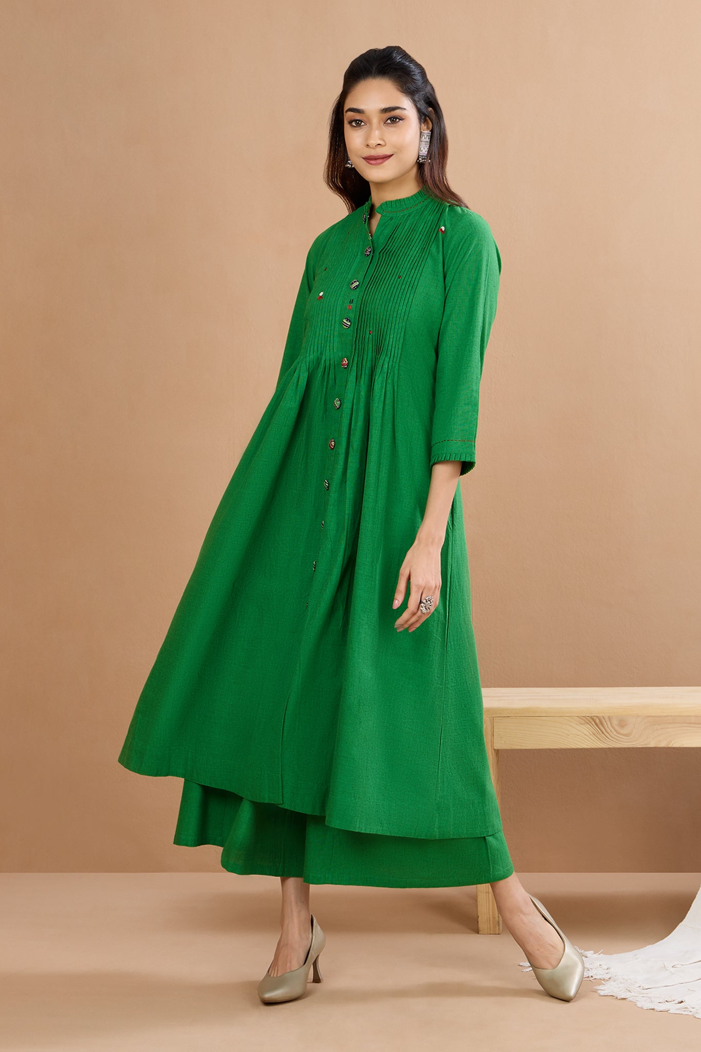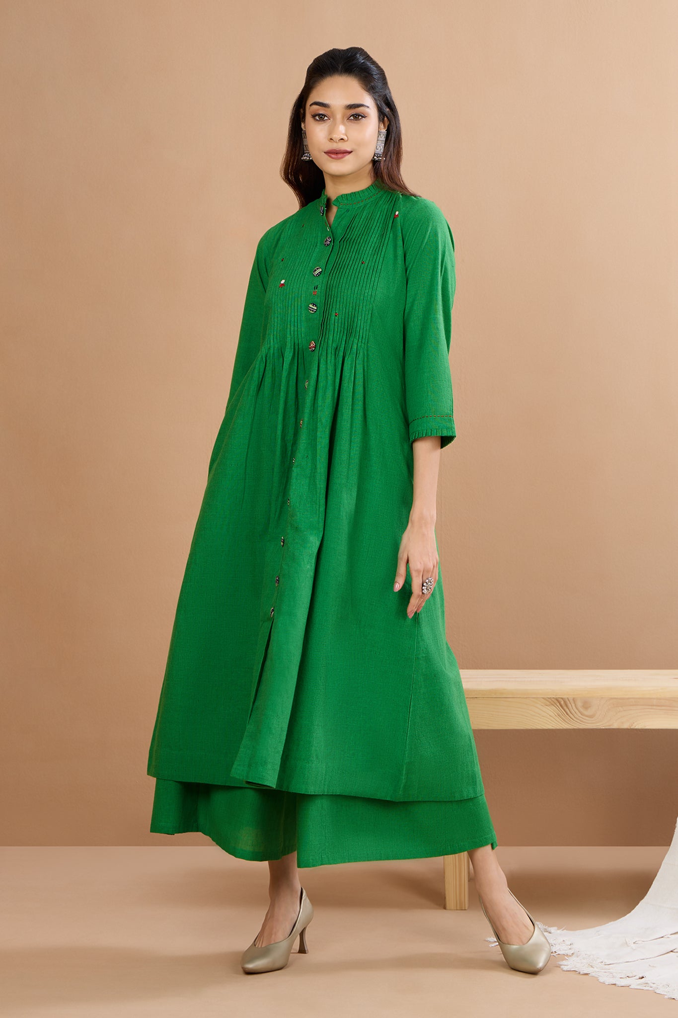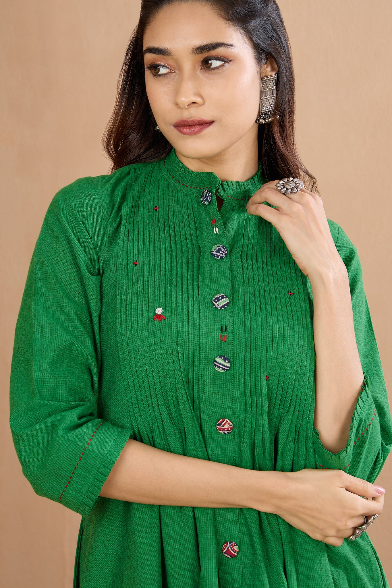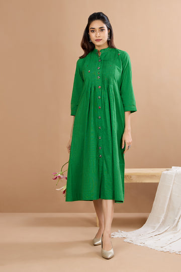 Indulge in timeless sophistication with our Parrot Green Midi Dress. Adorned with pleated neck and sleeve details for an exquisite touch, this luxurious cotton dress features delicate handmade contrast buttons and soft placket details, exuding elegance. The button-down design with a sealed placket and pintuck detailing showcases meticulous craftsmanship. Versatile and chic, it seamlessly transitions from day to night, whether worn solo or paired with our classic culottes. With pockets for added comfort, this dress epitomizes adaptability and style, making it a bestseller. Elevate your wardrobe with this refined piece, destined to become a staple favorite.