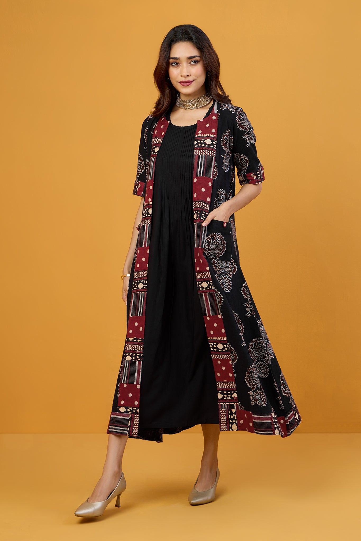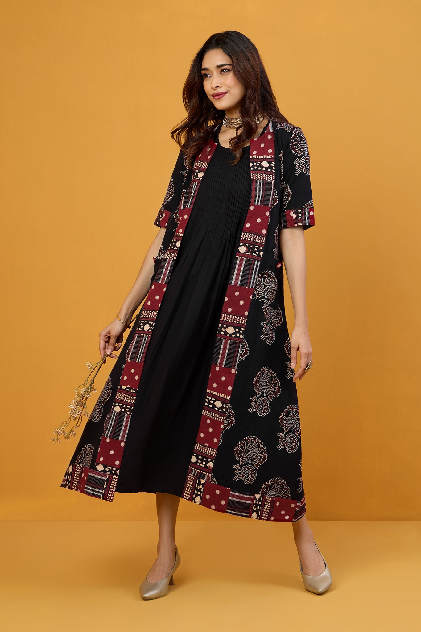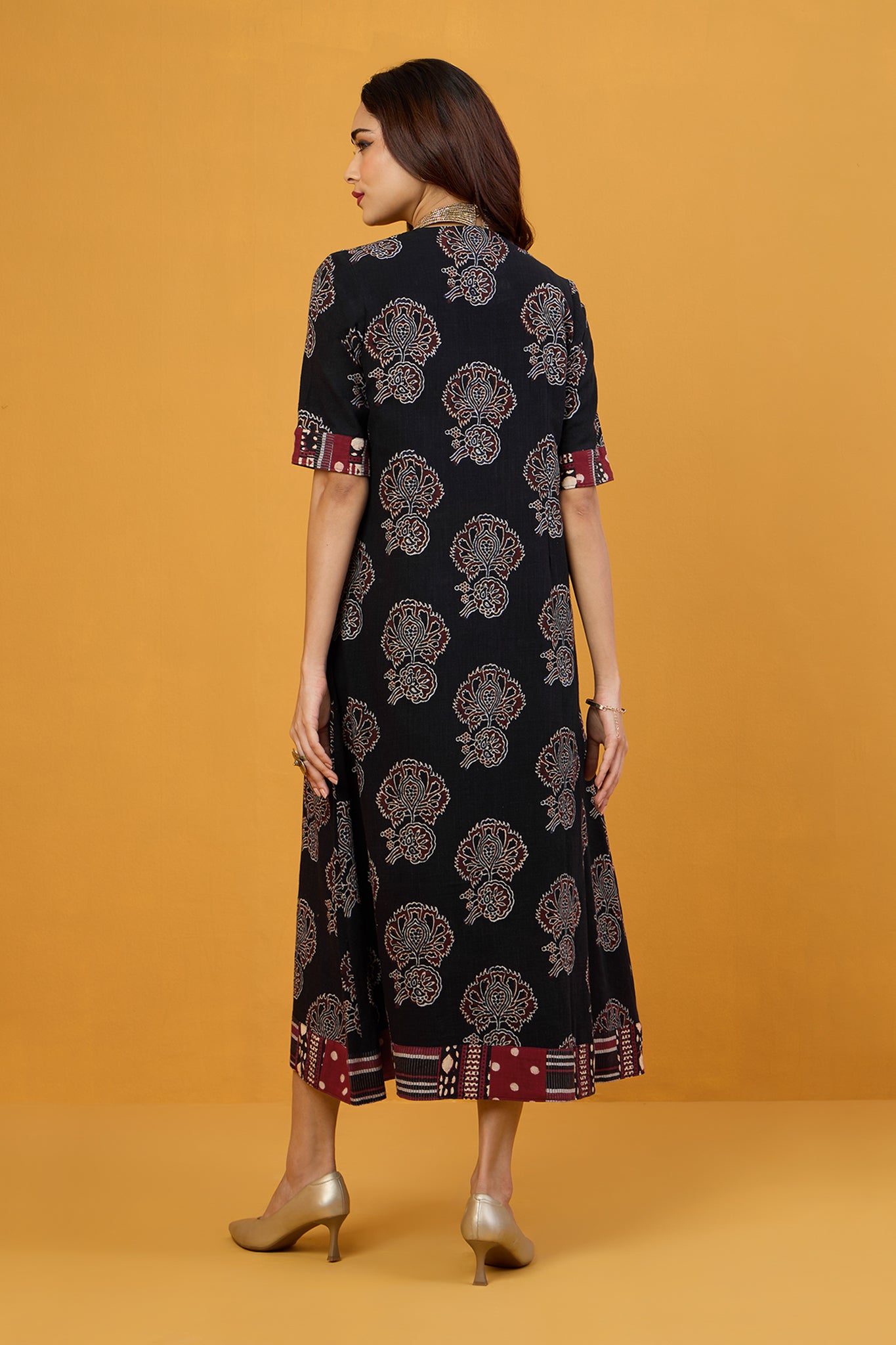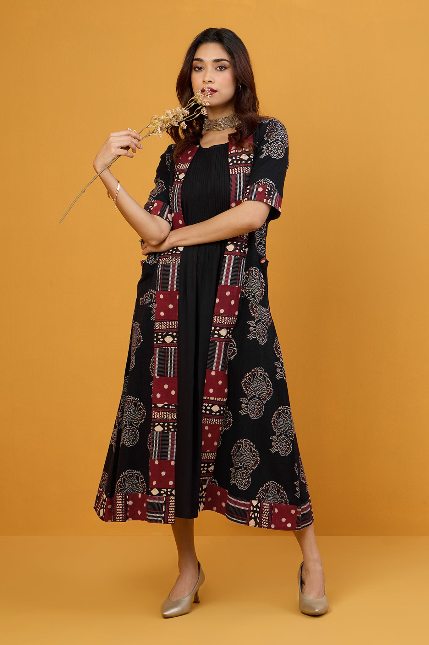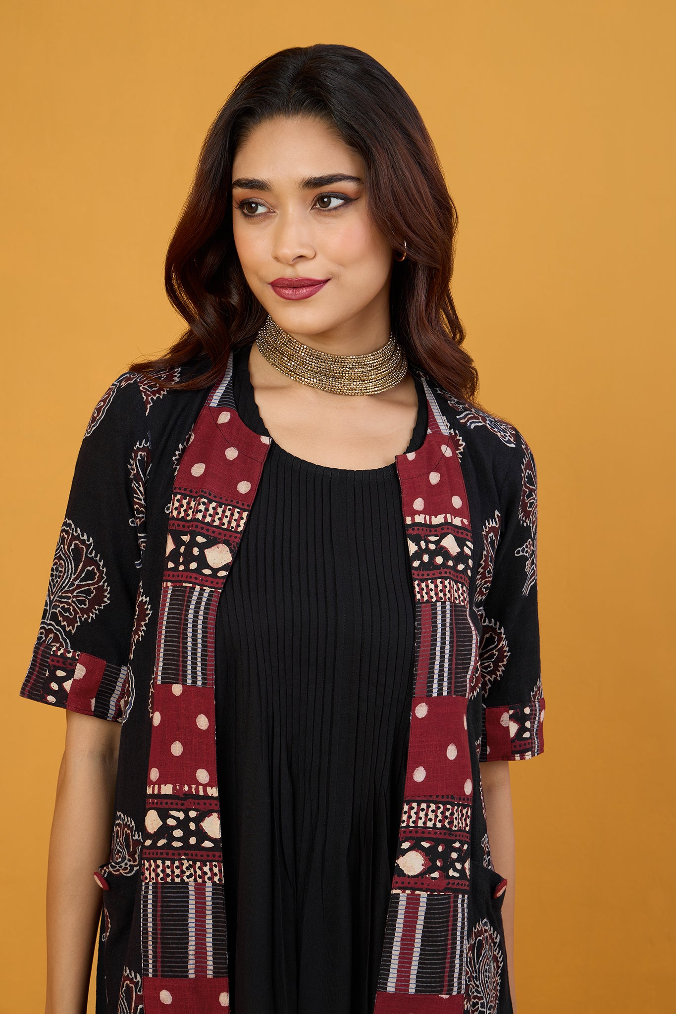 Introducing our Black slub Cotton Jacket with bold floral motifs hand block printed in hues of red, a timeless piece that enhances any wardrobe. Featuring a tailored fit, this jacket boasts a round neckline and elegant elbow sleeves, combining style with comfort. The soft fabric, adorned with stunning crimson accents, adds a touch of sophistication to its classic black base. Perfect for year-round wear, it effortlessly transitions from a chic addition to dresses to a stylish layer over denims or shorts. Embrace the versatility and understated elegance of this jacket, designed to make a refined statement in any season. Discover the beauty of subtle hues and versatile styling.