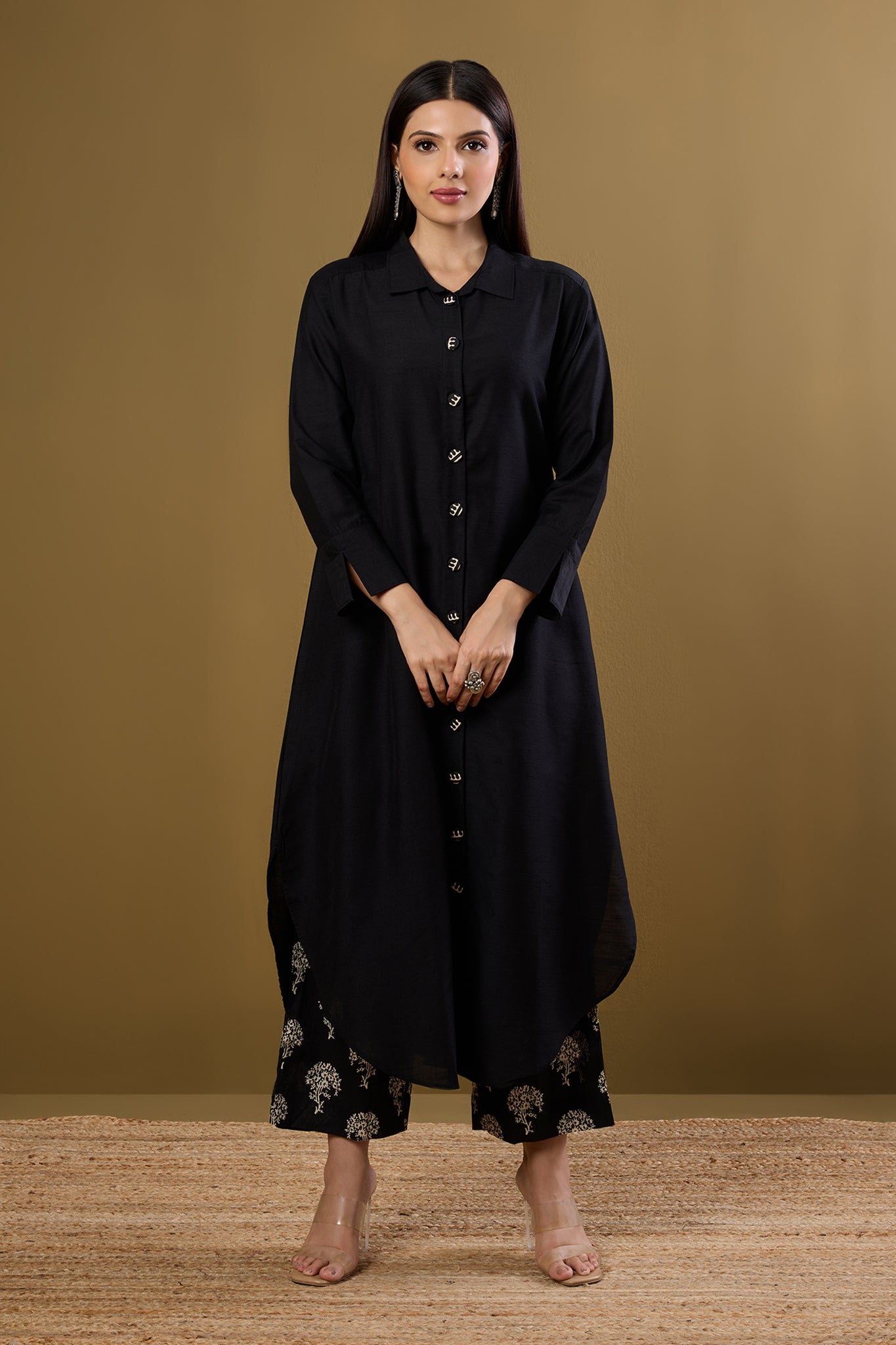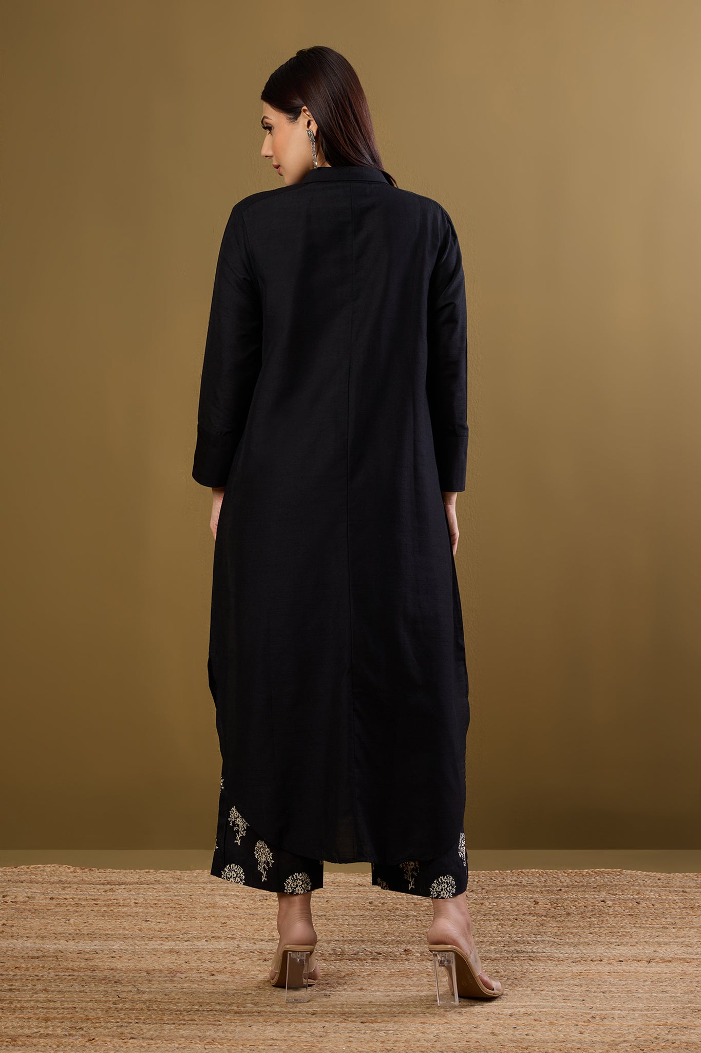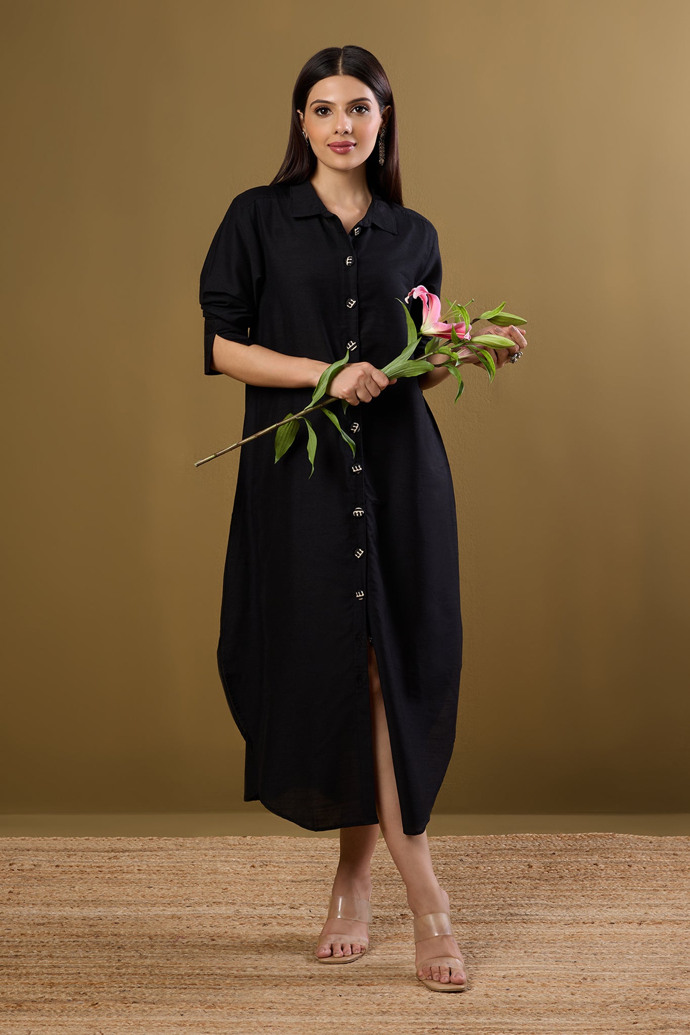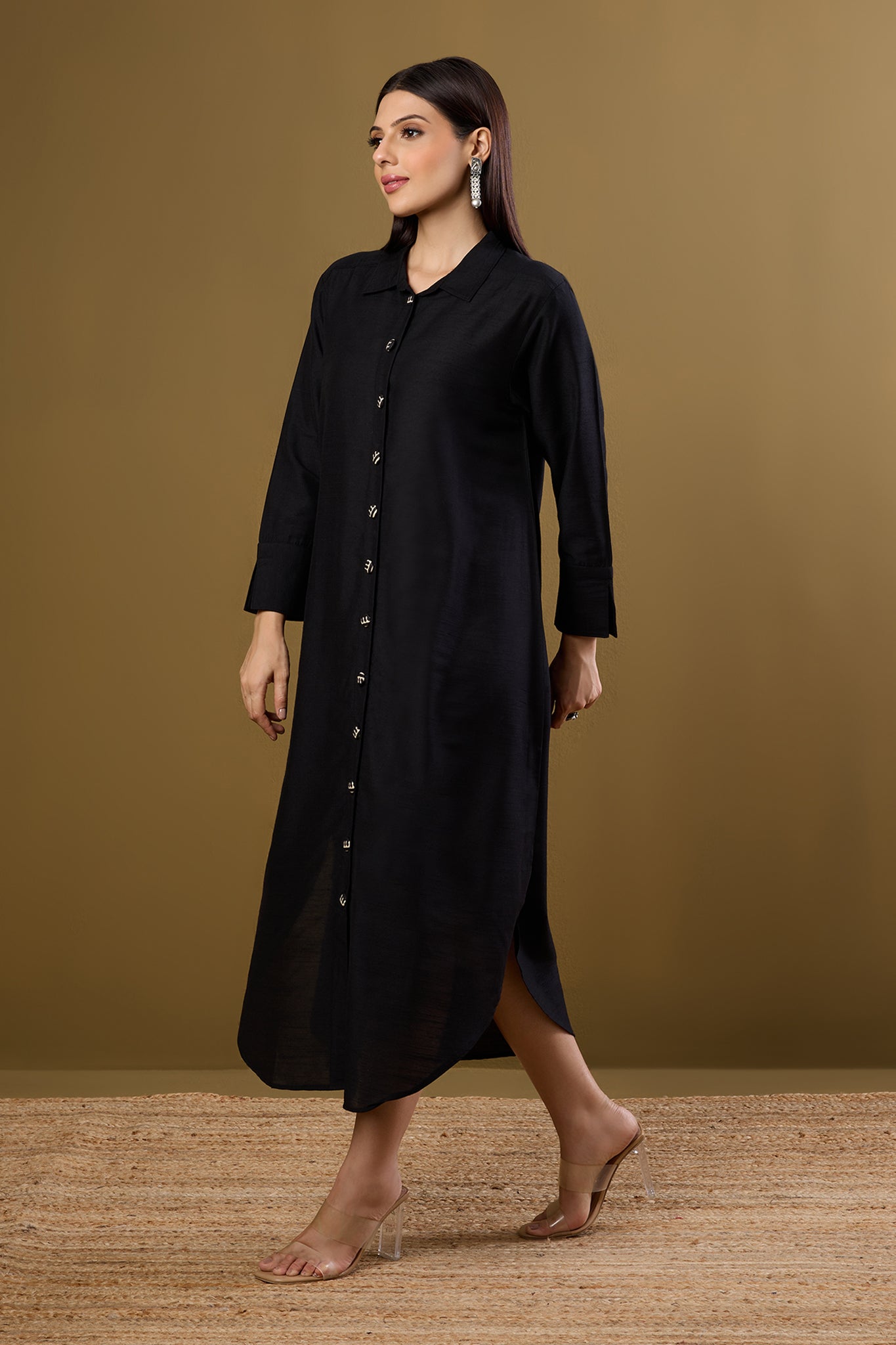 Button Down Rounded Hem Shirt Dress In Black Silk Slub Pockets by Maati Crafts