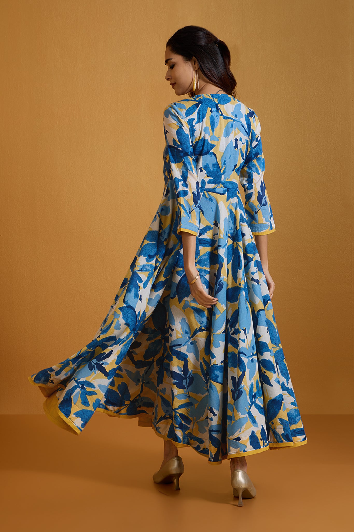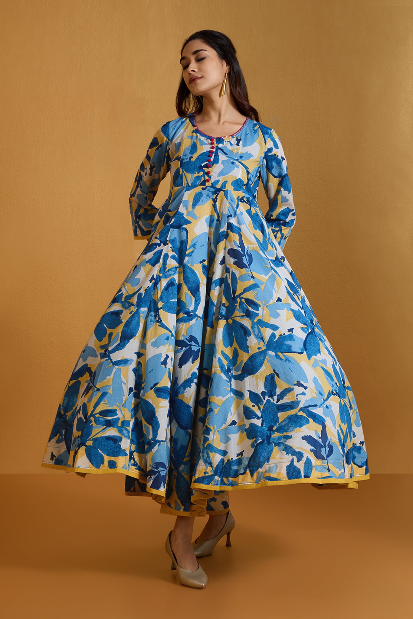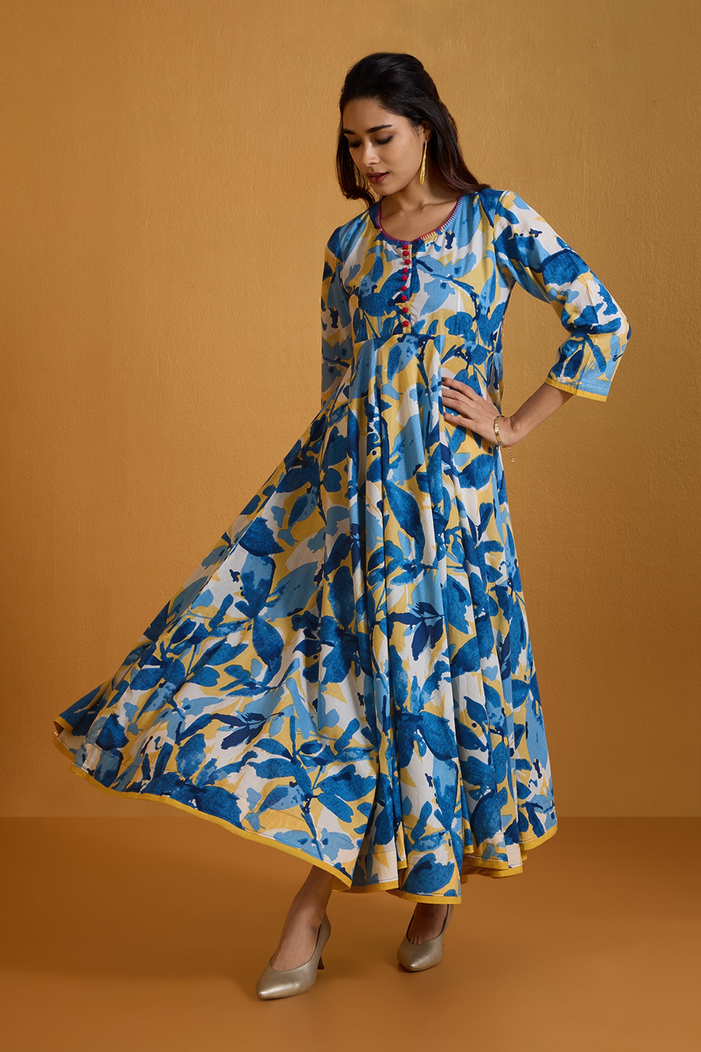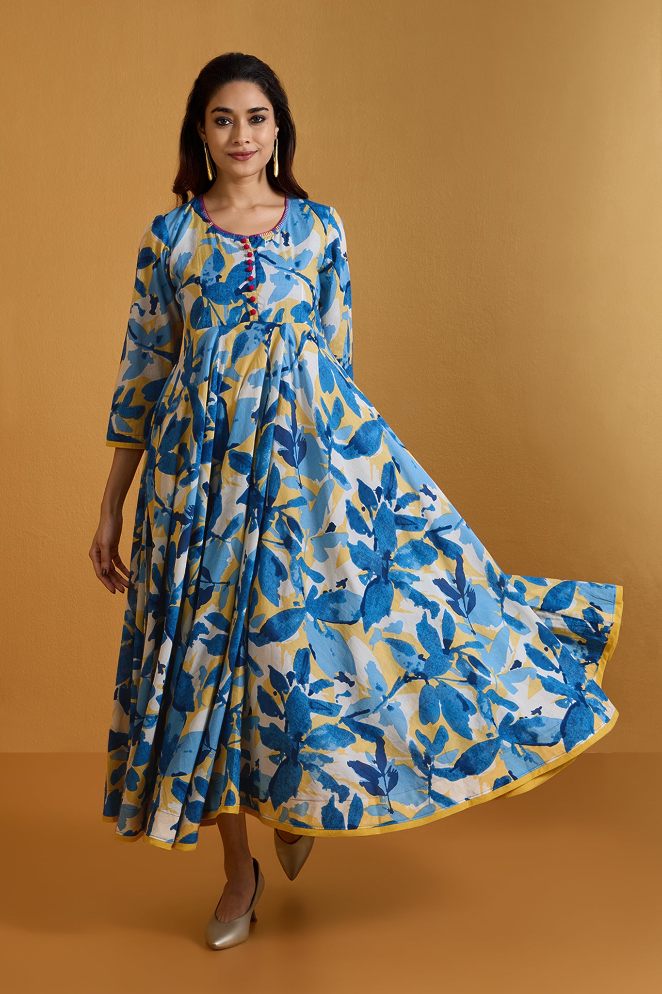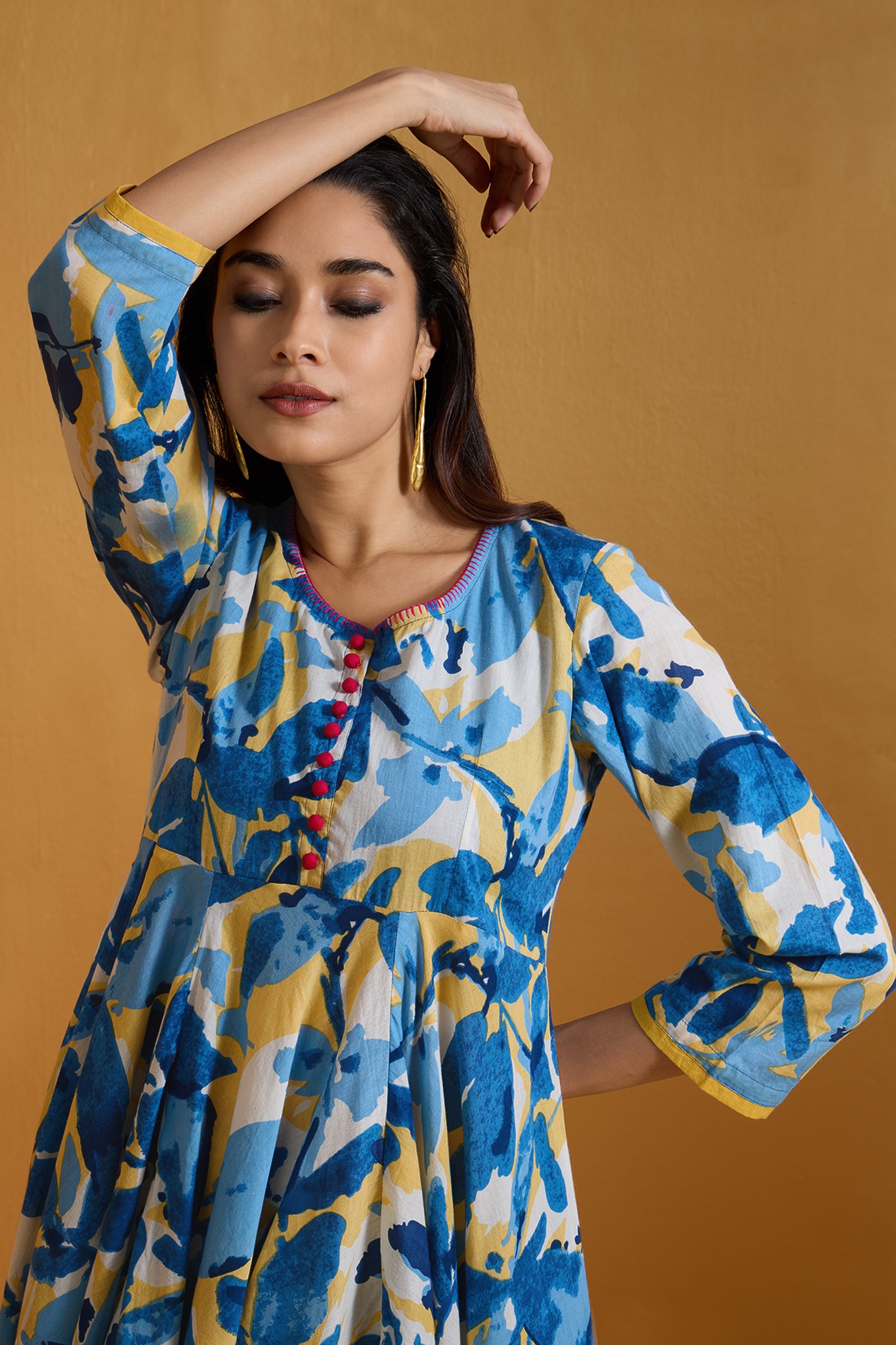Embrace effortless elegance with our handcrafted long dress, meticulously designed in soft cotton featuring vibrant hues of soft blues and yellow florals. The flattering fit ensures you’ll fall in love at first sight, while the exquisite handmade potli buttons in contrasting pink add a charming touch. Perfect for any occasion, from daytime adventures to evening gatherings, this dress is a versatile wardrobe essential. Elevate your look with a silver choker, or style it with juttis and a potli bag for festive celebrations. Crafted with love by our skilled karigars and women artisans in Mumbai, this dress captures the essence of Mughal elegance. Swirl away in this Maati bestseller and create a fluid wardrobe that allows you to express your unique style with each wear!