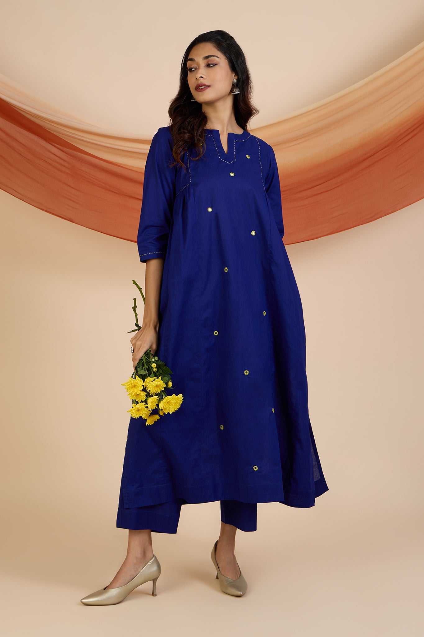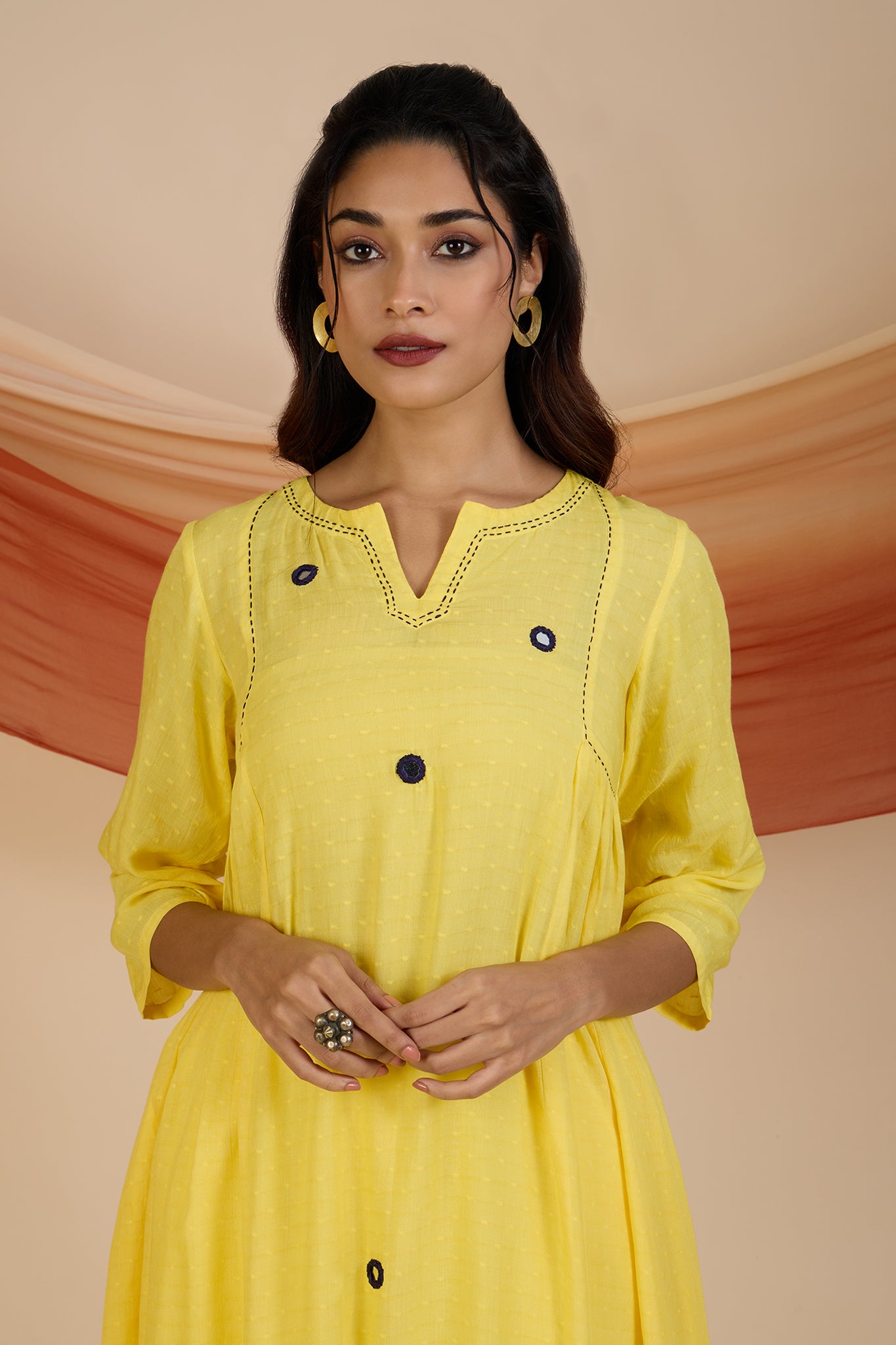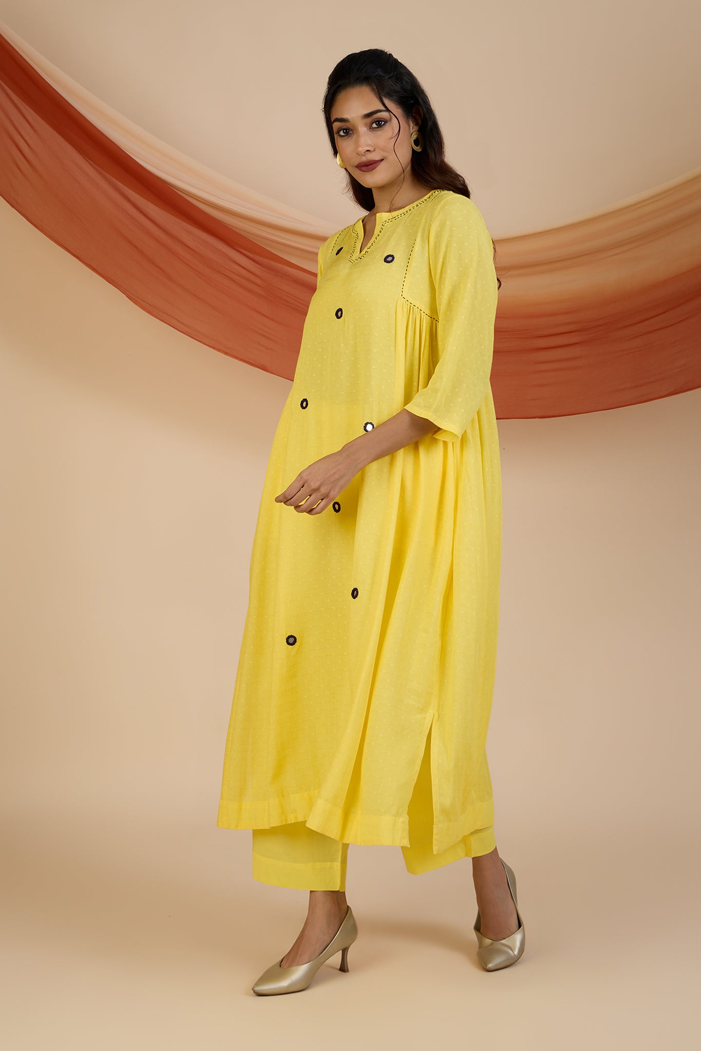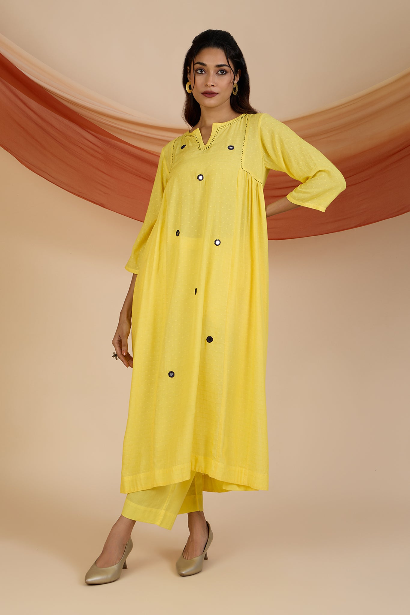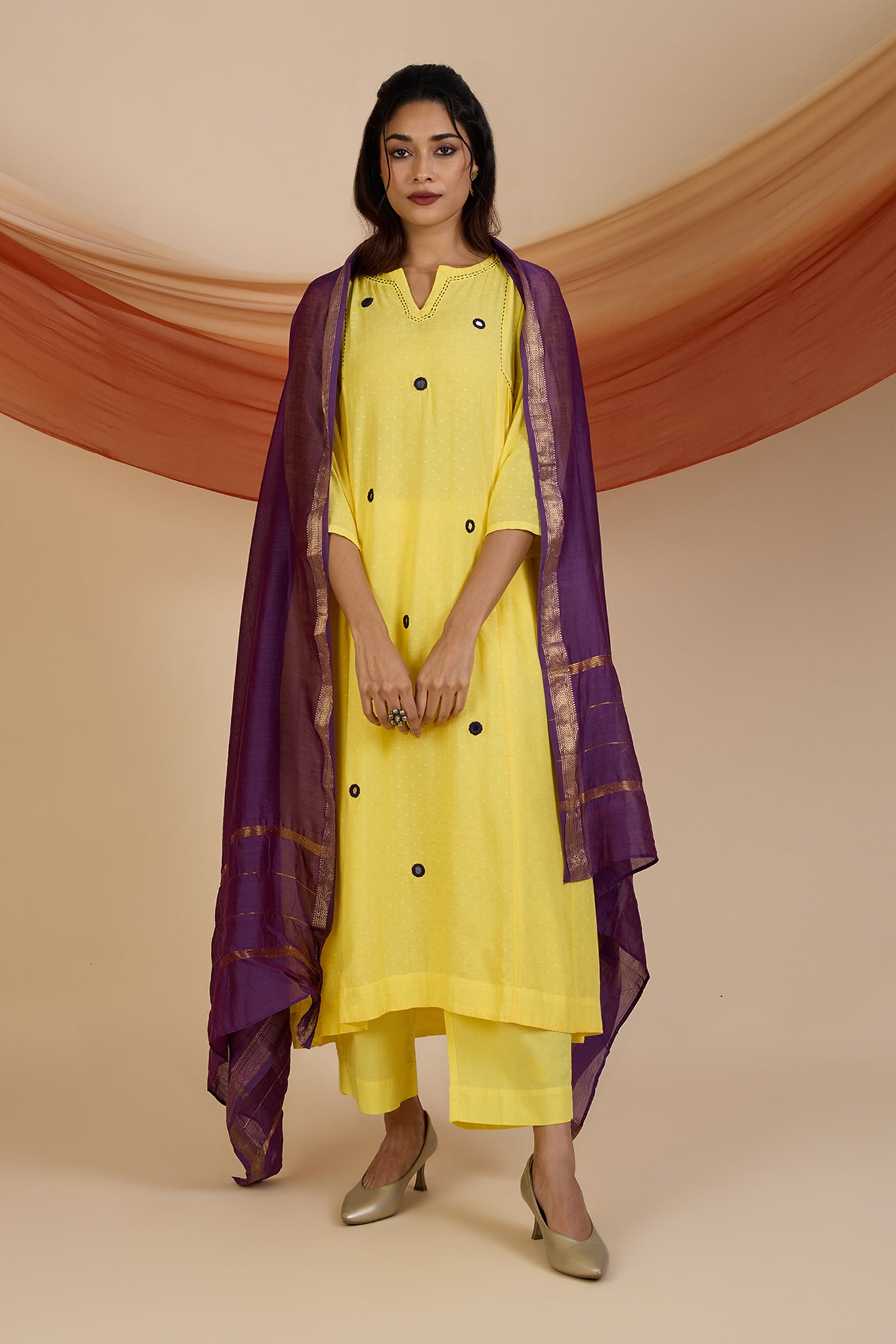 Introducing our captivating mellow yellow a-line kurta with side gathers, a modern interpretation of timeless elegance. Adorned with a charming neckline and intricate gather detail on the placket, it exudes sophistication. Accentuated by delicate hand mirrorwork embroidery in hues of purple , this ensemble emanates understated glamour. Pair it with monotone trousers, available separately, for a bold yet refined look. Elevate your ensemble with a stunning maheshwari purple dupatta, perfect for summery brunches or family gatherings. Crafted from soft modal, adorned with delicate work, it's gentle on the skin and boasts summery green hues. Inspired by modern Mughal aesthetics, this Anarkali embodies timeless elegance with a contemporary twist.