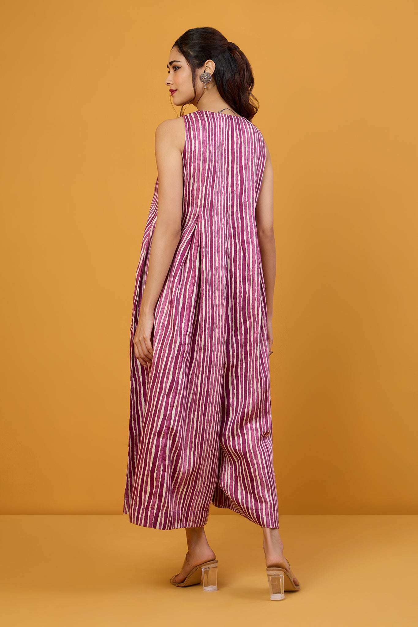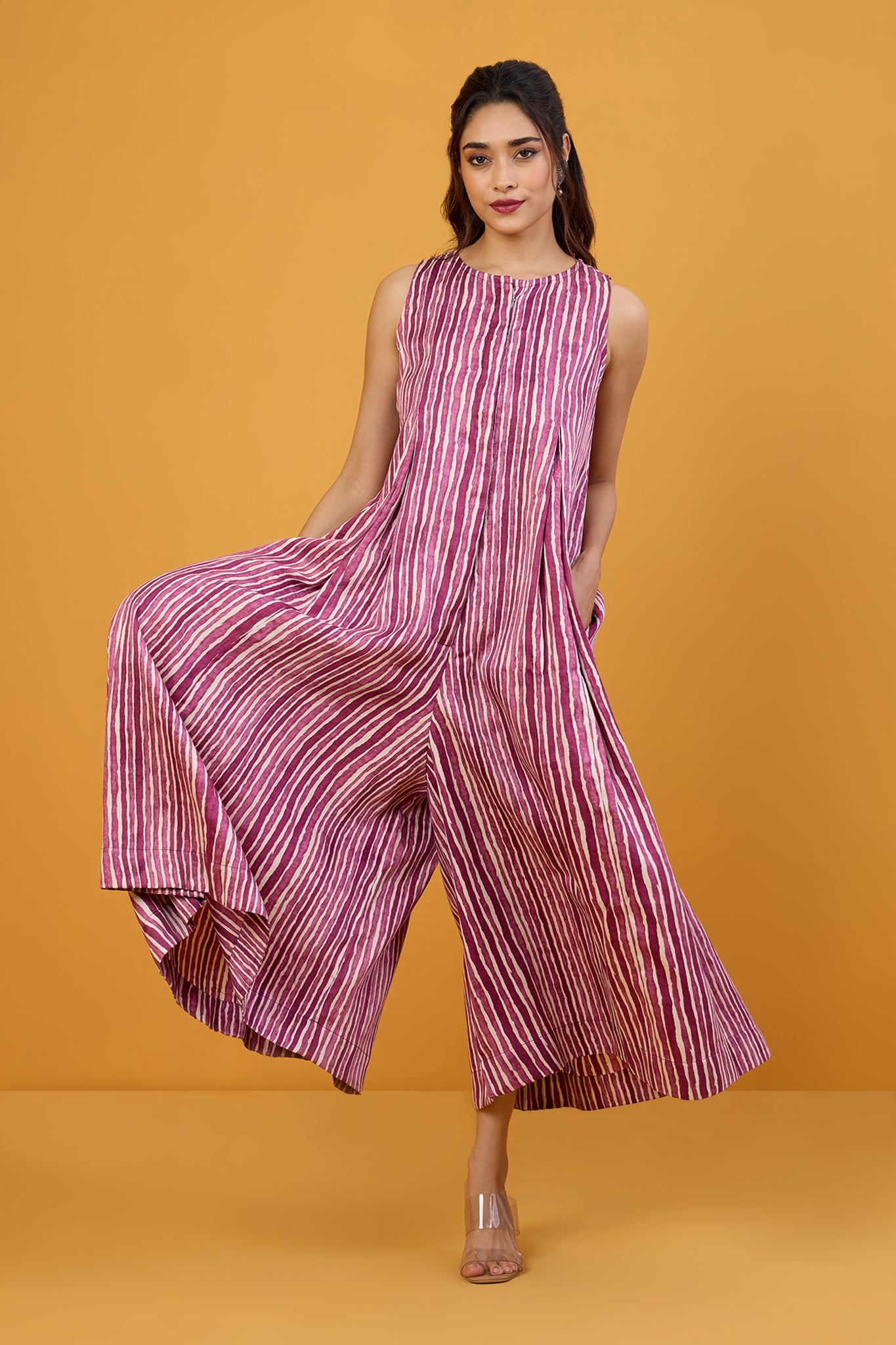 Introducing our chic Magenta Stripes Jumpsuit, a must-have for effortless year round style. Crafted in vivid hues, it features button down placket in front, bold stripes creating a striking contrast that's sure to turn heads. The flared silhouette offers a flattering fit, while the soft cotton satin ensures comfort all day long. Whether you're strolling along the beach or attending a summer soirée, this jumpsuit is both stylish and comfortable. Handcrafted with care, it exudes quality and attention to detail. Elevate your wardrobe with this breezy and versatile piece, perfect for any occasion.