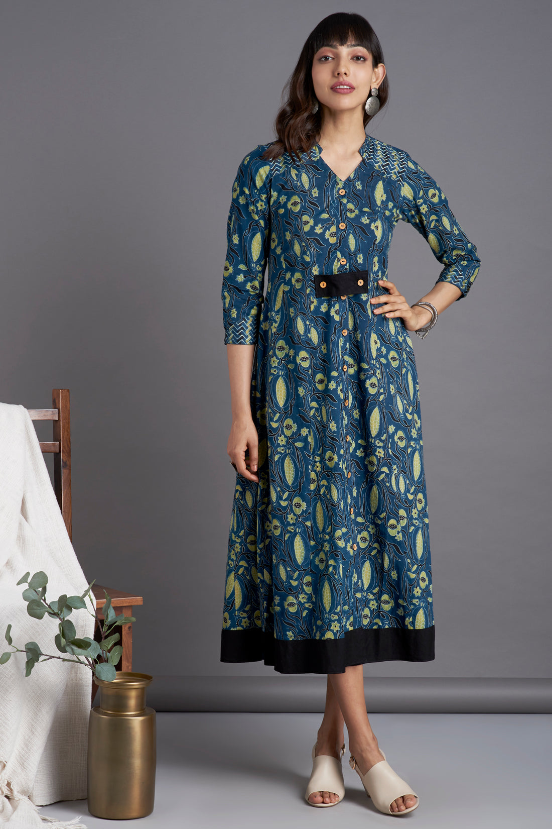 long button down dress - marine blue & pomegranate motifs