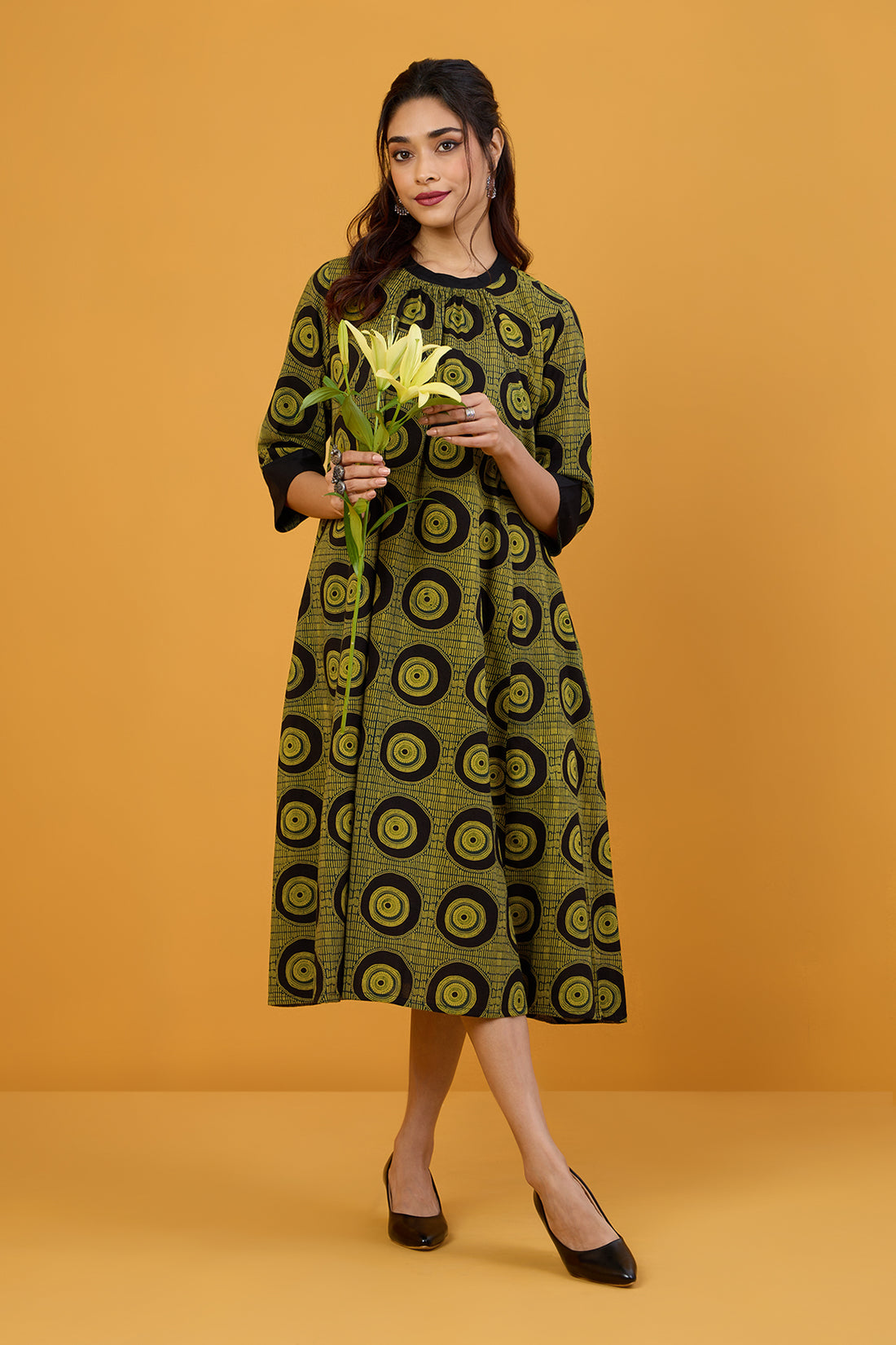 Obsidian Goldleaf Crew Neck A Line Gather Dress