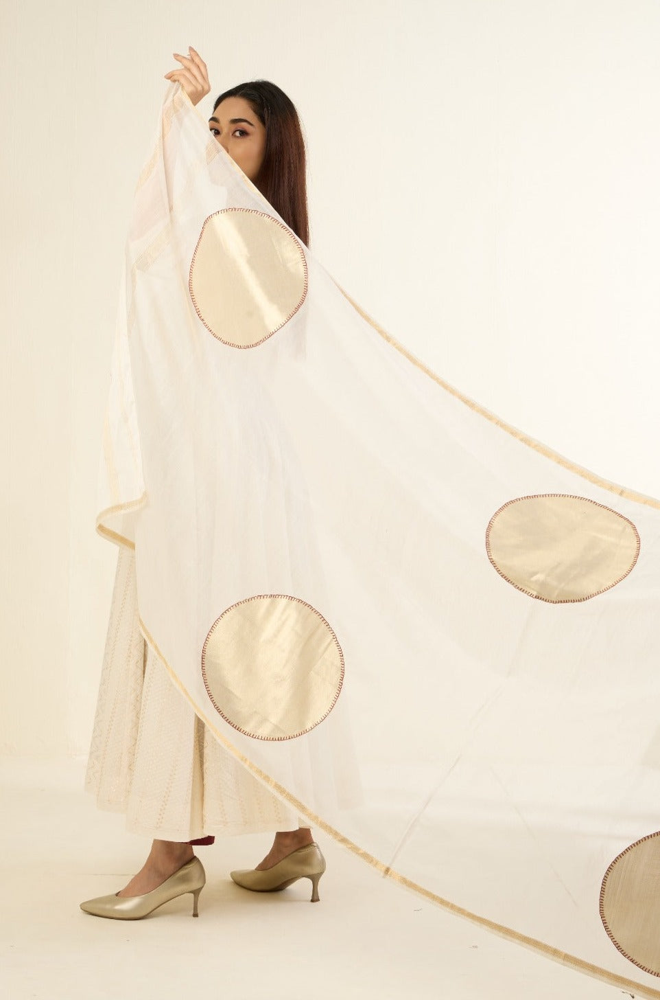 maati brings a curated collection of maheshwari dupattas! appliqe work in gold tissue fabric: handloom maheshwari length: 2.5...