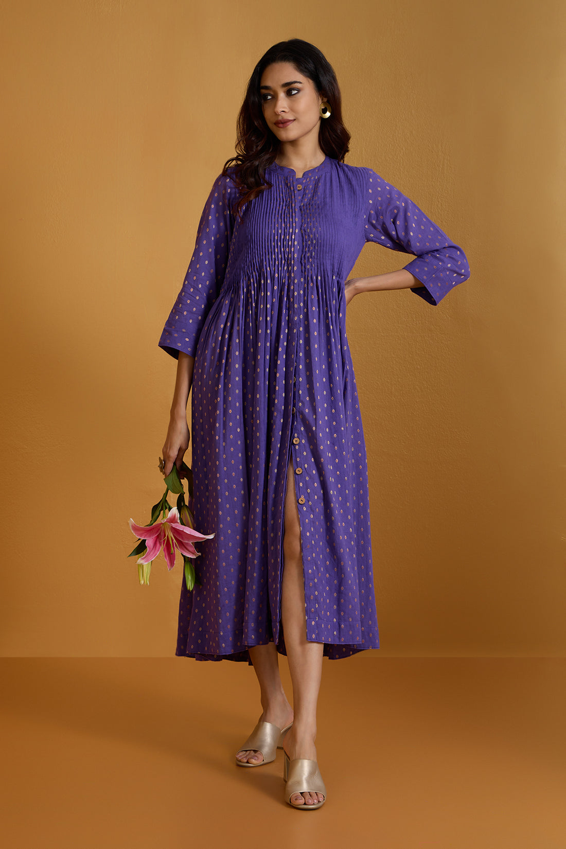 Amethyst Gleam Pleated Pintuck Button Down Dress