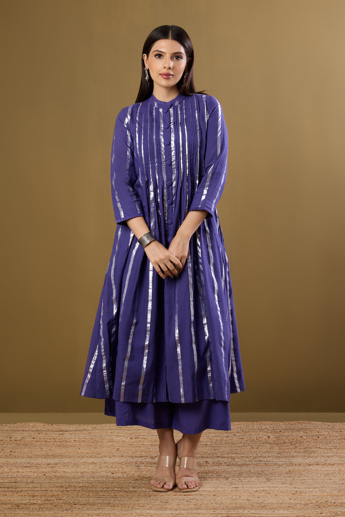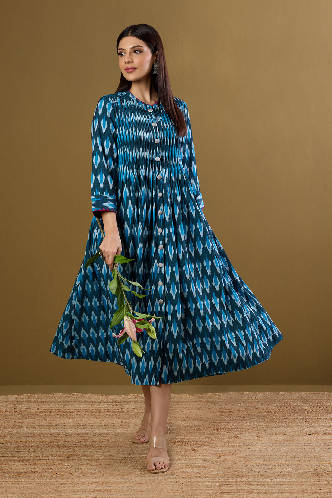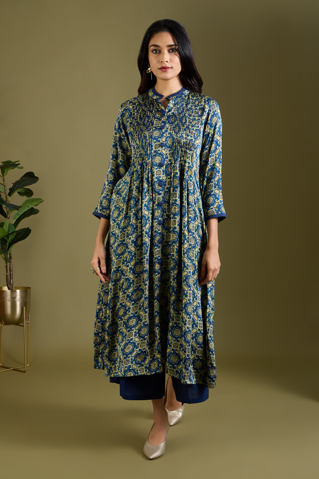 Luxe Indigo Twilight & Golden Aura Pleated Neck Modal Silk Pintuck Dress