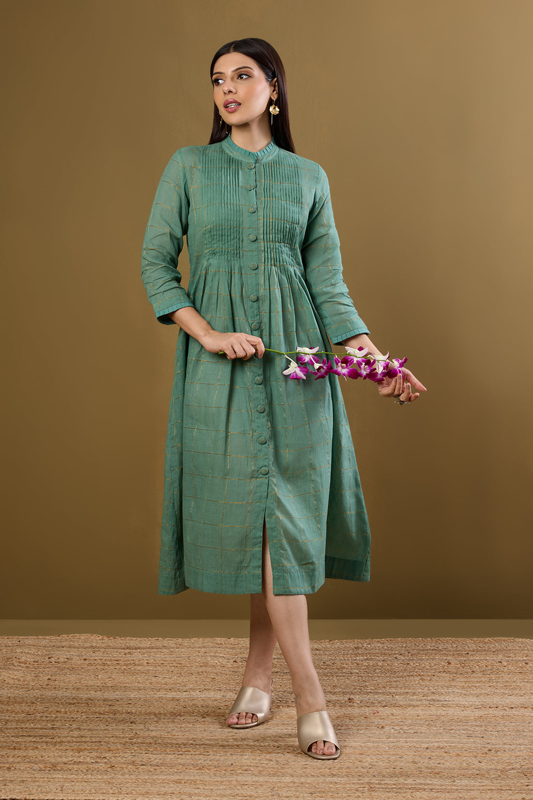 Bronze Gridsong Checkered Pleated Pintuck Button Down Dress