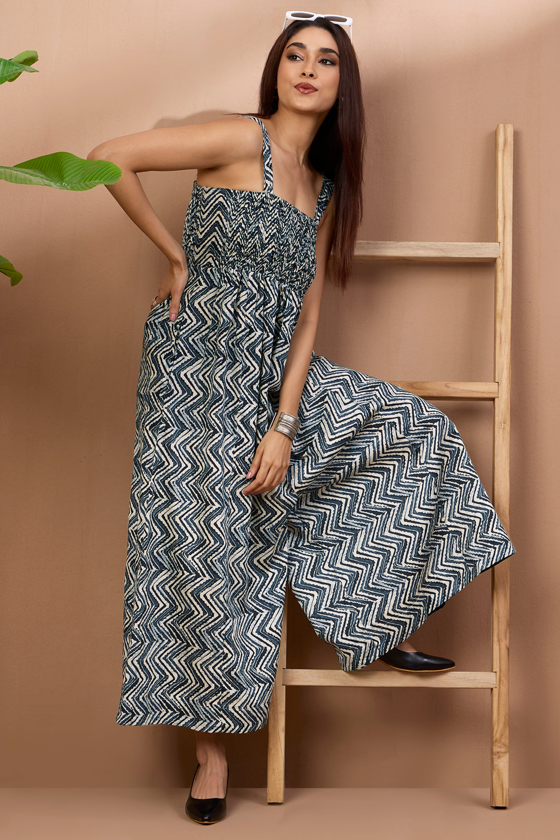 Silver Chevron Satin Cotton Strap Jumpsuit with Pockets