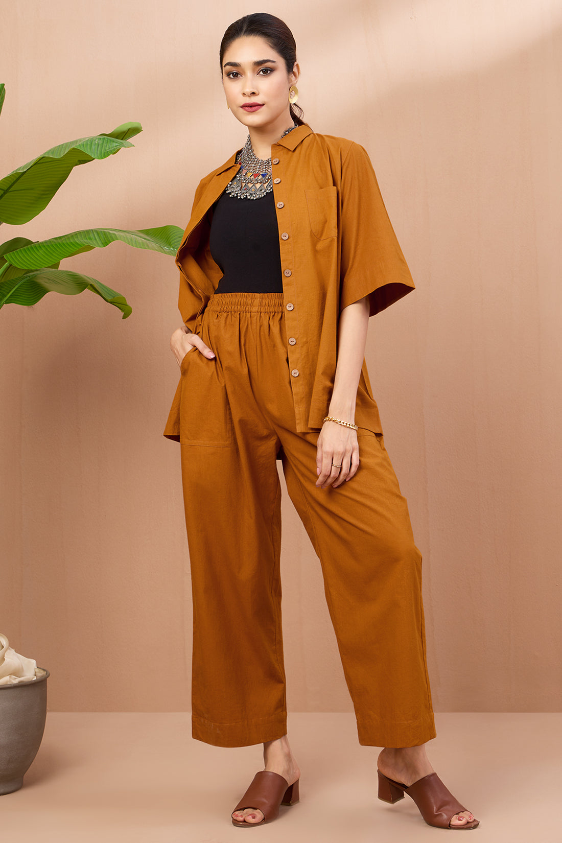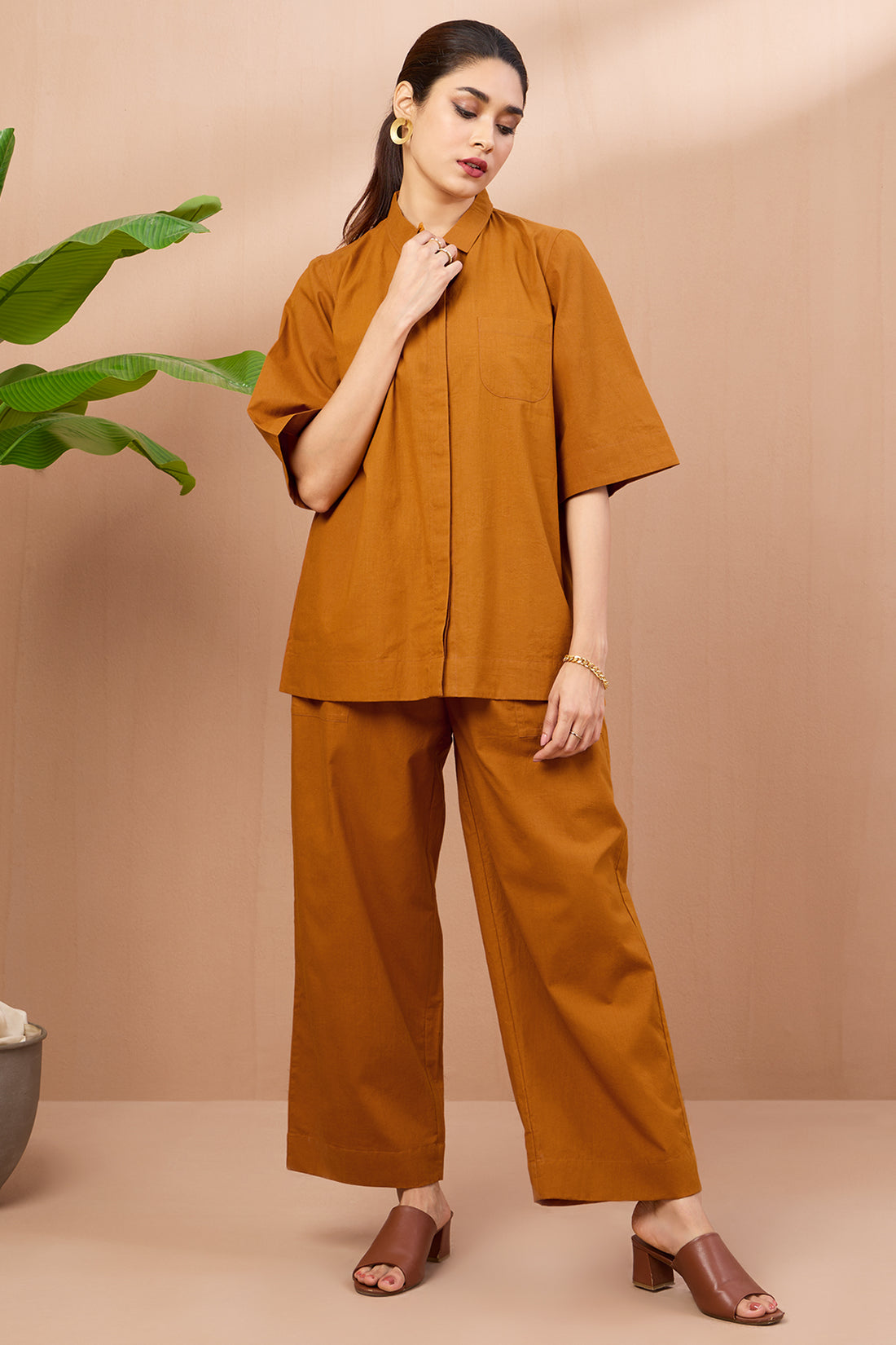 co-ord button down rust round collar kurta set golden rust flecks